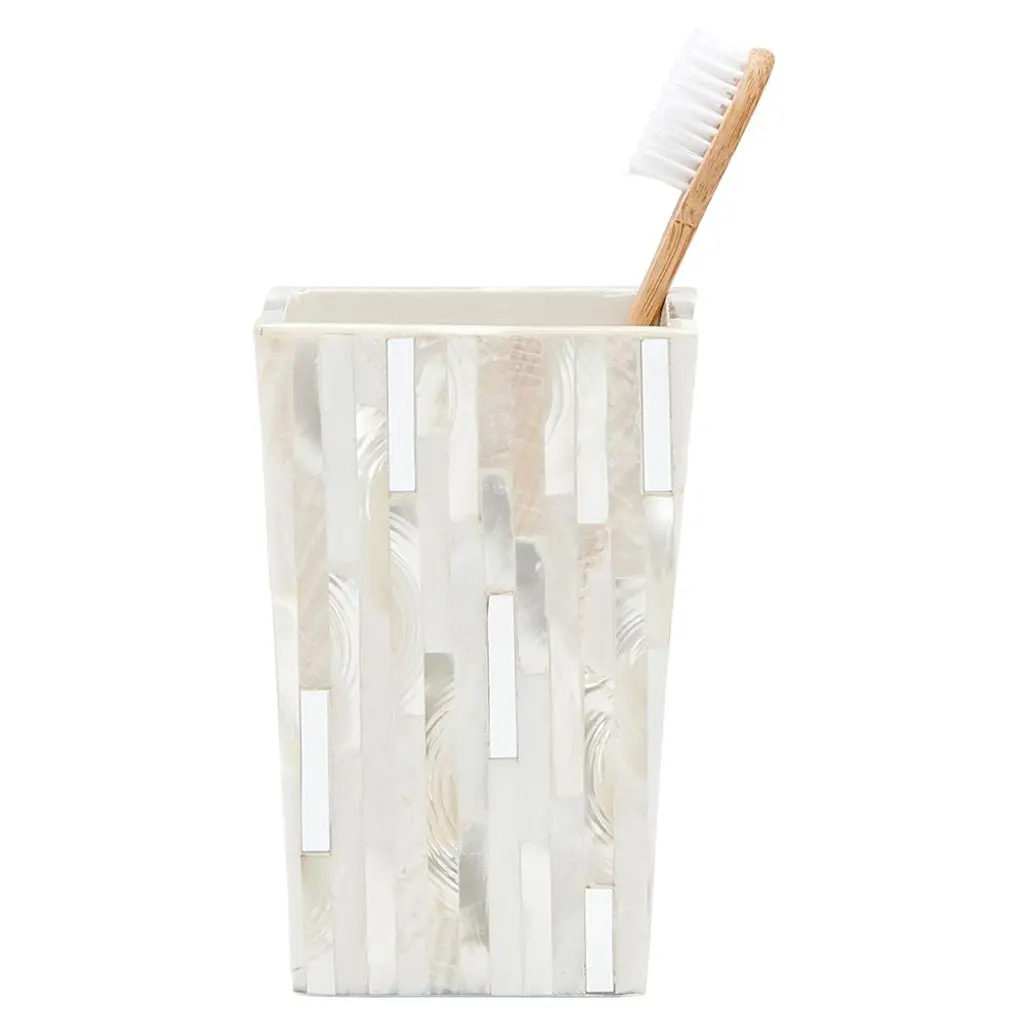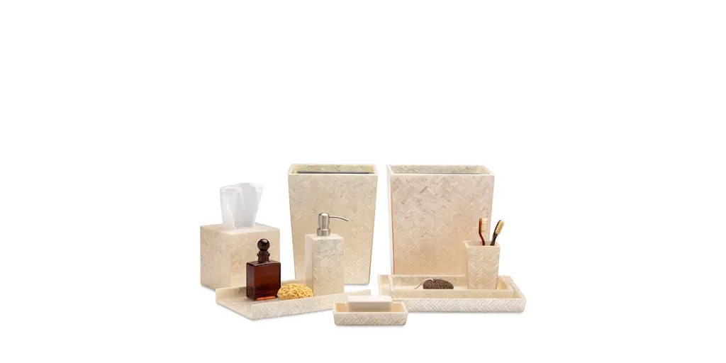 The subtle shimmer of capiz shell set in a classic herringbone pattern lends a touch of glamour to the Pigeon & Poodle Handa bath accessories collection.