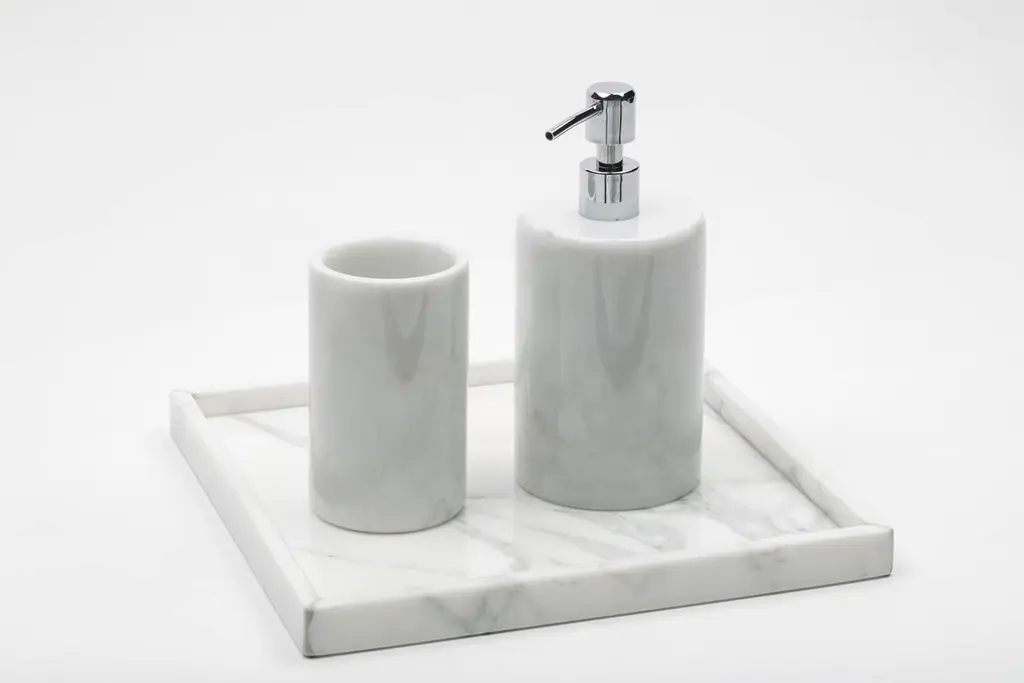 A rounded shape toothbrush holder in white Carrara marble.Each piece is in a way unique (since each marble block is different in veins and shades) and handcrafted in Italy. Slight variations in shape, color and size are to be considered a guarantee of an handcrafted creation. This object gives a distinct and elegant touch to your bathroom.