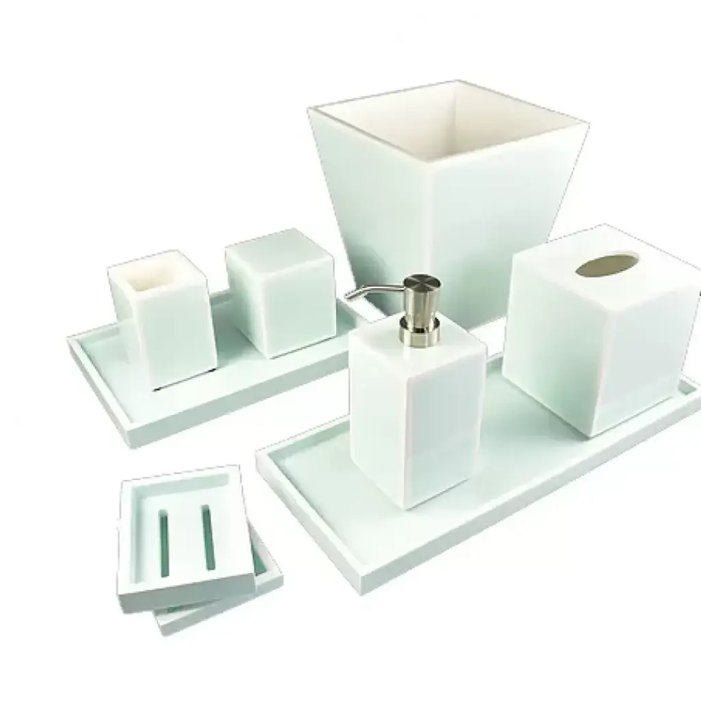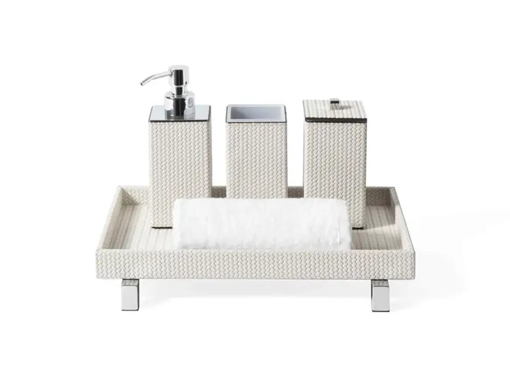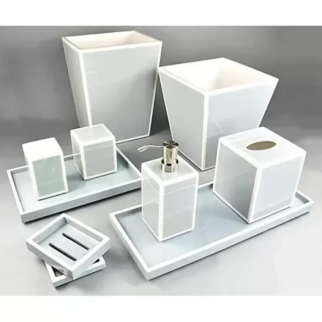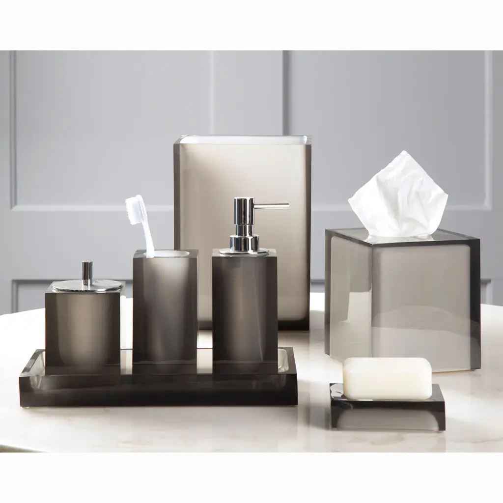 Luxe-y Loo.Thick, acrylic bathroom essentials with complementary frosted lozenge interiors. Woo your loo with luxe accessories fit for a film star.Our Hollywood Bath Set includes one wastebasket, one tissue box, one soap dispenser, one toothbrush holder, one canister, one tray, and one soap dish.Bundles are not eligible for additional discounts. Item #29732