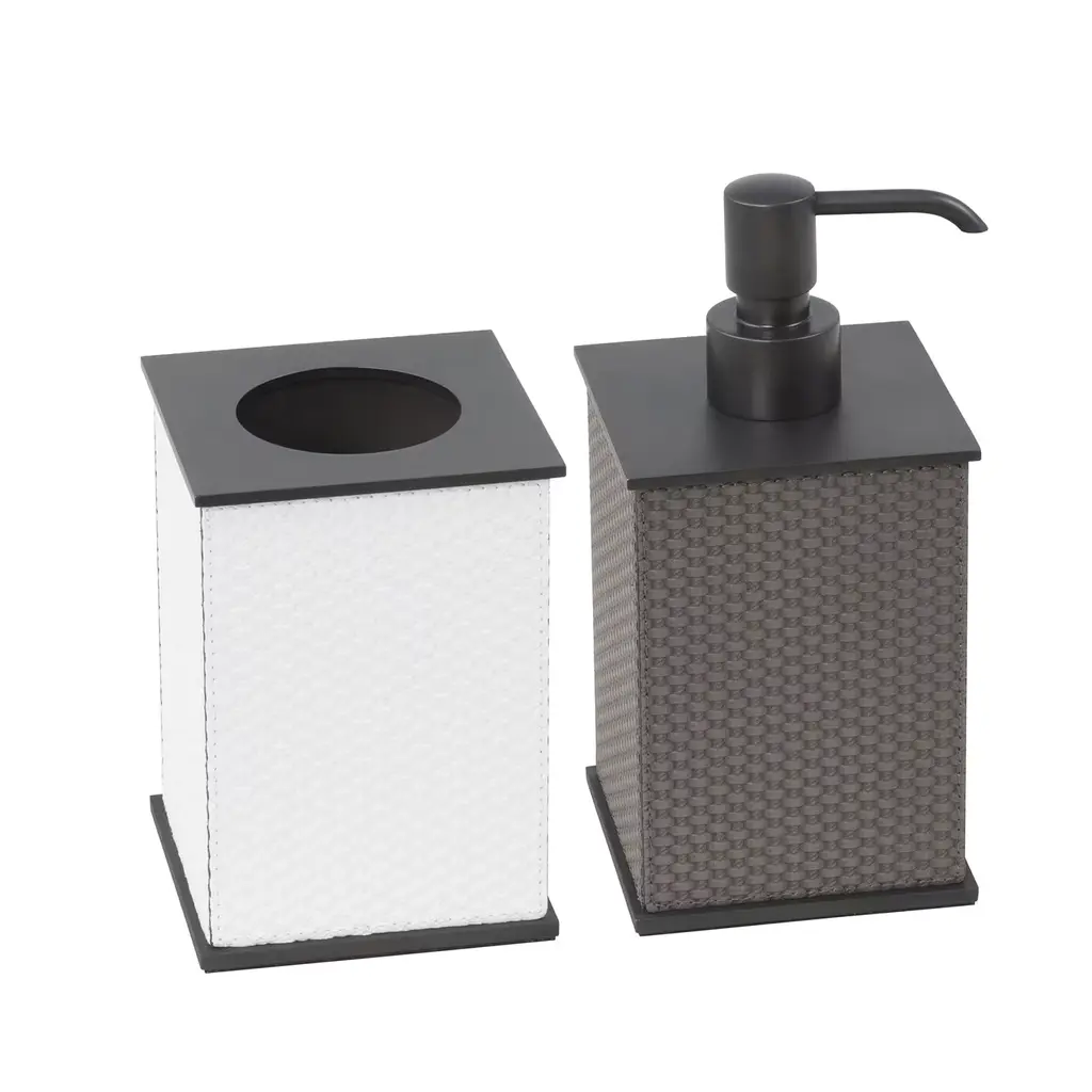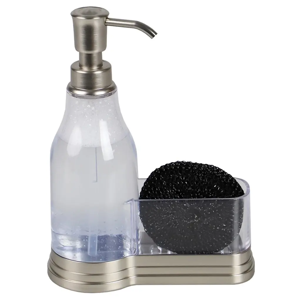 Transform restroom countertops with the Home Basics Soap Dispenser with Basketweave Sponge Holder, a Black masterpiece that seamlessly blends functionality with refined elegance. This 18.6-ounce dispenser, boasting a rich, antique Black finish, adds a touch of warm sophistication to any space. Engineered to dispense precise, controlled portions of liquid soap, it also features an integrated, intricately designed basketweave sponge holder, ensuring cleaning essentials are neatly organized and readily accessible. Simplify handwashing routines and elevate your restroom decor with this practical and stylish dispenser, designed to complement a wide range of interior aesthetics.Key Features:Specs: