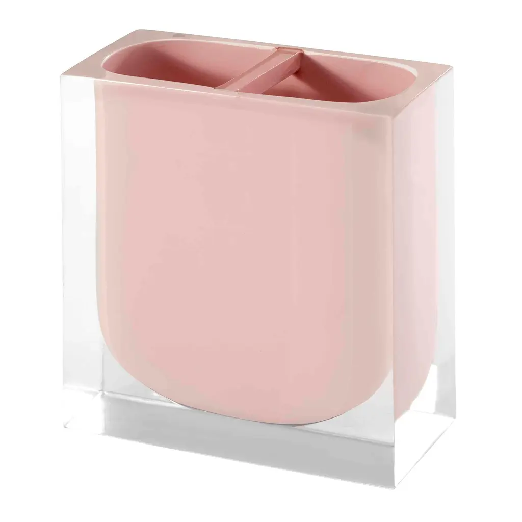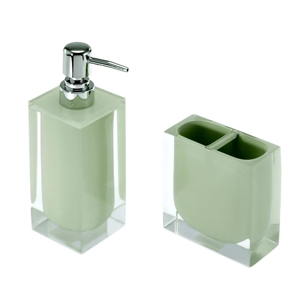 The Izod Marina Green 2-Piece Toothbrush Holder (1) and Soap/ Lotion Dispenser (1) Set features a clear resin exterior that shows off the sage green interior for a sleek, modern look. Adds an updated look to your bathroom, kitchen or home office. Made of durable resin for easy care and long life.