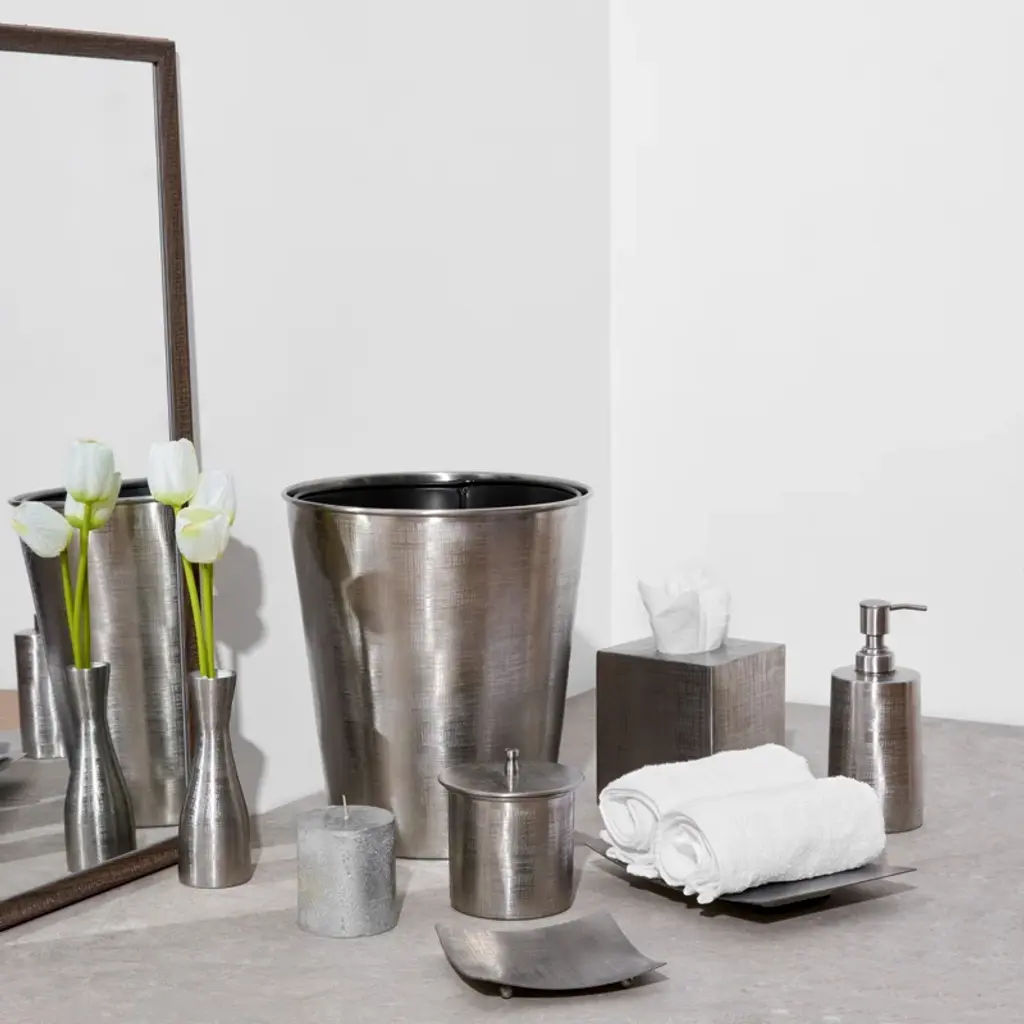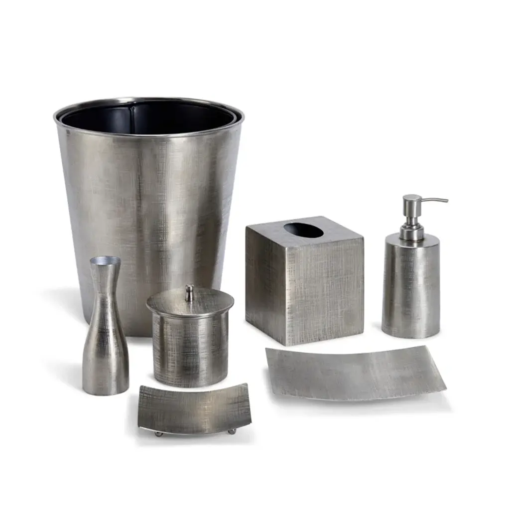 Our signature bathroom set in Stainless Steel and our patented jacquard pattern. Originally designed in gold finish for the Four Seasons Resort in Dubai. Each piece radiates a cool, silver glow, its surface catching the light to reveal a subtle, textured finish reminiscent of a jacquard weave. Part of a full set