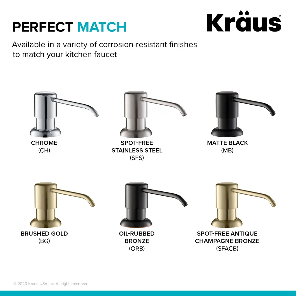 This easy-push self-priming solid metal soap dispenser is the perfect complement for your kitchen faucet. The large-capacity bottle holds your choice of liquid soap, lotion, or hand sanitizer, and refills from above the counter for maximum convenience. A threaded connection makes installation easy, with a tight waterproof seal to protect against leaks. The heavy-duty pump rotates 360 degrees so you can position the nozzle anywhere you need it. The universal design complements any decor style and coordinates with all Kraus kitchen faucets. Customize the look with your choice of flawless rust-resistant finishes.From the ManufacturerWith a long history of manufacturing exceptional kitchen and bathroom products, we at KRAUS believe in the power of design to transform ordinary environments into beautiful spaces. Our goal is to deliver the highest value possible for our customers, providing innovative fixtures at approachable prices. We want to empower consumers, allowing them to transform their homes with intuitive designs and easy-to install products that are built for a lifetime of use. We strive to continuously raise the bar in terms of quality, function, and design. Transform your kitchen and bath with KRAUS, and experience Innovation for Real Life.Kraus KSD-53 Features:Kraus KSD-53 Specifications: