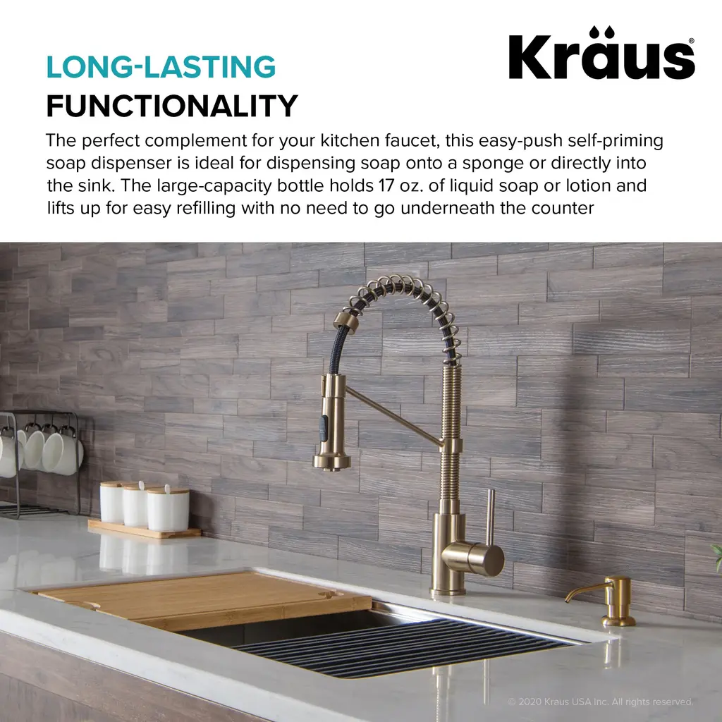 This easy-push self-priming solid metal soap dispenser is the perfect complement for your kitchen faucet. The large-capacity bottle holds your choice of liquid soap, lotion, or hand sanitizer, and refills from above the counter for maximum convenience. A threaded connection makes installation easy, with a tight waterproof seal to protect against leaks. The heavy-duty pump rotates 360 degrees so you can position the nozzle anywhere you need it. The universal design complements any decor style and coordinates with all Kraus kitchen faucets. Customize the look with your choice of flawless rust-resistant finishes.From the ManufacturerWith a long history of manufacturing exceptional kitchen and bathroom products, we at KRAUS believe in the power of design to transform ordinary environments into beautiful spaces. Our goal is to deliver the highest value possible for our customers, providing innovative fixtures at approachable prices. We want to empower consumers, allowing them to transform their homes with intuitive designs and easy-to install products that are built for a lifetime of use. We strive to continuously raise the bar in terms of quality, function, and design. Transform your kitchen and bath with KRAUS, and experience Innovation for Real Life.Kraus KSD-53 Features:Kraus KSD-53 Specifications: