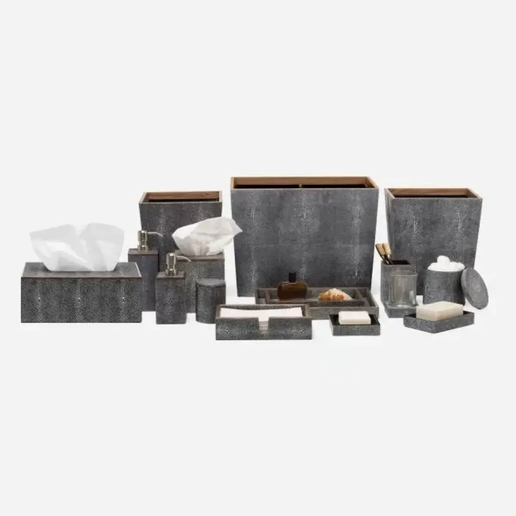 Up a bath’s elegance and add an aesthetic edge with our striking realistic faux shagreen Manchester set. Each piece is crafted to highlight the natural “eye” pattern inspired by authentic shagreen, and topped with a veneer trim. The designers at Pigeon & Poodle believe the details of a home are just as important as the furniture. A gorgeous toothbrush holder or handcrafted canister can elevate an entire bath, the perfect frame can heighten the feel of a whole space, and a good-looking storage basket can be your look’s missing link. With thoughtful design and top-notch craftsmanship, Pigeon & Poodle create home accessories with the care and attention typically reserved for larger pieces of décor.