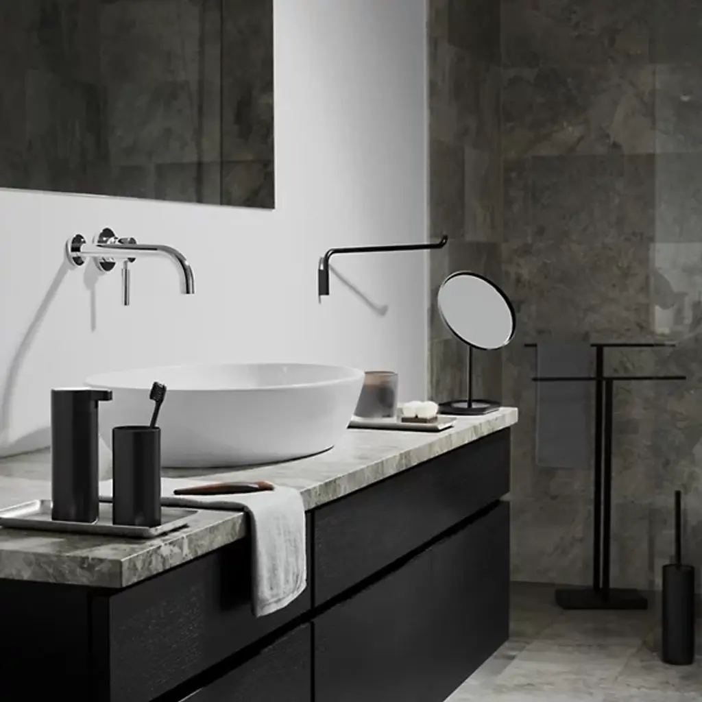 Unroll in style with the smoothly unobtrusive MODO Wall Mounted Toilet Paper Holder from Blomus. A rotating hook of titanium-coated steel made especially for standard-sized toilet paper rolls hangs directly downward from a minimalist bracket mount, surface gleaming with reflected light from its surroundings. This low-profile piece arrives with included mounting hardware to make installation even easier.