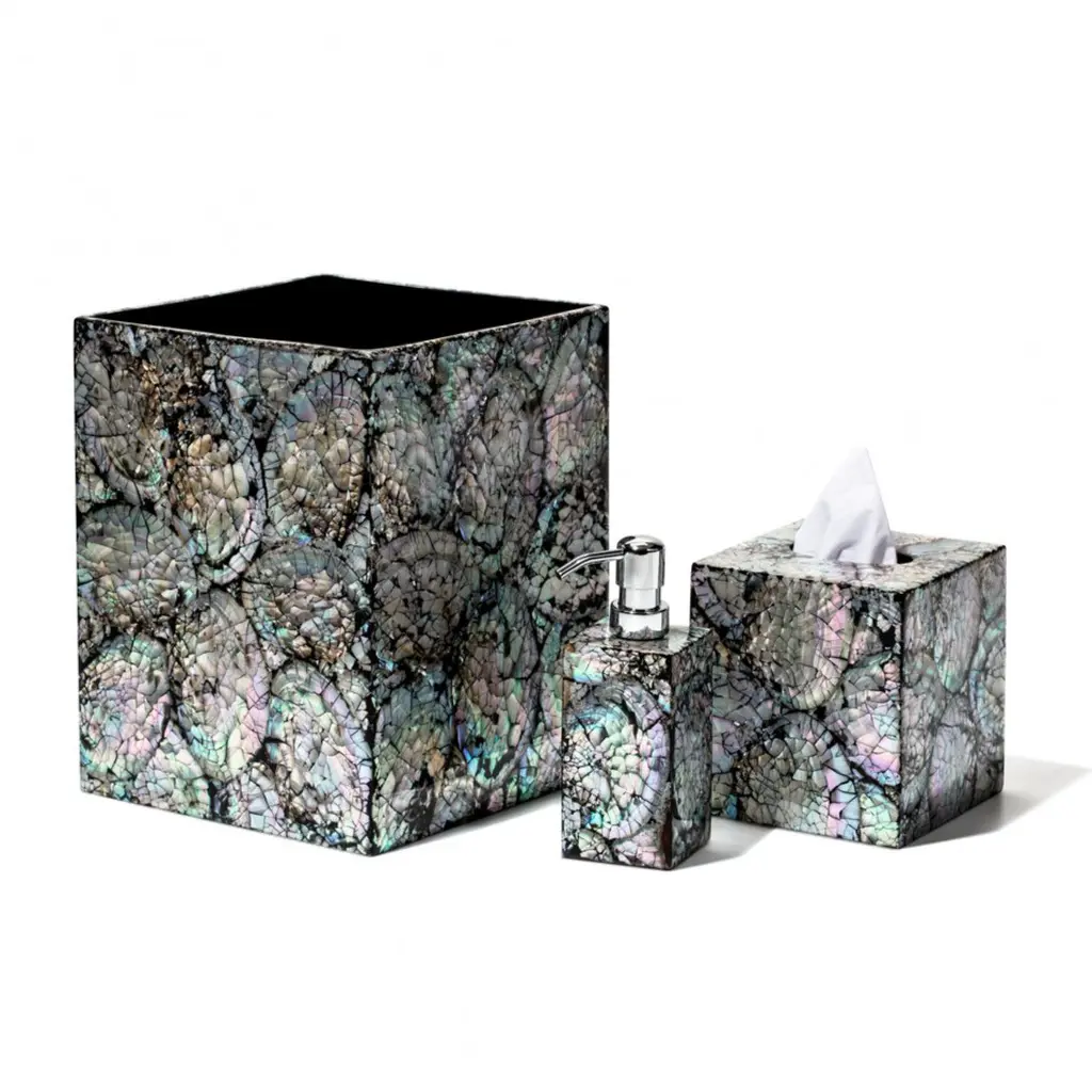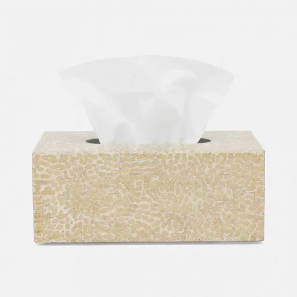 - Handcrafted tissue box cover made of wood and mother of pearl shells from Colombia. - The iridescent shimmer of mother of pearl is further accentuated by a high-gloss lacquer finish on a black contrast backdrop.