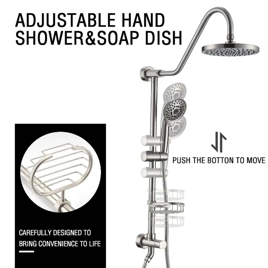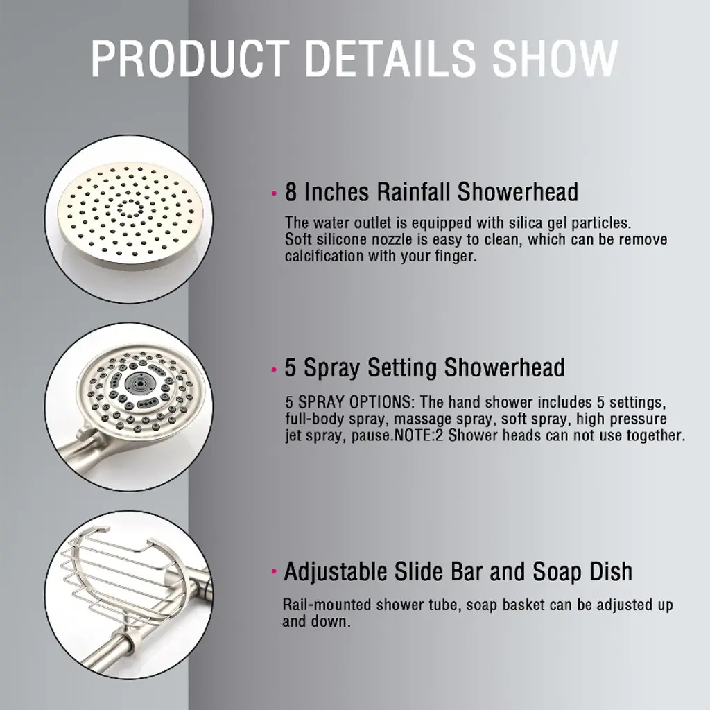 Proox 5-spray 8 In. Antique Style Round Shower System Kit With Hand Shower And Adjustable Slide Bar Soap Dish In Brushed Nickel