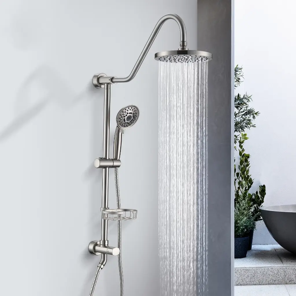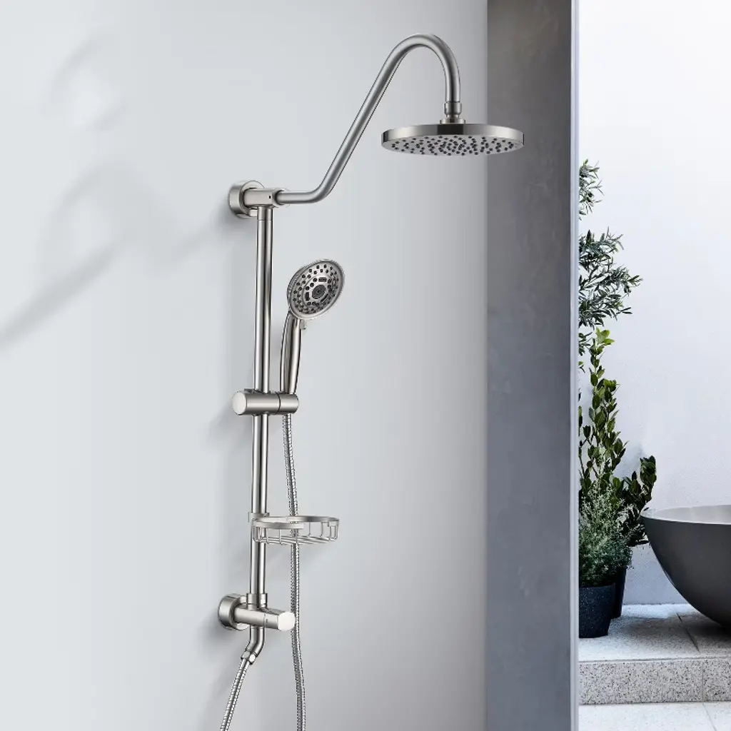 Upgrade an existing wall shower with the stainless steel Proox Shower System with Hand Shower. This convenient retrofit shower set includes 2-showering options: a hand shower with a height-adjustable holder and an overhead rainfall shower head. A diverter mounted on the riser allows you to easily switch between the two. This system is designed for use with an existing shower mixing valve (Package Not Includes The Rough-in Valve).