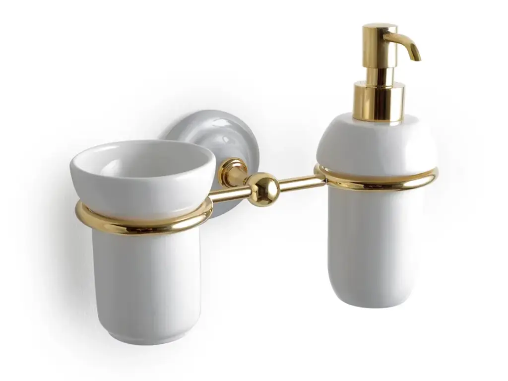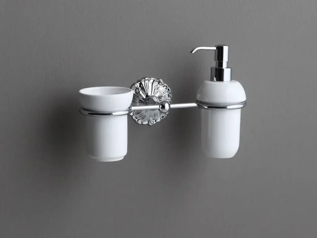 Wall-mounted ceramic Bathroom soap dispenser.Collection of accessories in the Romantic style. Varied choice of accessories for standing or wall mounting. The Romantic series consists of numerous products including soap dishes, dispensers, toothbrush holders, towel rails, etc. Numerous finishes available for the metal parts, and a dozen colours available for the ceramic part!