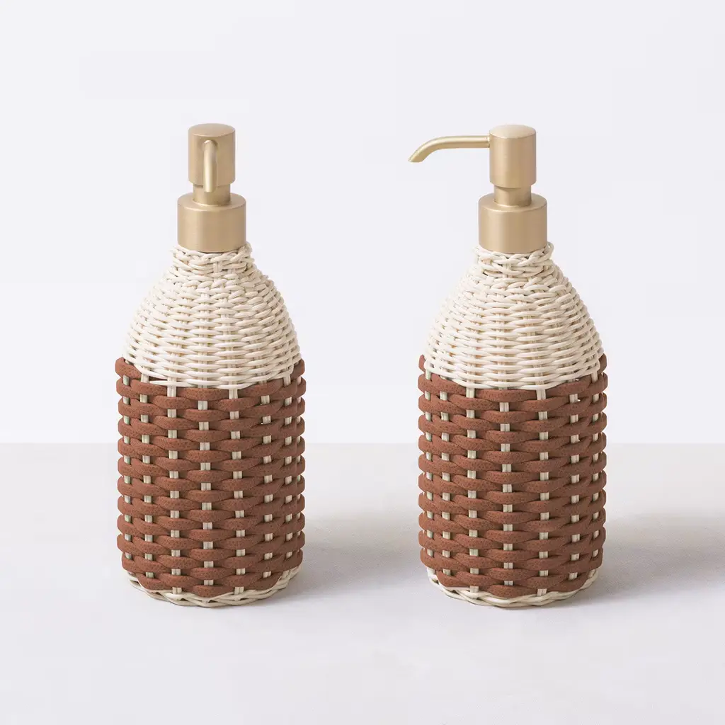 An elegant and versatile addition to even the smallest bathroom of a private home, hotel, shop or office, this stunning soap dispenser combines practicality and refined craftsmanship in a simple yet fascinating design. Holding up to 500ml, it comprises a glass bottle furnished with a metal spout enhanced with burnished brass finish, and partially covered with a refined hand-woven upholstery combining natural rattan and brown Napa leather. Other finishes are available, please consult the Concierge.