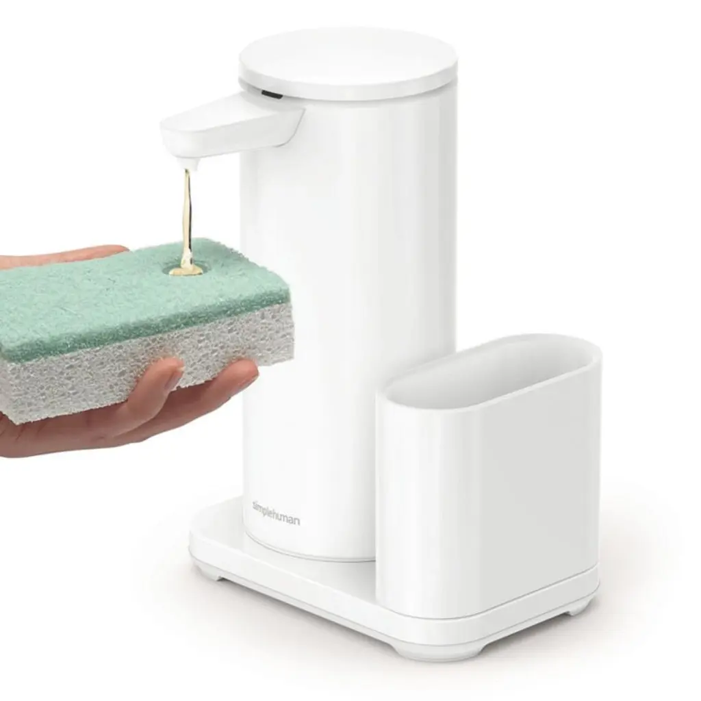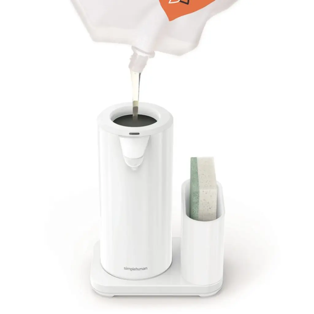Simplehuman 14oz Sensor Pump, Touch-Free Hand Soap Dispenser With Sponge Caddy, White Steel
