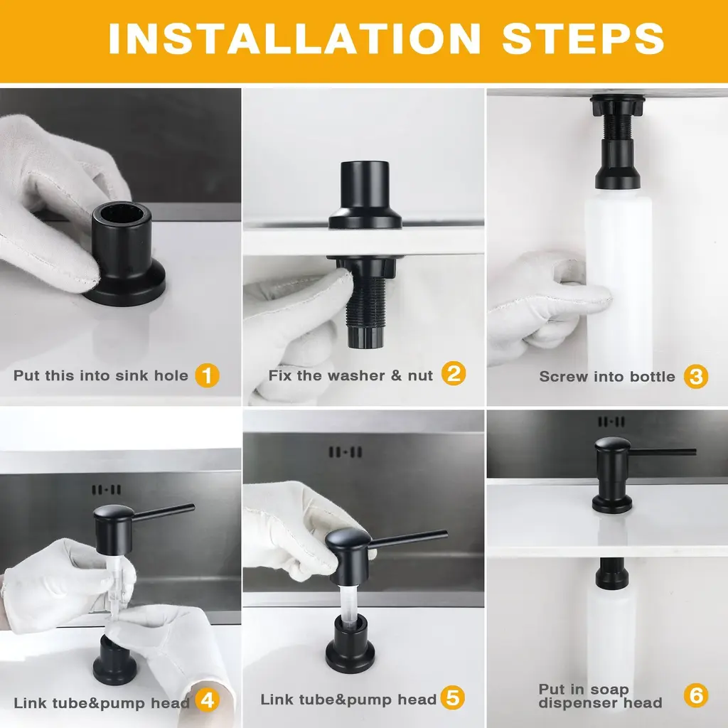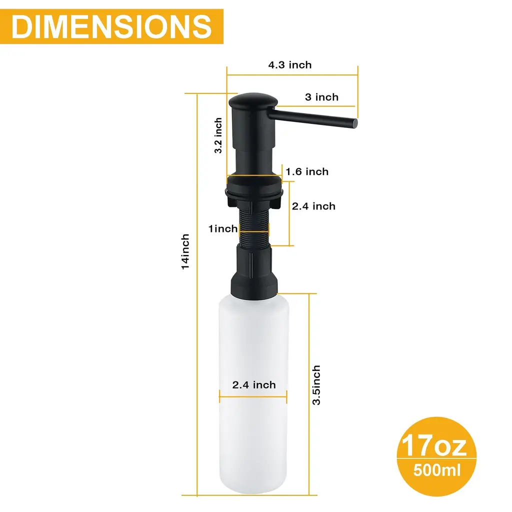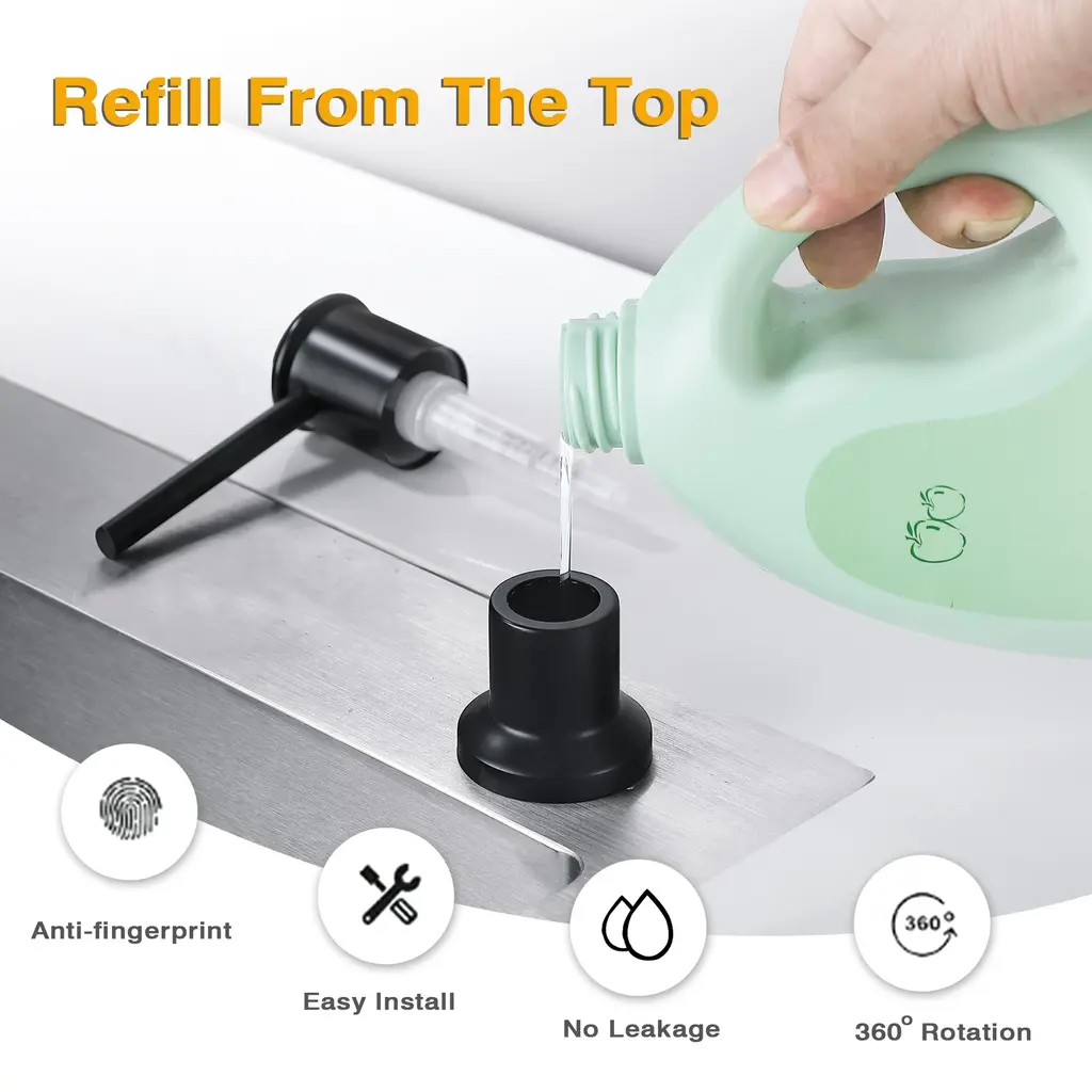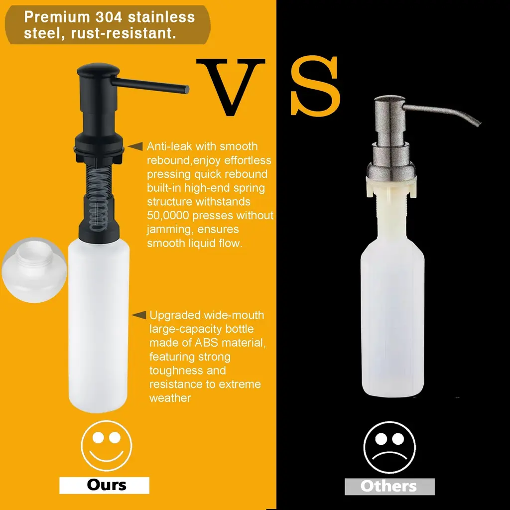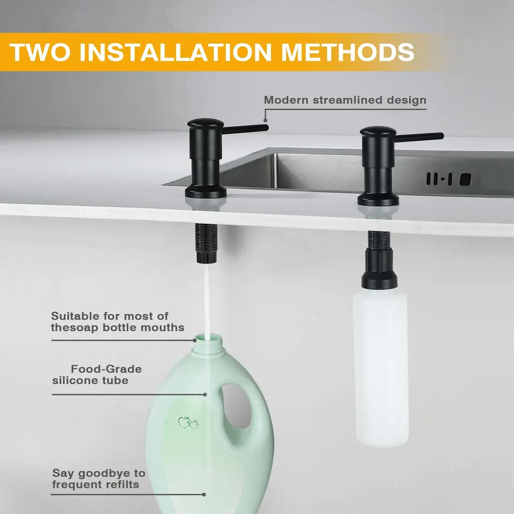 This premium soap dispenser features a durable pump with a brushed nickel finish, offering smooth, leak-proof dispensing and lasting up to 50,000 presses. The reinforced ABS and PE plastic bottle is large-capacity and designed to withstand extreme temperatures without becoming brittle. Easy to install and maintain, it complements any kitchen or bathroom decor with its sleek, rust-resistant design.