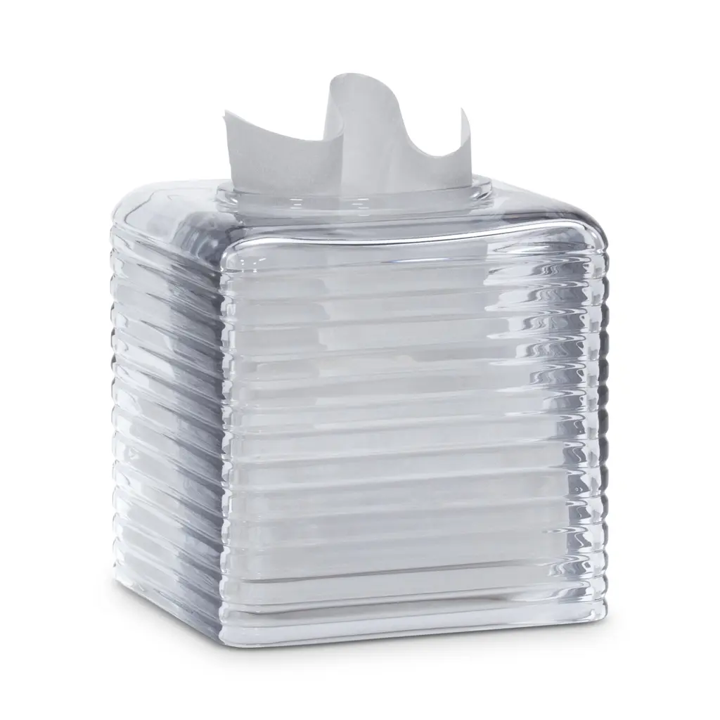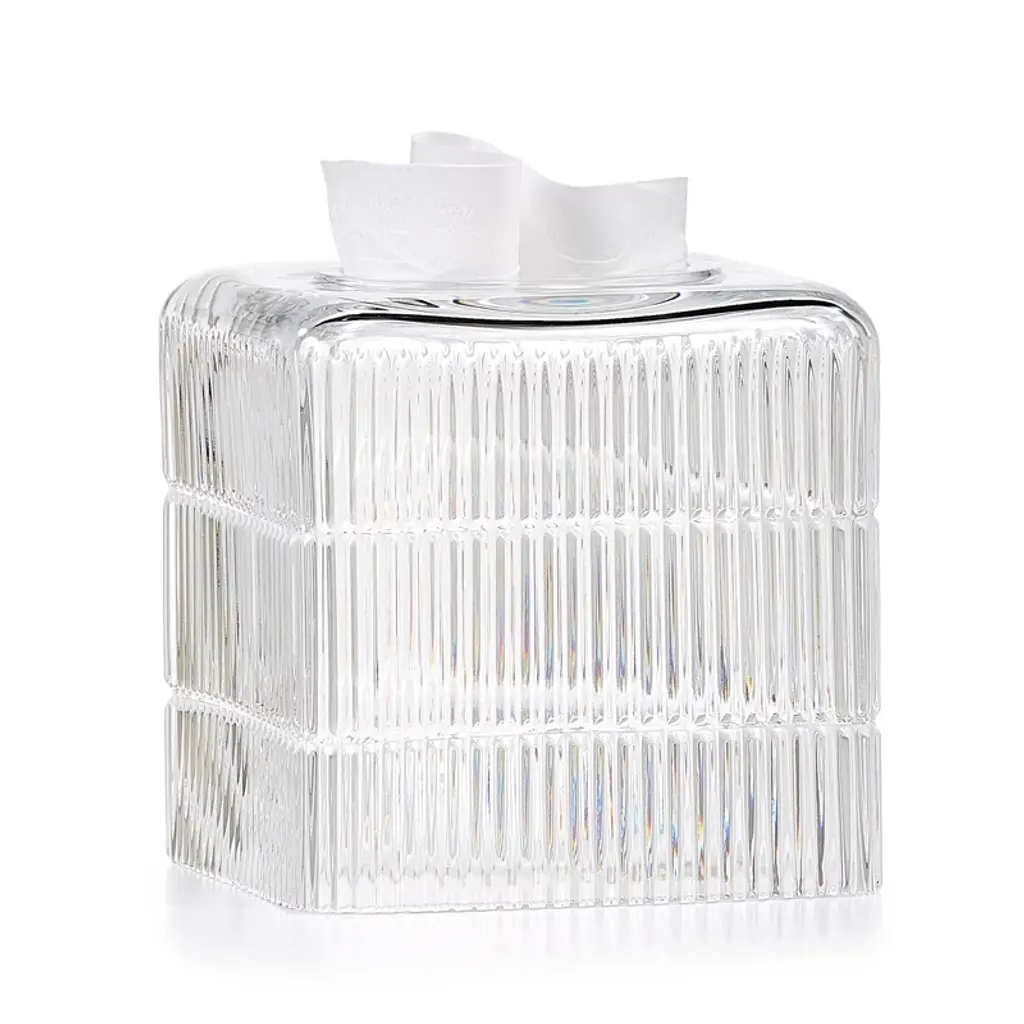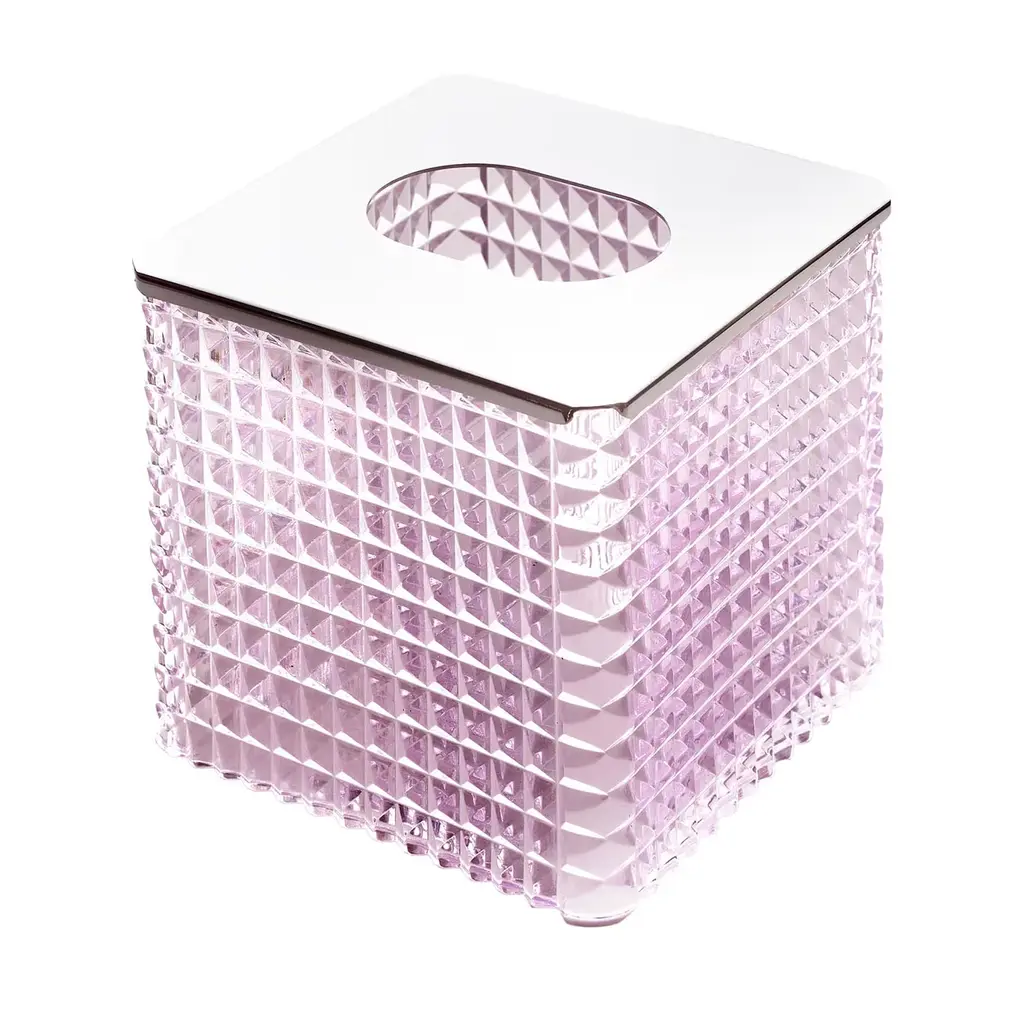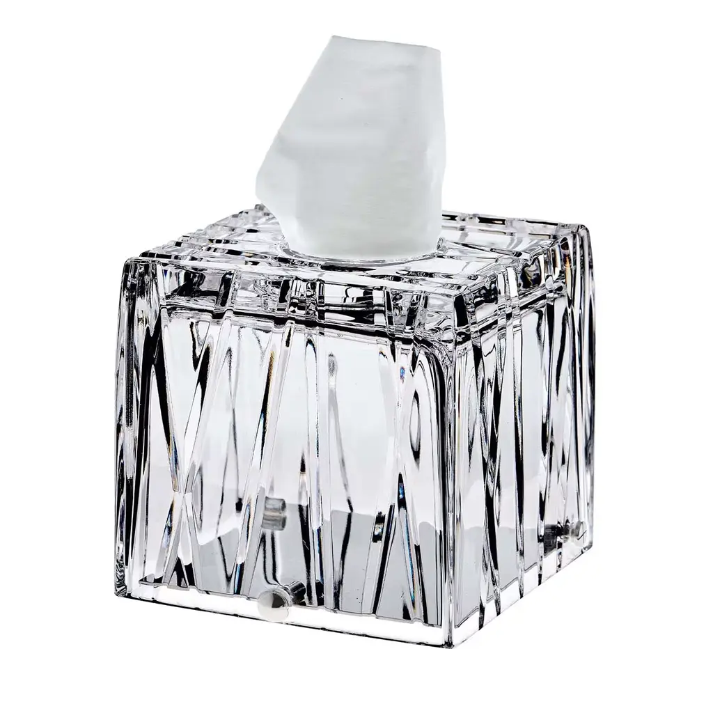 An exclusive piece that will shine on a modern vanity or console bathroom sink, this precious tissue holder fashioned from thick crystal belongs to the Skyline Collection. The intricate pattern of intersecting grooves extending throughout the exterior not only increases its brilliance but also optimizes the comfort of the grip. A more compact, square-based version is also available, please ask the Concierge for details.