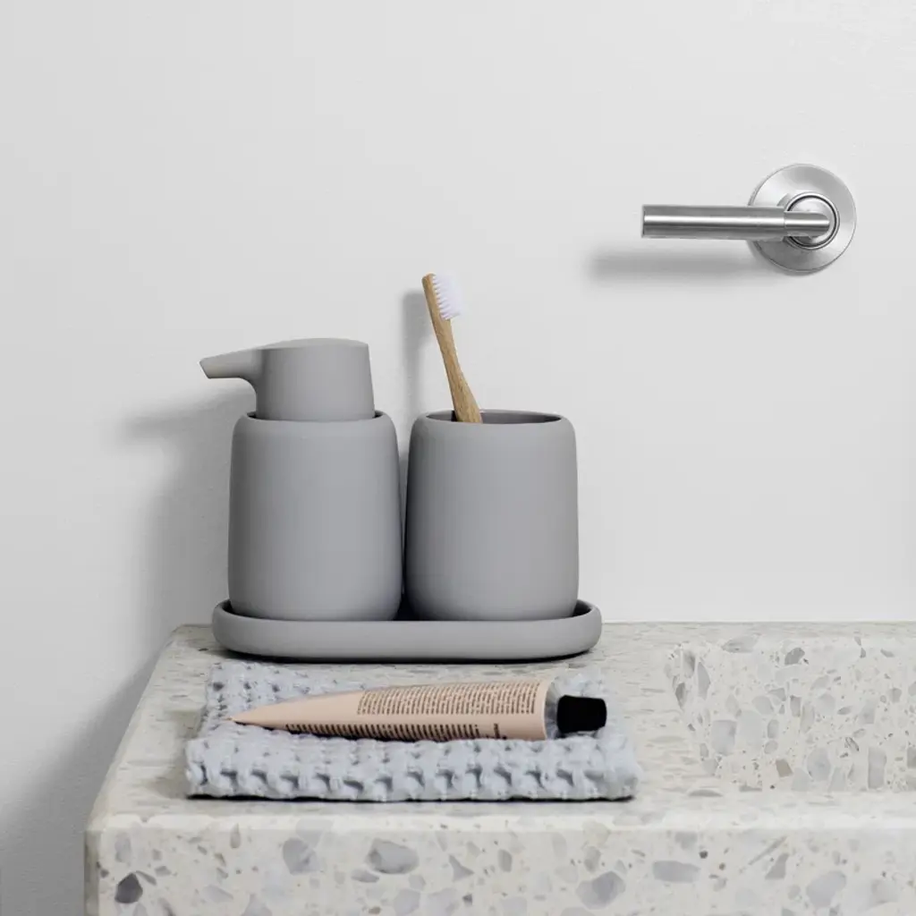 Superior suds. This refillable dispenser replaces single-use plastic soap bottles, and its softly rounded lines bring a calming, minimal look to your bathroom counter. It’s crafted from mildew-resistant ceramic with a silky matte finish that’s available in a range of neutral hues.