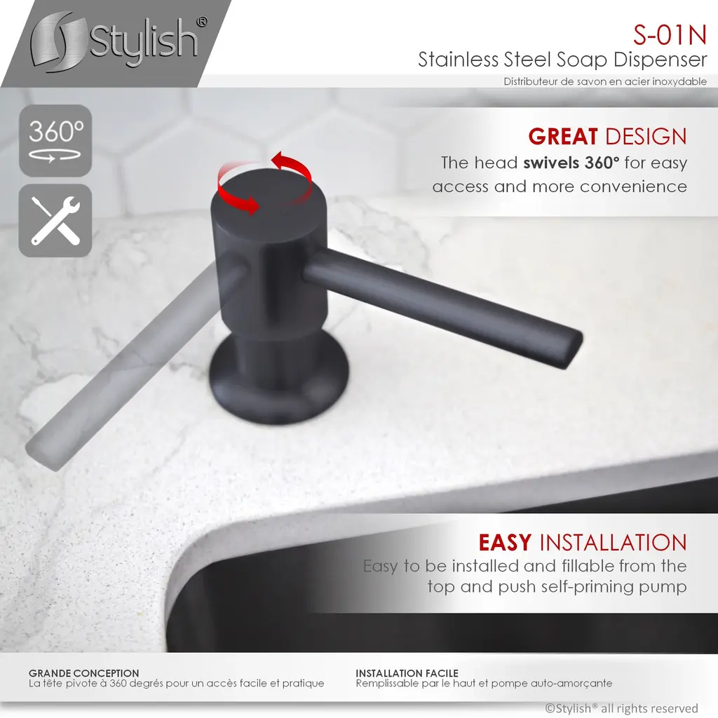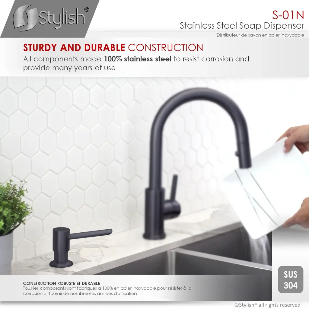 This beautiful and practical 8 oz / 240mL deep liquid soap reservoir by STYLISH® has been engineered to meet your everyday needs with superior style. Imagine having the convenience of dish soap at your fingertips in a beautiful soap dispenser and with no mess. Complete the look of your kitchen with this sleek and stylish kitchen soap dispenser from Stylish®. This functional dispenser is made of 100 percent solid stainless steel which will resist to corrosion and discoloration. It is refillable from the top and it will perfectly match your kitchen appliances. Included with the kitchen soap dispenser are installation instructions, it is very easy to install. Choose from three beautiful finishes, Stainless Steel, Matte Black, or Gold to complement the style of your kitchen.FEATURES: PREMIUM MATERIAL: Made of surgical grade SUS 304 stainless steel 18 Gauge, with an optimized 18pct Chromium and 10pct Nickel content, this sink soap dispenser is superbly crafted to provide excellent strength and hardness. The specially chosen satin finish will hide water spots. PERFECT FIT: This soap dispenser has an elegant and smooth to touch finish. It is very easy to clean. The bold looking design will match perfectly with any modern or transitional décor. EXTRA DEEP: Specifically designed to easily accommodate many days without refilling with the generous 8 oz / 240mL reservoir. FILLIABLE FROM THE TOP: This luxurious and functional soap dispenser is refillable from above the counter for easy access and convenience. GREAT DESIGN: The sink soap dispenser pump swivels 360 degree for easy access. The sturdy and durable construction will provide many years of use. It is also very easy to install. THREE FINISHES: Complete the look of your kitchen with this kitchen soap dispenser. Choose from two beautiful finishes, Stainless Steel, Matte Black or Gold. These finishes will perfectly match with your kitchen sink and appliances. The self priming pump head design allows it swivels 360° offering more convenience in every use. WARRANTY: This product is covered by one-year warranty.