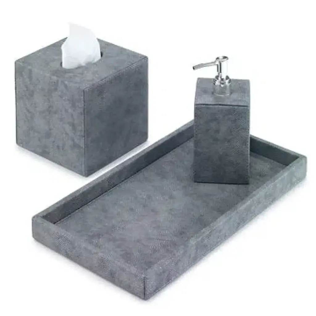 Featuring the same material used in our Stingray Placemats, this brand-new easy-care Bath Accessories line will bring an exotic touch into your room. They are soft to the touch, while featuring a sparkling metallic finish that’s a sure way to elevate any environment! Ideal for gifting friends with excellent taste! Available in Tissue Box, Vanity Tray, Soap Dispenser, and Waste Basket.