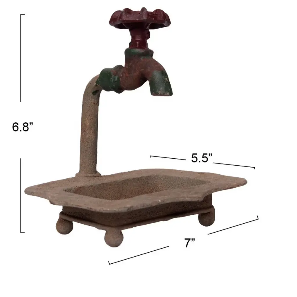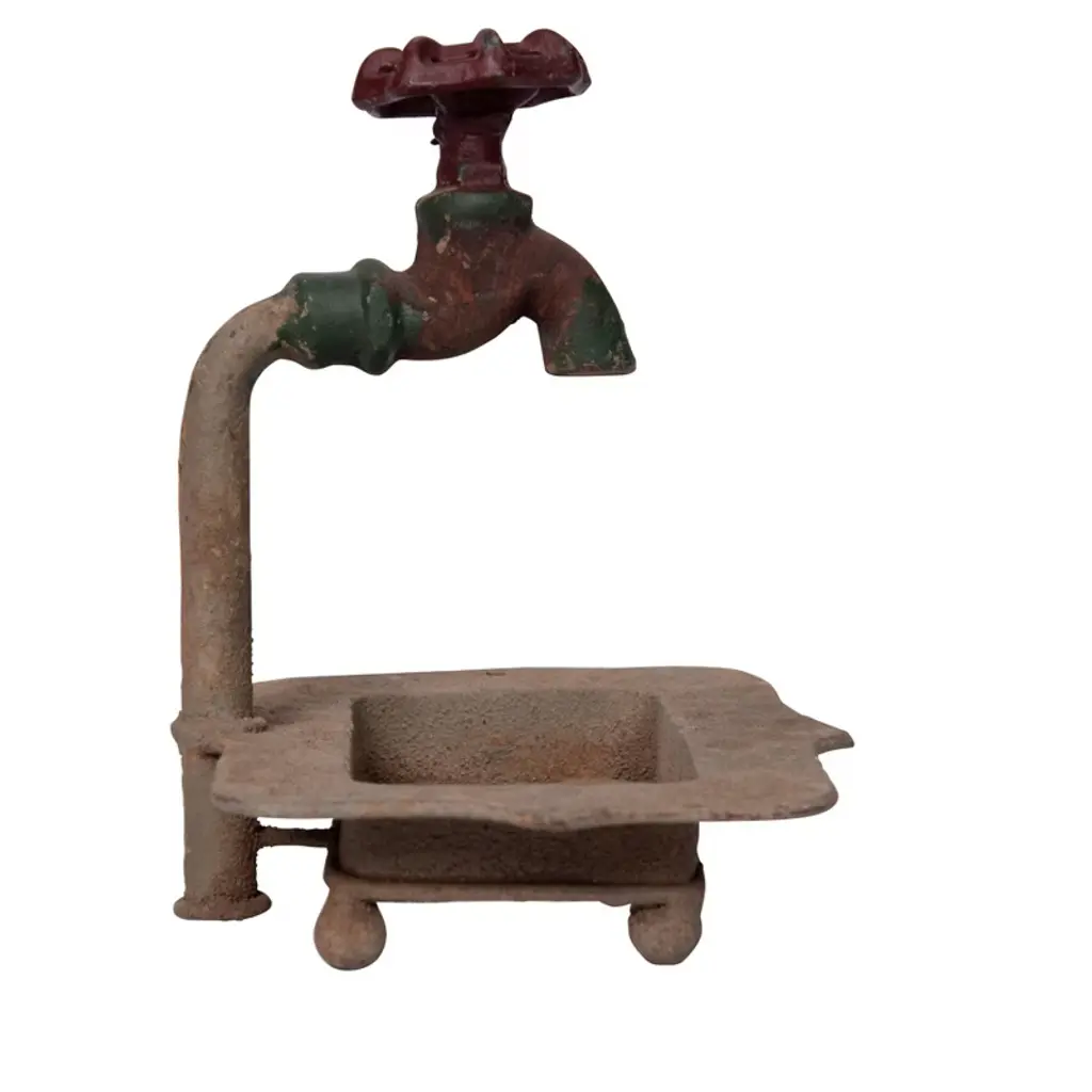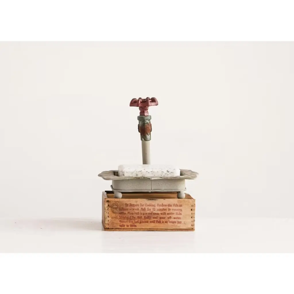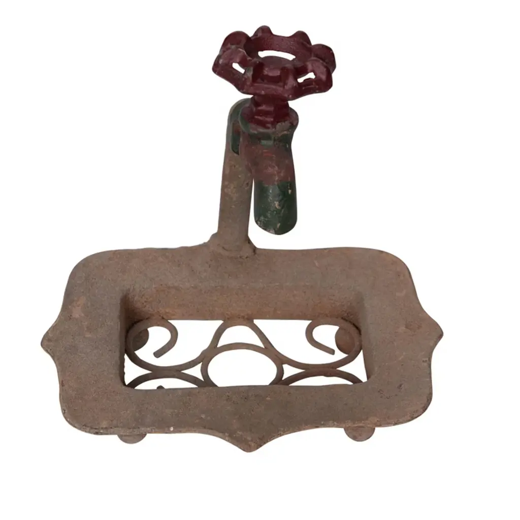Bring an urban industrial aesthetic to your kitchen with this faucet soap holder. A vintage pipe style spigot rises above the scalloped metal soap dish. It has a heavily distressed finish.