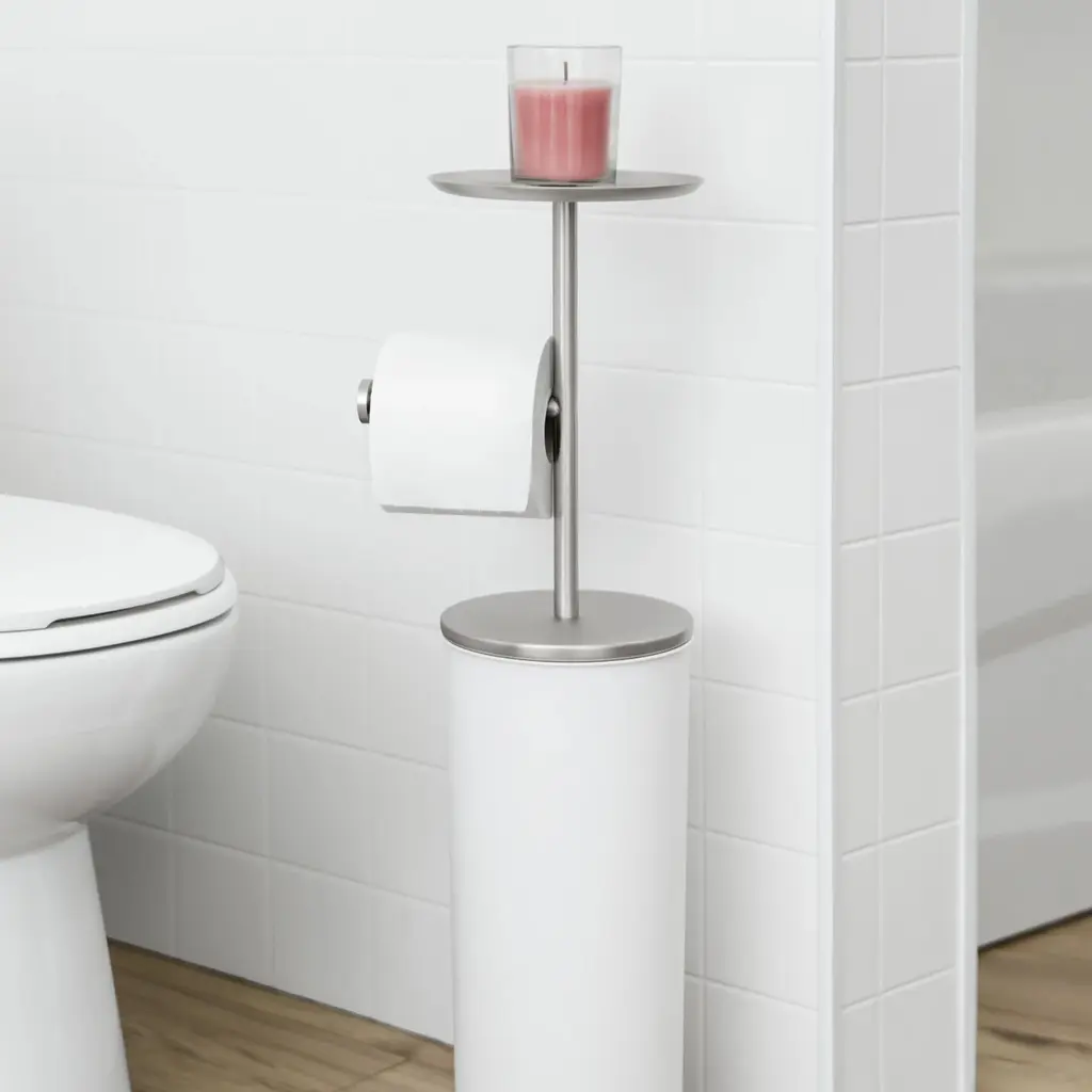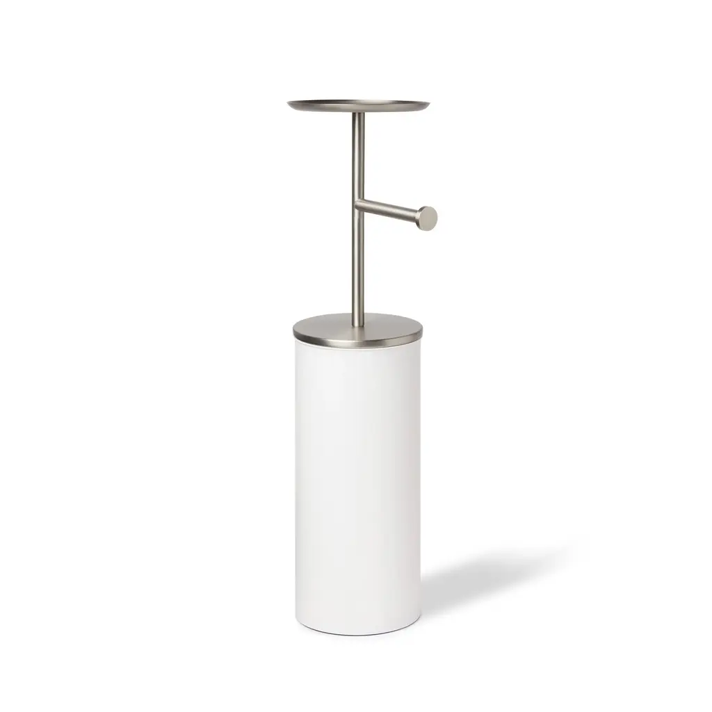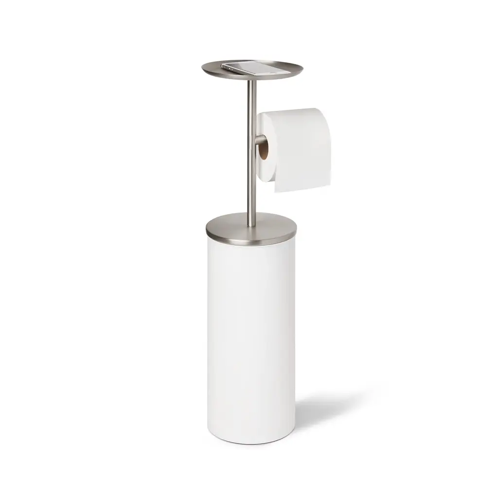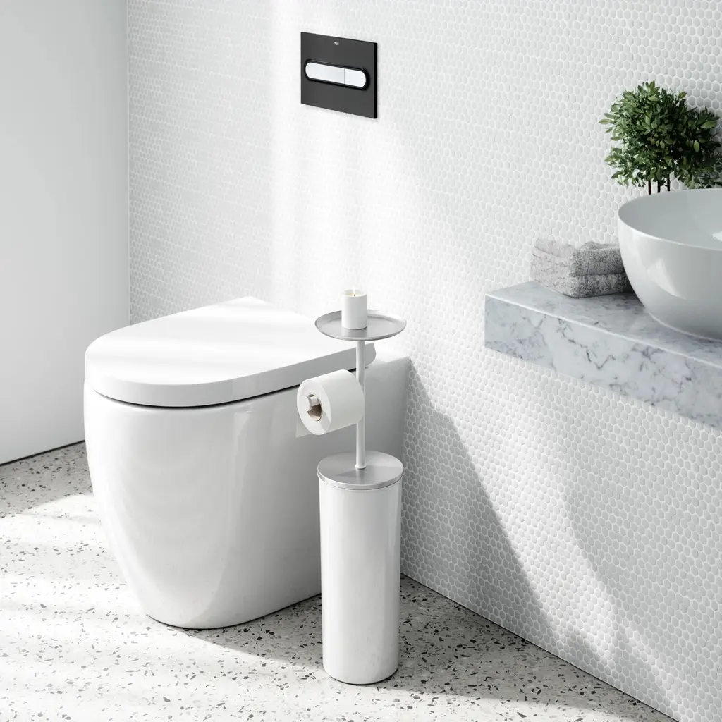 Multifunctional and versatile, the Umbra Portaloo toilet paper stand is a 3-in-1 product that is perfect for more compact areas. Rising vertically to minimize its footprint and save floor space, this modern toilet paper holder features integrated storage for up to 3 jumbo-size rolls and a top tray where you can place anything from a phone to a potted plant or an air freshener. The design also enhances your bathroom décor thanks to an elegant combination of matte white and chrome finishes. Additionally, Portaloo is made with sustainability in mind. Manufactured from recycled plastics, it also features an eco-friendly finish. Designed with light, neutral hues, the Umbra Portaloo Toilet Paper Stand fits into any bathroom with ease, complementing any color palettes.