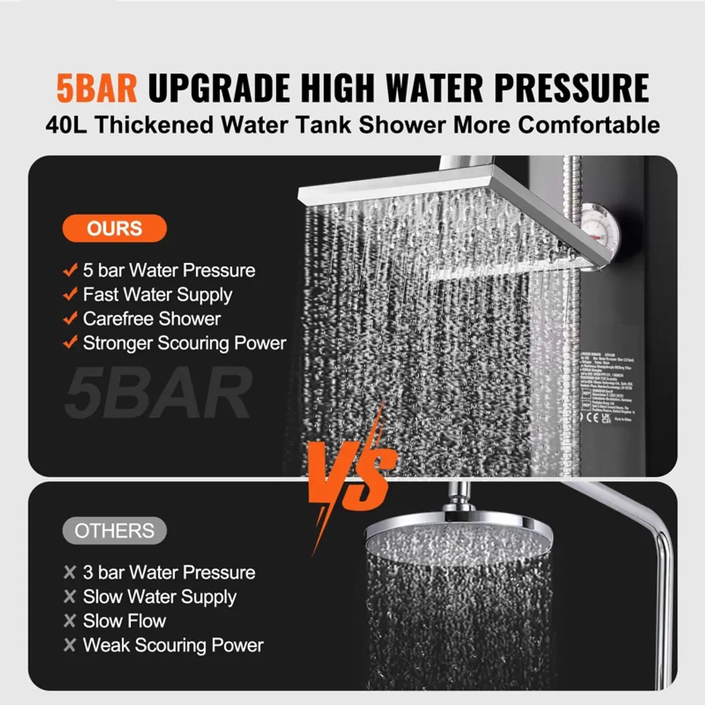 Feature: Large Water Capacity: Upgraded 10.57 gallon / 40L Thickened Water Tank and 5-bar water pressure, you can enjoy a refreshing shower instantly, even in the great outdoors. Simply connect the outdoor shower with a garden hose, easily rinse off before and after swimming. Quick & Easy Installation: Featuring a pre-drilled aluminum alloy spray-painted base, the shower can be directly installed using expansion bolts. The snap-on connection can be completed with a simple twist. Durable and Stable Construction: Outdoor Standing solar shower is made with premium faucet and an integrated thermometer, it prevents water leakage and is easy to maintain. The aluminum alloy spray-painted base and 420D dust coat can easily withstand harsh outdoor weather conditions. 15x15cm Showerhead: With 64 densely spaced water outlets, it provides you with an invigorating shower experience. The inlet can also be connected to a garden hose without the need for additional accessories. Shower offers both hanging and handheld modes, allowing you to choose your preferred showering method according to your preferences. Multiple Uses: Vertical outdoor shower can adjust the hot and cold, suitable for the backyard, poolside, etc. In addition to everyday outdoor pre and post-swim cleaning, it can also be used for pet cleaning, filling water guns, water balloons, and other water toys. Package Content Solar Heated Shower x 1 Double Plating Top Spray x 1 Stainless Steel Bend x 1 Expansion Screws 10x 25mmx 4 Switch x 1 Quick Connector x 1 Raw Material Belt x 1 Zinc Alloy Faucet x 1 Wrench x 1 Top Spray Nut (Including Rubber Ring) x 1 Spherical Joint (With Screen Washer) x 1 Washers ø19 x 2 Dustproof Cover 1 Adapter x 1 Corrugated pipe x 1 Shower stand x 1