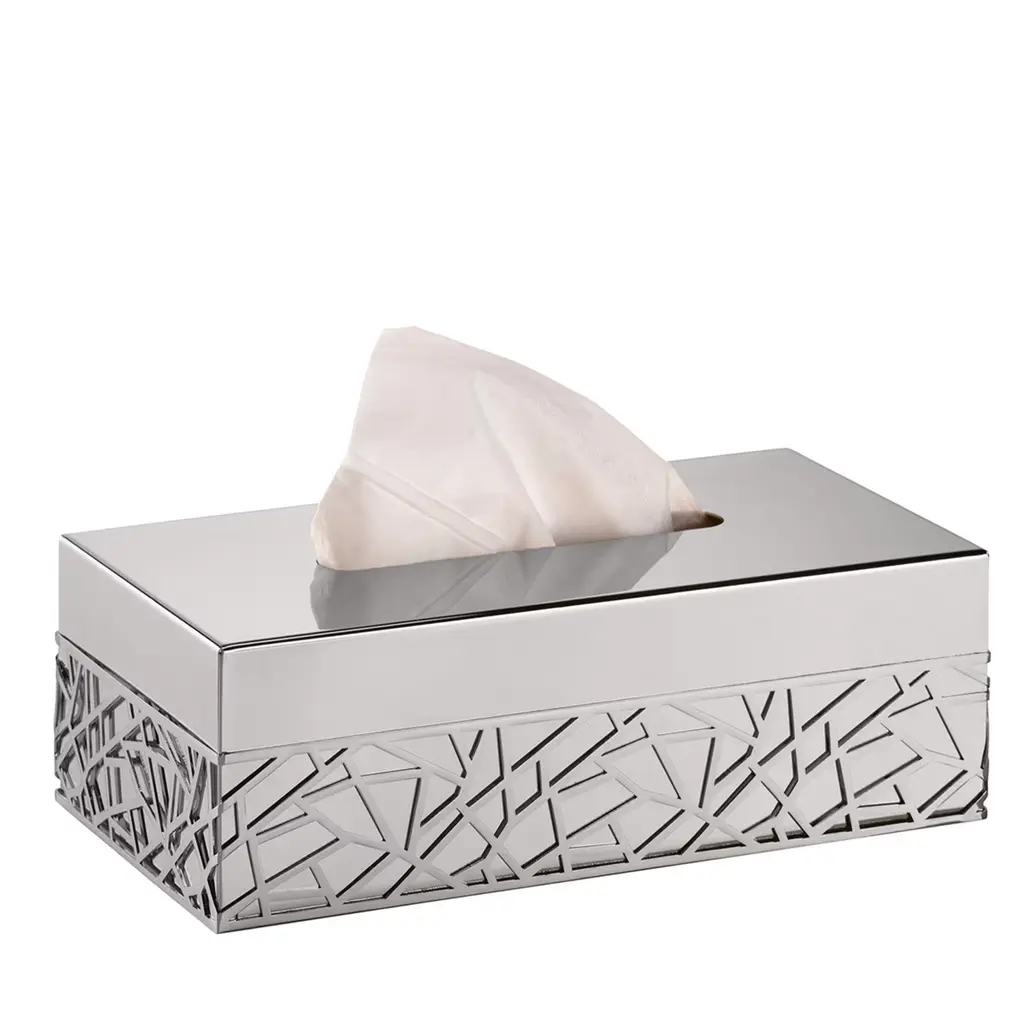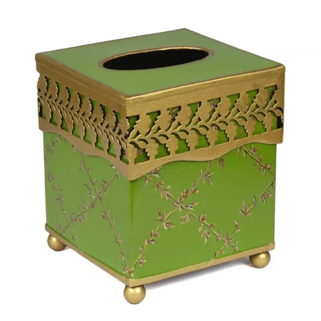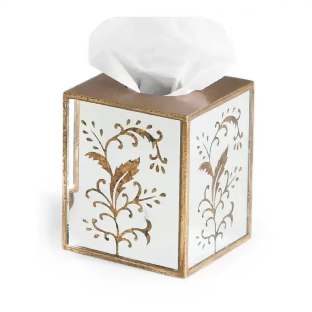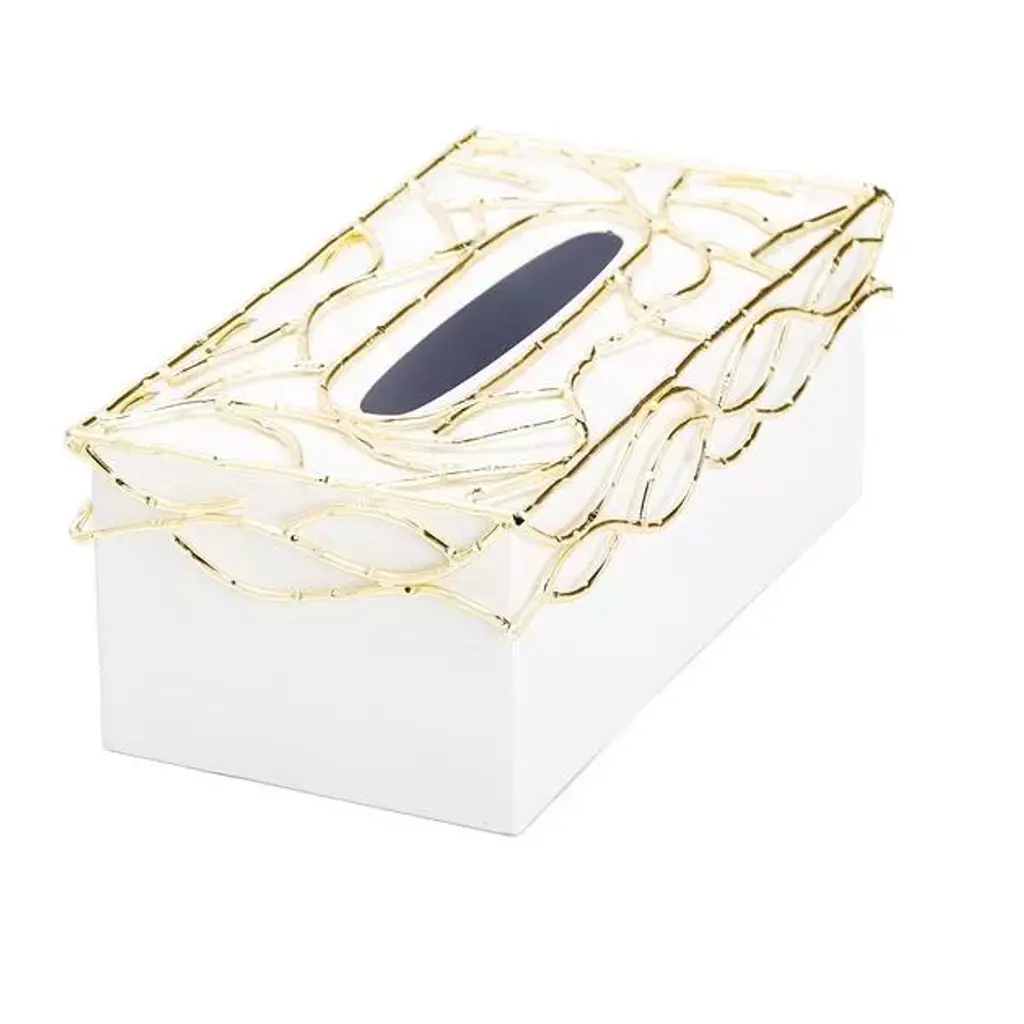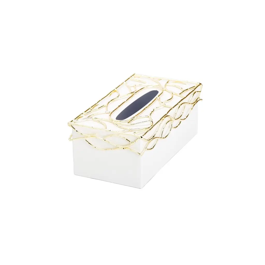 Add a touch of elegance to your vanity with this stylish white tissue box holder. Featuring a gold mesh design, it will hold and display your tissues while looking effortlessly gorgeous. Its classic design adds a charming touch to any table it is placed on. Keep your tissues handy and organized in style with this beautiful tissue box holder