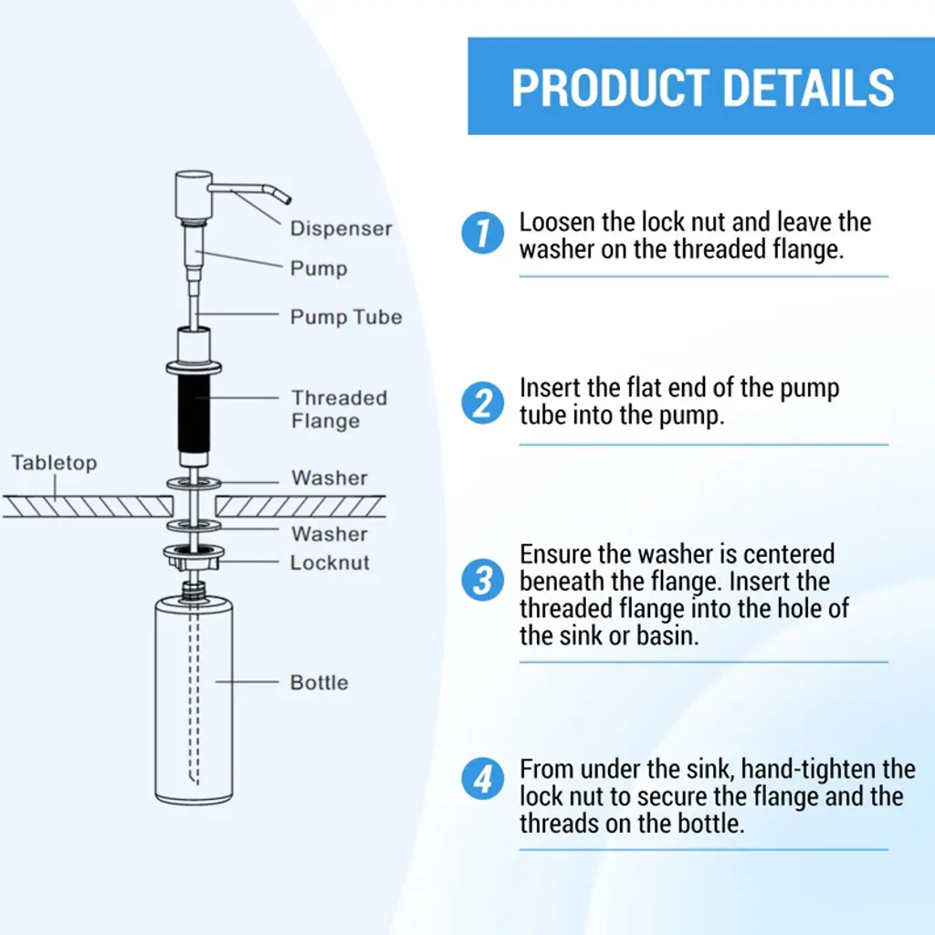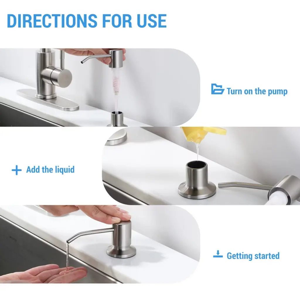 This soap dispenser is made of PE material bottle with 304 stainless steel press head, rustproof and durable. It is designed for sink mounting, easy and quick to save space. 500ml large capacity to meet daily needs, manual press to dispense liquid, precise control. It is ideal for enhancing the quality of life in both kitchen and bathroom.