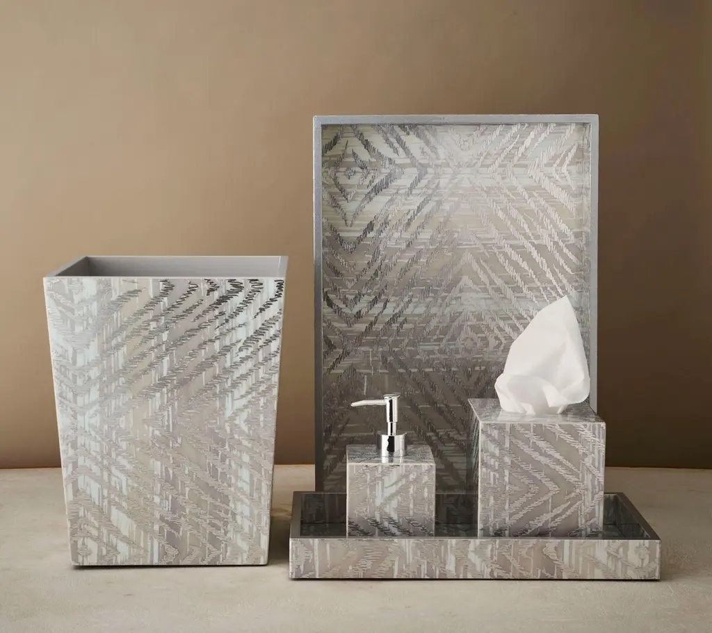 We have re-interpreted classic zebra pattern on our newest bath collection. They are made by hand using lacquer techniques and metallic foiling. The result is a modern must-have bath set, especially this tissue box.