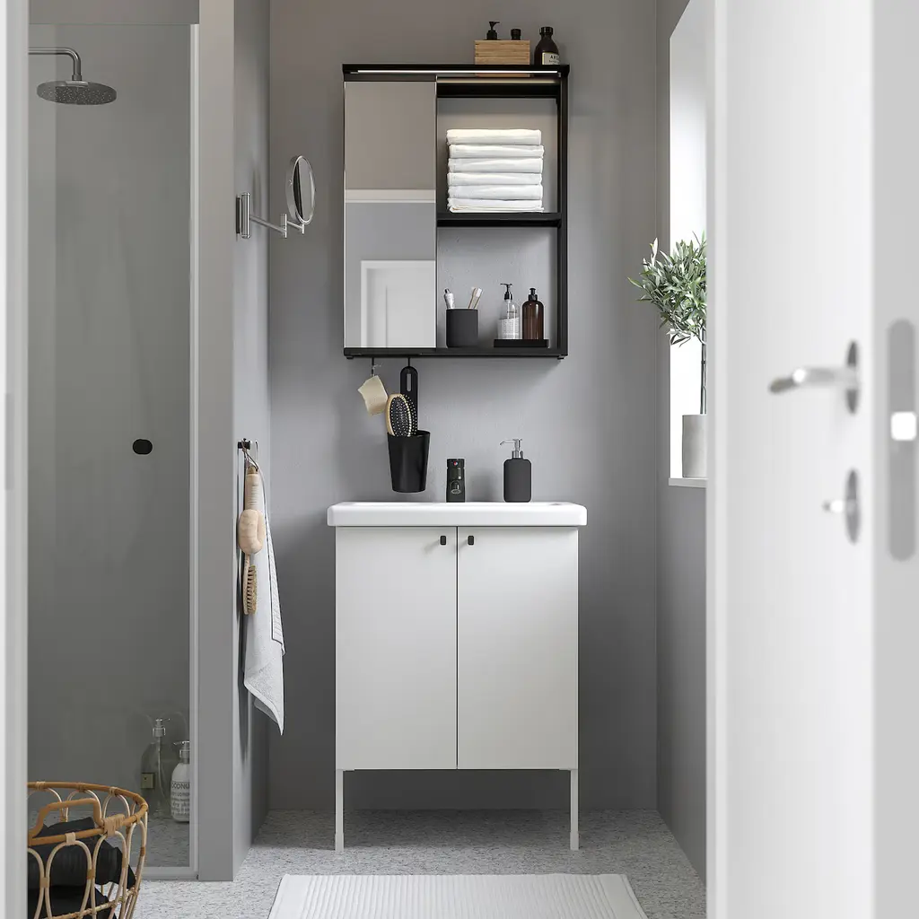 ENHET Bathroom - anthracite/white 24 ". With white doors and drawer fronts you create a clean, bright and fresh expression that you can match with accents in all colors of the rainbow. Easy to enjoy and always in style. Knob or handle sold separately.