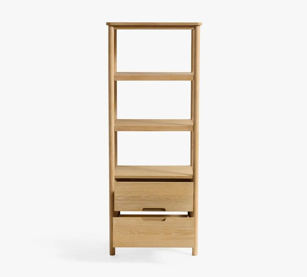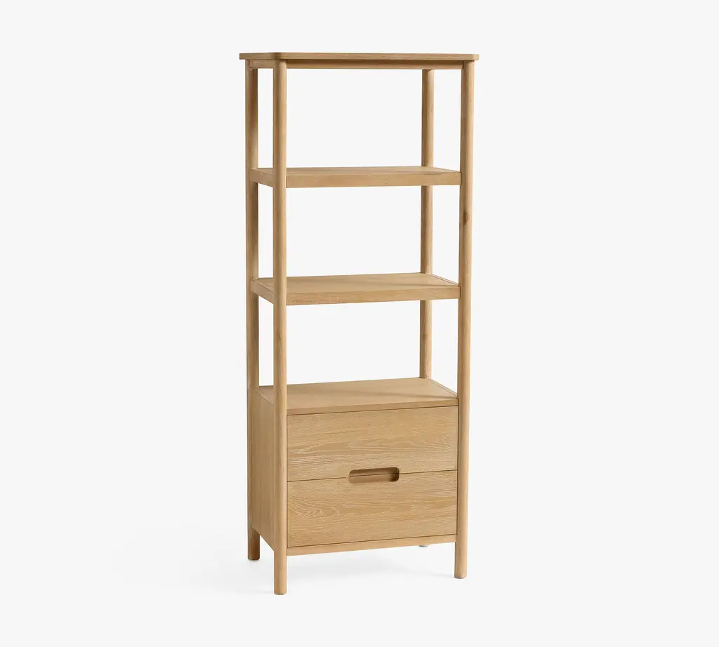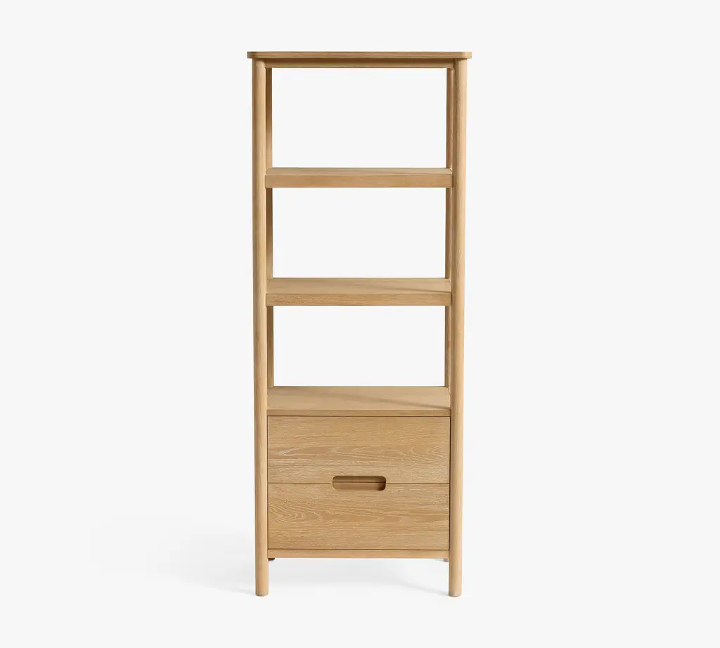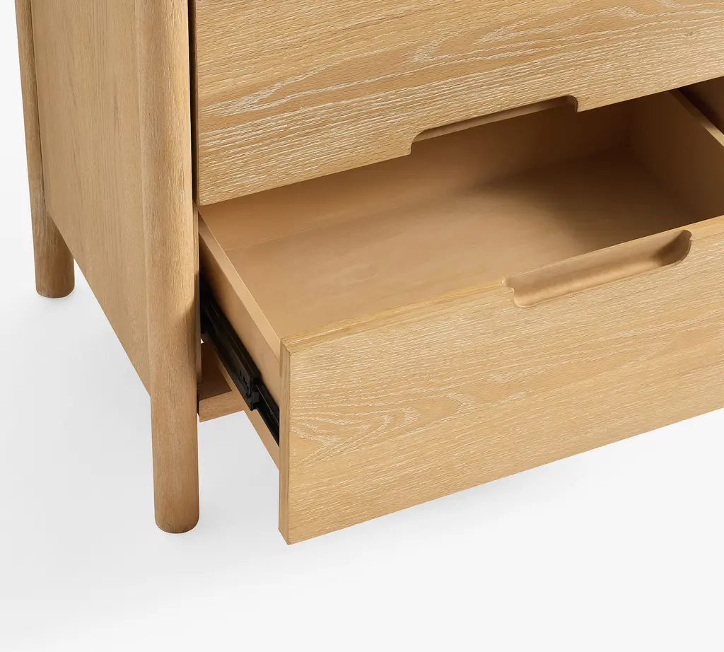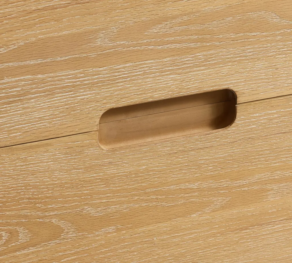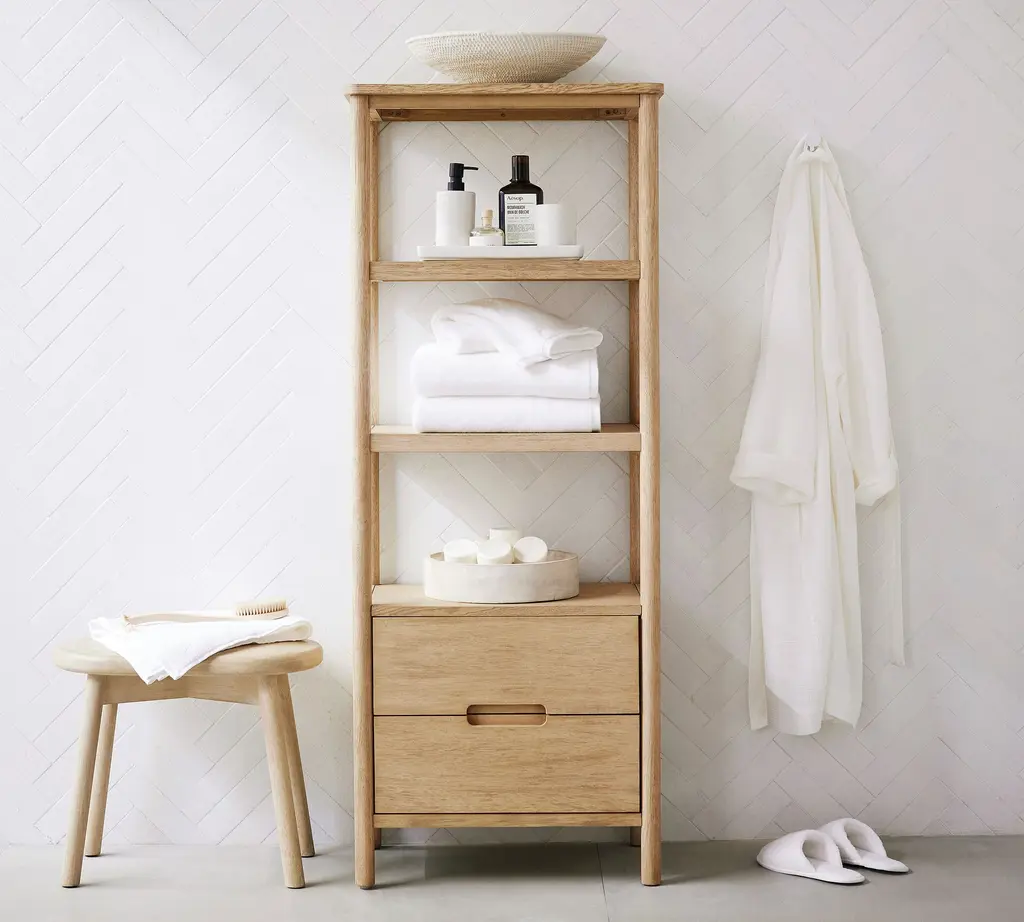 Our interpretation of mid-century design takes a more relaxed approach to modern. Crafted from wood, Manzanita is rich in texture and refined. We love the clean curves, which are echoed in its geometric pocket drawer pulls. Fixed shelves accommodate everything from stacks of fluffy towels to toiletries.