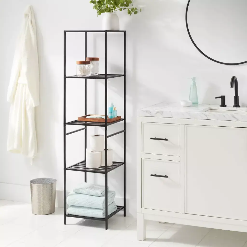 Sleek and stylish, the Tall Bath Storage Tower from Brightroom™ adds functional storage to your bath space. Made with a metal frame, this black storage tower works well with a variety of decor styles. It comes with multiple open shelves to provide ample space to help store your towels, personal items, toiletries and more, while also keeping the items within reach. Easy to place alongside the bathtub or shower, this five-shelf storage tower makes an elegant addition to your bathroom.Brightroom™: See your space in a new light.