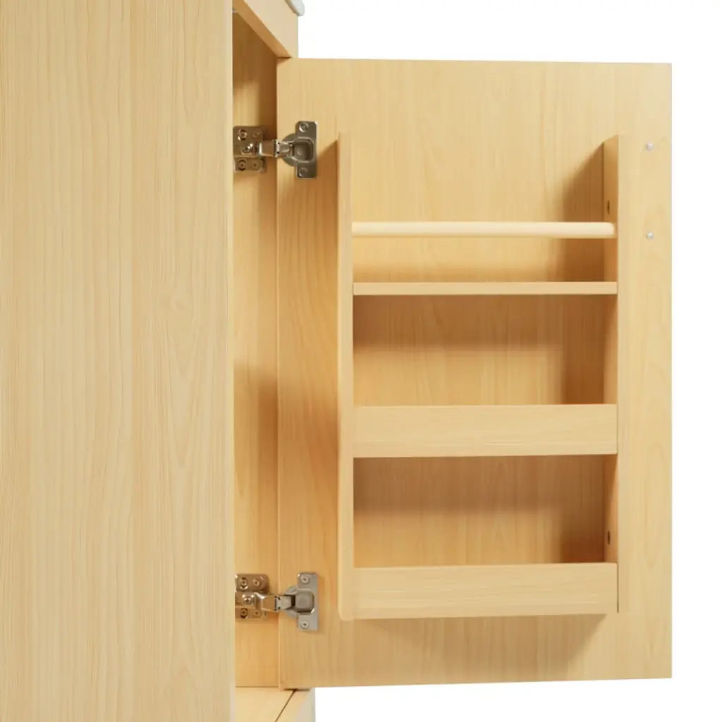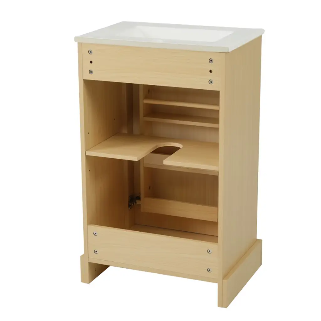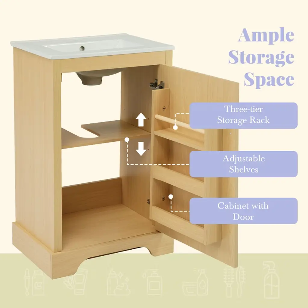 Elevate your bathroom with the ModernLuxe 20" Natural Wood Bathroom Vanity. Crafted from MDF and real wood, it features a easy to clean, waterproof ceramic sink with overflow. The cabinet has a soft-close door, 3-tier door storage rack, and adjustable shelf—ideal for organizing soaps, towels, and toiletries. Stainless steel hinges/handle resist rust in humid spaces. With 100lbs capacity and modern black handles, it combines durability and style. Easy assembly with included hardware—transform your bathroom! Specifications Material: MDF Board+Ceramic+Metal Handle. Overall Product Dimension: 20''W x 14.5''D x 33''H. Overall Weight Capacity: 100 LBS. Product Weight: 53.57 LBS.