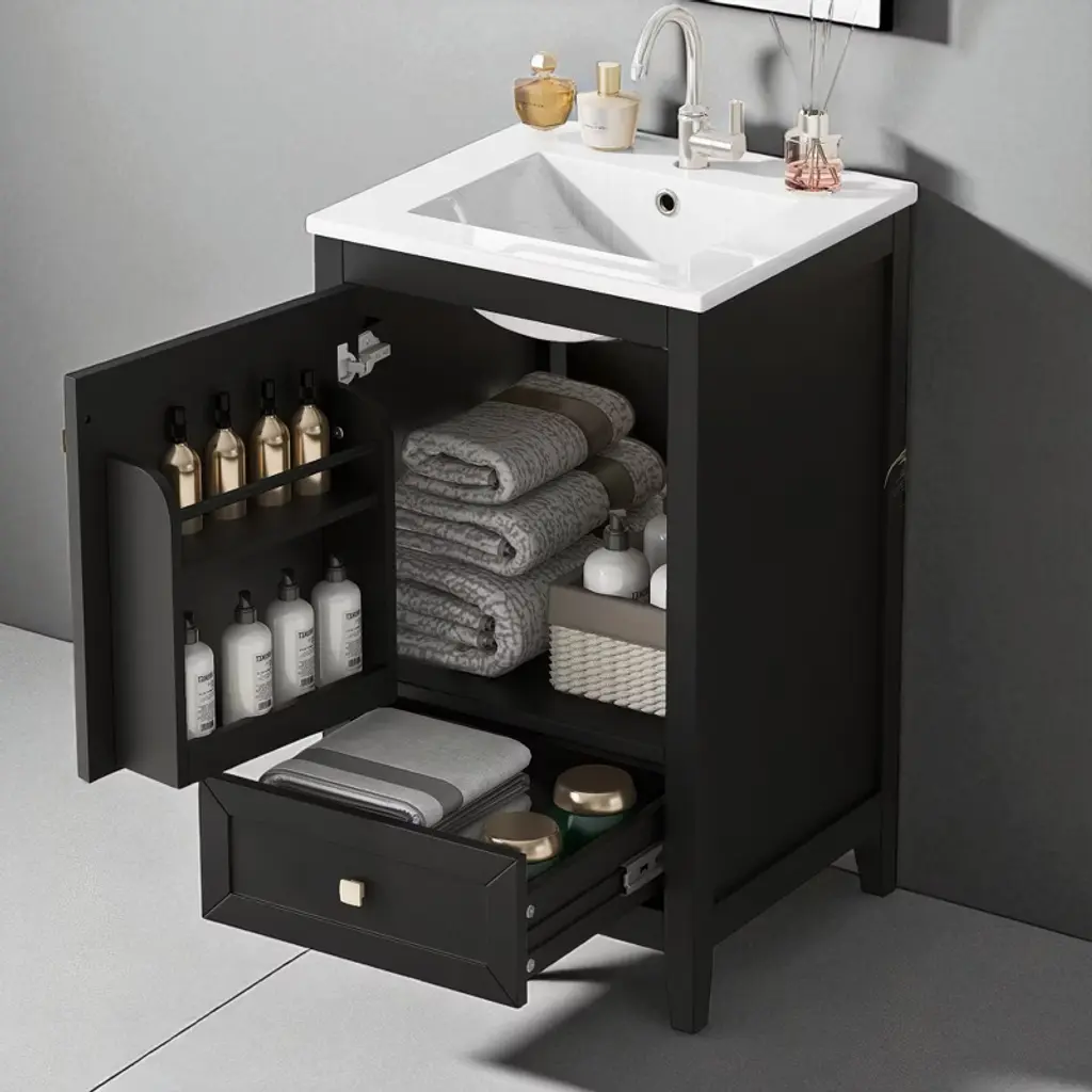 Product Overview: Upgrade your compact bathroom with this 20-inch freestanding black vanity. Designed to combine space-saving functionality with modern elegance, this piece features a water-resistant painted MDF cabinet, a sleek ceramic sink, and thoughtful storage solutions—all in one stylish unit. Whether you're renovating a small bath or powder room, this vanity delivers both convenience and visual appeal. Product Features: Durable Construction: Built with solid MDF board and a durable painted finish, the vanity offers reliable support and long-lasting use. Its water- and stain-resistant surface ensures easy maintenance in humid environments.Integrated Ceramic Sink: The white ceramic sink includes an overflow and a single-hole faucet mount (faucet not included). With a smooth, glossy surface, it resists staining and is easy to keep clean.Smart Storage Design: Features one soft-close cabinet door with a built-in two-tier storage rack, plus a lower drawer for keeping toiletries and bath essentials organized and dust-free.Refined Hardware Details: Stainless steel door hinges resist rust, while the platinum-finished knobs offer a sleek, modern touch. Soft-close technology ensures quiet, gentle use.Easy Assembly: Ships in one package and includes all hardware and a clear instruction manual for hassle-free assembly. Faucet not included. Specifications: Overall Dimensions: 20"" L x 18.3"" W x 34"" HCabinet Base: 19"" L x 17.1"" W x 33.41"" HSink Top: 20"" L x 18.3"" W x 4.72"" HMaterial: MDF Board + Ceramic SinkColor: BlackMounting Type: FreestandingSink Type: Undermount; Drop-InSink Location: CenterFaucet Mount: Single hole (faucet not included)Edge Thickness: 0.59""Weight Capacity: 100 lbsAssembly Required: YesHardware Included: YesCountry of Origin: Vietnam Suitable Scenarios: Ideal for small bathrooms, powder rooms, guest baths, or half baths where maximizing space is essential. The right-sized sink and storage make it perfect for compact layouts without sacrificing functionality or design appeal. Notes: Faucet and drain are not included. The top is pre-drilled for a single-hole faucet. Product ships flat-packed and requires full assembly with the provided instructions and hardware.
