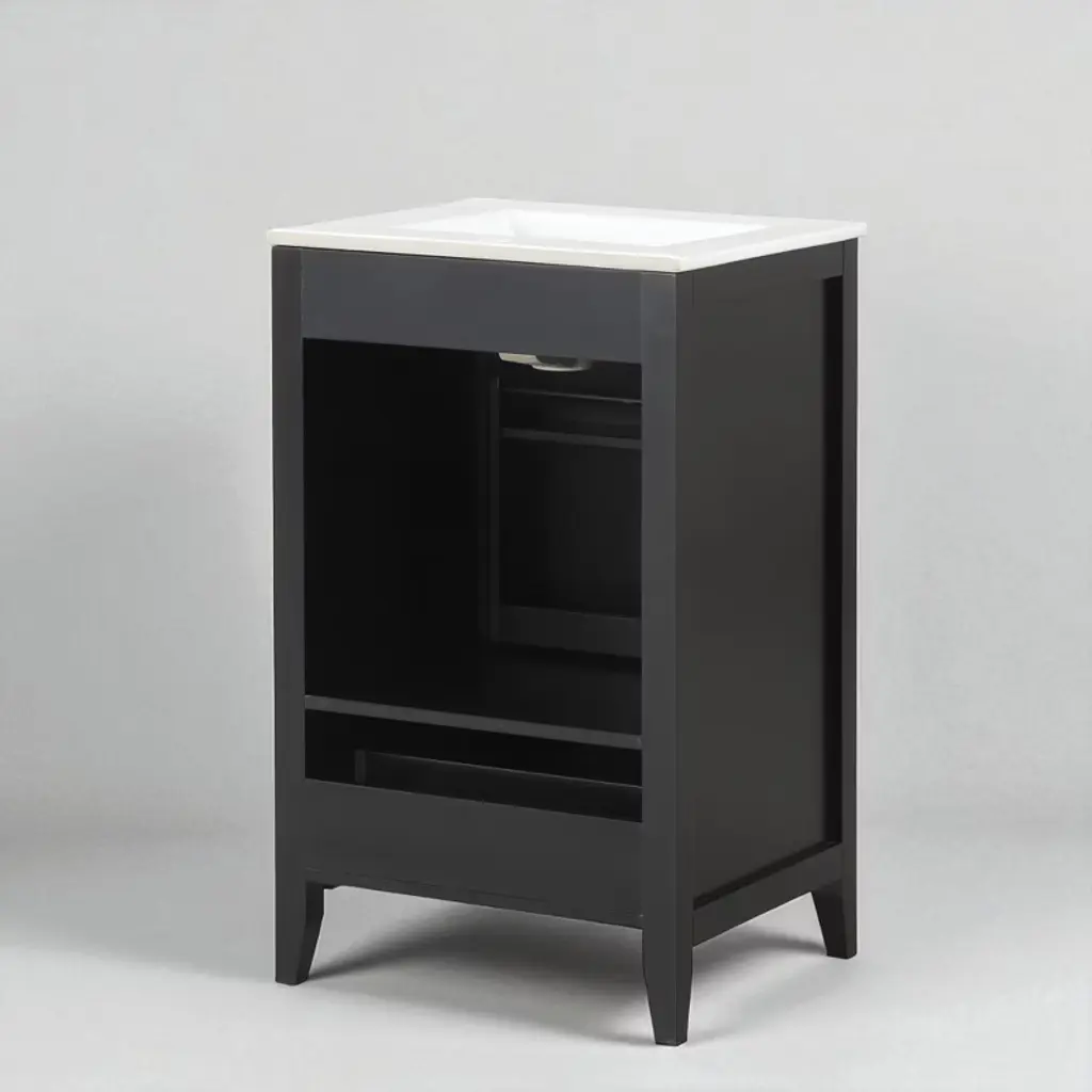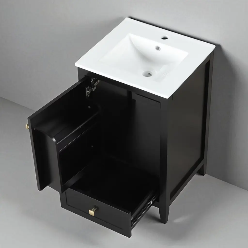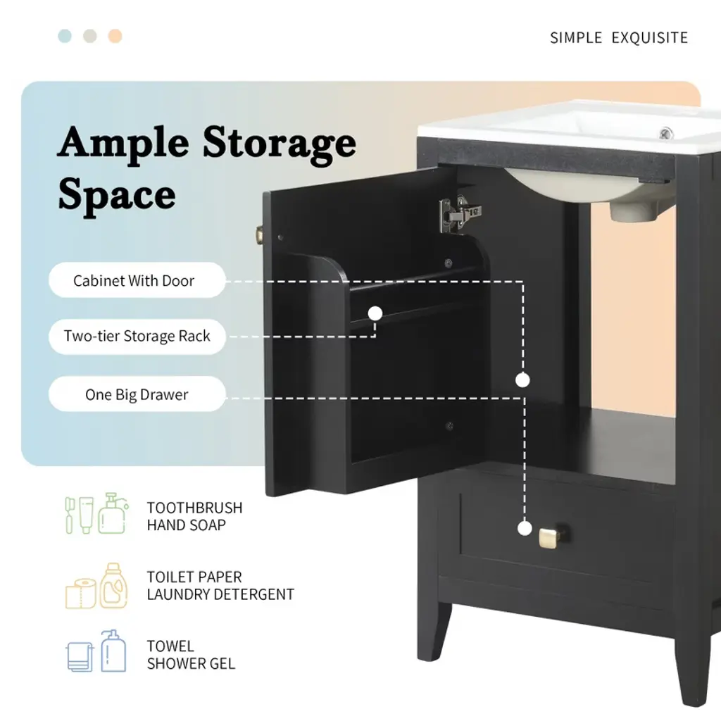 Product Overview: Upgrade your compact bathroom with this 20-inch freestanding black vanity. Designed to combine space-saving functionality with modern elegance, this piece features a water-resistant painted MDF cabinet, a sleek ceramic sink, and thoughtful storage solutions—all in one stylish unit. Whether you're renovating a small bath or powder room, this vanity delivers both convenience and visual appeal. Product Features: Durable Construction: Built with solid MDF board and a durable painted finish, the vanity offers reliable support and long-lasting use. Its water- and stain-resistant surface ensures easy maintenance in humid environments.Integrated Ceramic Sink: The white ceramic sink includes an overflow and a single-hole faucet mount (faucet not included). With a smooth, glossy surface, it resists staining and is easy to keep clean.Smart Storage Design: Features one soft-close cabinet door with a built-in two-tier storage rack, plus a lower drawer for keeping toiletries and bath essentials organized and dust-free.Refined Hardware Details: Stainless steel door hinges resist rust, while the platinum-finished knobs offer a sleek, modern touch. Soft-close technology ensures quiet, gentle use.Easy Assembly: Ships in one package and includes all hardware and a clear instruction manual for hassle-free assembly. Faucet not included. Specifications: Overall Dimensions: 20"" L x 18.3"" W x 34"" HCabinet Base: 19"" L x 17.1"" W x 33.41"" HSink Top: 20"" L x 18.3"" W x 4.72"" HMaterial: MDF Board + Ceramic SinkColor: BlackMounting Type: FreestandingSink Type: Undermount; Drop-InSink Location: CenterFaucet Mount: Single hole (faucet not included)Edge Thickness: 0.59""Weight Capacity: 100 lbsAssembly Required: YesHardware Included: YesCountry of Origin: Vietnam Suitable Scenarios: Ideal for small bathrooms, powder rooms, guest baths, or half baths where maximizing space is essential. The right-sized sink and storage make it perfect for compact layouts without sacrificing functionality or design appeal. Notes: Faucet and drain are not included. The top is pre-drilled for a single-hole faucet. Product ships flat-packed and requires full assembly with the provided instructions and hardware.