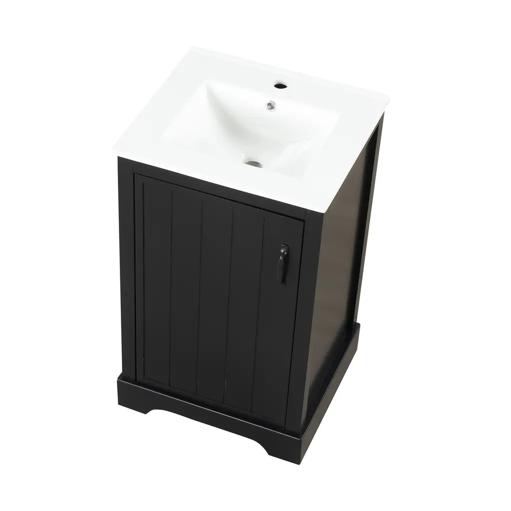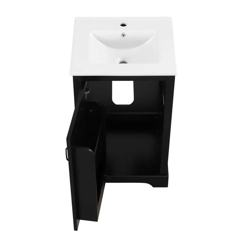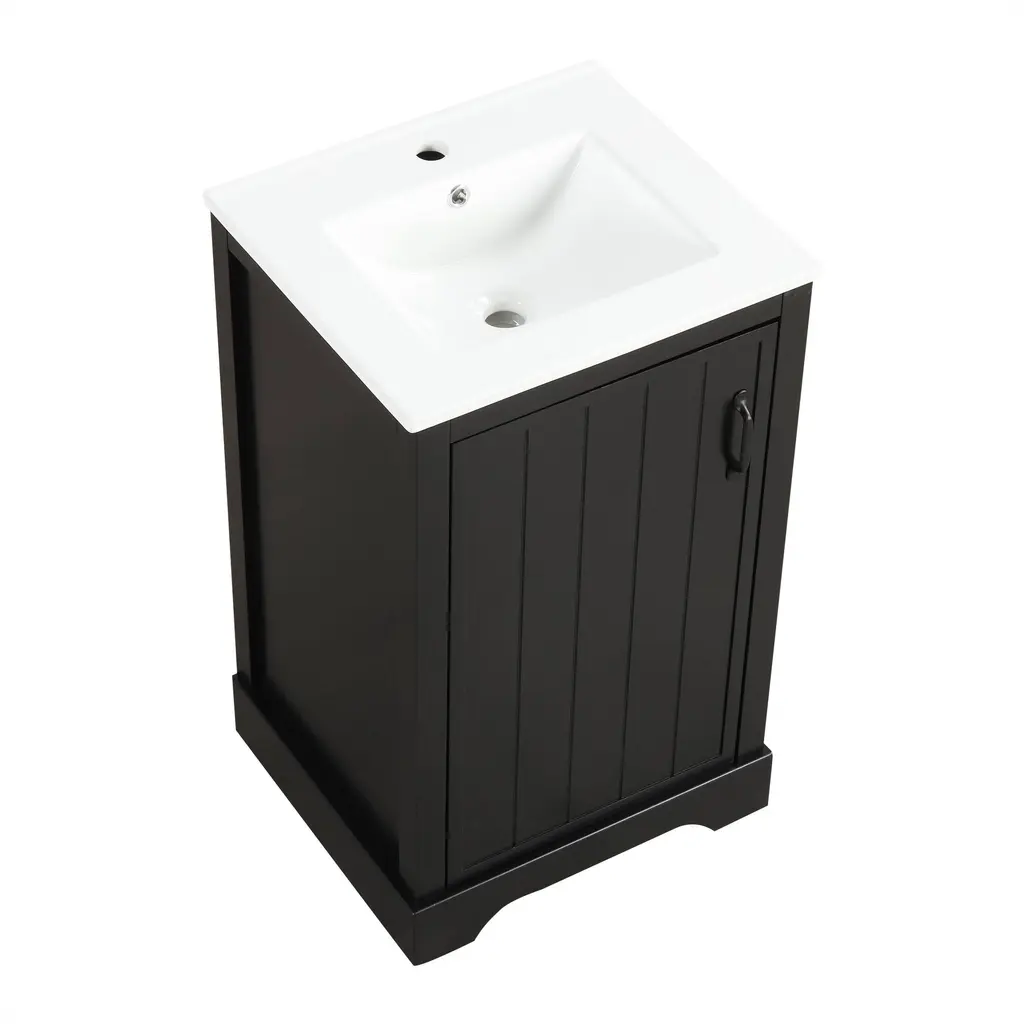 Product FeaturesMaterial - Practicality and durability is important to bathroom facilities, so we use real wood and MDF boards for this product, which not only increases the product stability but also ensures a long-lasting use. Furthermore, the surface of this vanity cabinet is in painted finish. It is water-proof, stain proof and very easy to clean.Ceramic Sink - The white ceramic sink with basin is equipped with an integrated overflow and one hole for faucet mount. It is very easy to clean that you can keep it smooth and shinning effortlessly. Single hole faucet will fit this sink (not included).Vanity with Cabinet & Storage Rack & Adjustable Shelve - This bathroom vanity has ample storage space: one cabinet with door, two-tier storage rack on the door, and adjustable shelve. You can put soaps, towels, shampoos, tissue paper and other bathroom essentials in it so to keep them away from dust.Thoughtful Details: Considering the humid environment in the bathroom, the door hinges and handle are made of stainless steel, which is not easy to rust. In order to keep silent when open and closing the door, the soft closing door is selected for this cabinet. Black metal door handle creating a modern look that is smooth to the touch and pleasant to use.Assembly Required - This bathroom vanity with sink, needs assembly, is in one package. All the hardware and instruction manual are provided.
