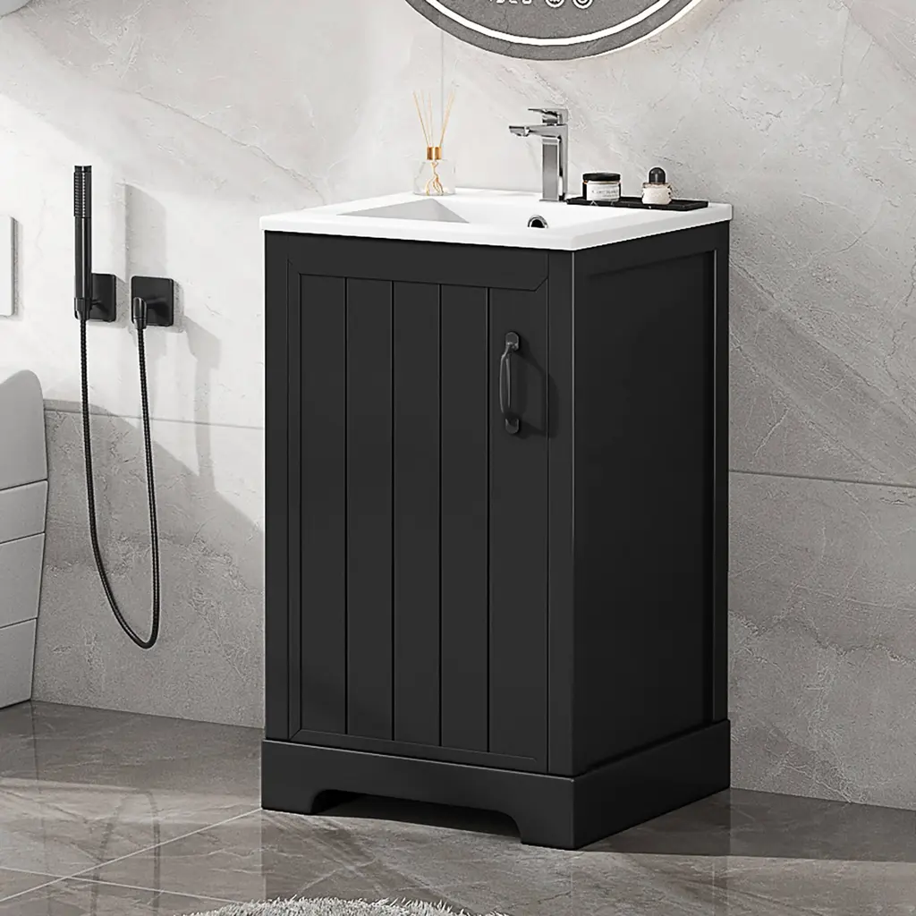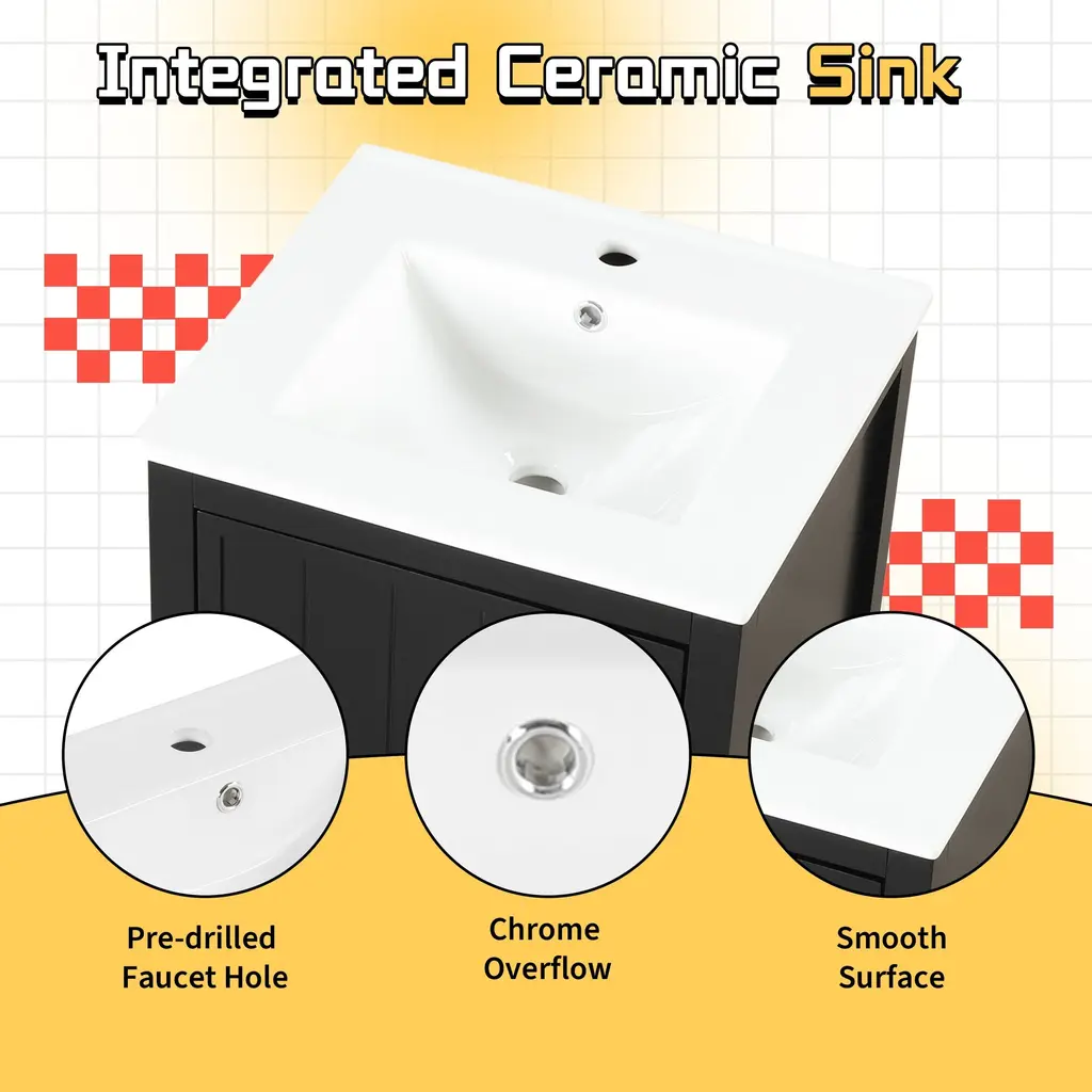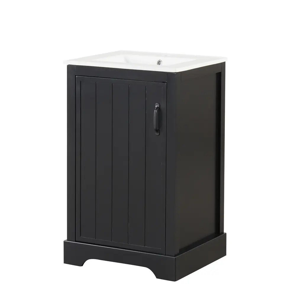 Product FeaturesMaterial - Practicality and durability is important to bathroom facilities, so we use real wood and MDF boards for this product, which not only increases the product stability but also ensures a long-lasting use. Furthermore, the surface of this vanity cabinet is in painted finish. It is water-proof, stain proof and very easy to clean.Ceramic Sink - The white ceramic sink with basin is equipped with an integrated overflow and one hole for faucet mount. It is very easy to clean that you can keep it smooth and shinning effortlessly. Single hole faucet will fit this sink (not included).Vanity with Cabinet & Storage Rack & Adjustable Shelve - This bathroom vanity has ample storage space: one cabinet with door, two-tier storage rack on the door, and adjustable shelve. You can put soaps, towels, shampoos, tissue paper and other bathroom essentials in it so to keep them away from dust.Thoughtful Details: Considering the humid environment in the bathroom, the door hinges and handle are made of stainless steel, which is not easy to rust. In order to keep silent when open and closing the door, the soft closing door is selected for this cabinet. Black metal door handle creating a modern look that is smooth to the touch and pleasant to use.Assembly Required - This bathroom vanity with sink, needs assembly, is in one package. All the hardware and instruction manual are provided.
