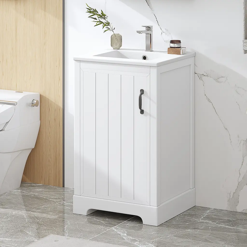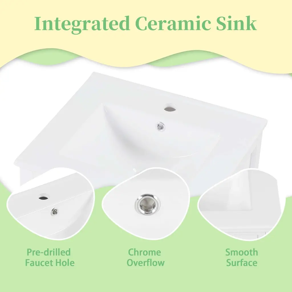 Product FeaturesMaterial - Practicality and durability is important to bathroom facilities, so we use real wood and MDF boards for this product, which not only increases the product stability but also ensures a long-lasting use. Furthermore, the surface of this vanity cabinet is in painted finish. It is water-proof, stain proof and very easy to clean.Ceramic Sink - The white ceramic sink with basin is equipped with an integrated overflow and one hole for faucet mount. It is very easy to clean that you can keep it smooth and shinning effortlessly. Single hole faucet will fit this sink (not included).Vanity with Cabinet & Storage Rack & Adjustable Shelve - This bathroom vanity has ample storage space: one cabinet with door, two-tier storage rack on the door, and adjustable shelve. You can put soaps, towels, shampoos, tissue paper and other bathroom essentials in it so to keep them away from dust.Thoughtful Details: Considering the humid environment in the bathroom, the door hinges and handle are made of stainless steel, which is not easy to rust. In order to keep silent when open and closing the door, the soft closing door is selected for this cabinet. Black metal door handle creating a modern look that is smooth to the touch and pleasant to use.Assembly Required - This bathroom vanity with sink, needs assembly, is in one package. All the hardware and instruction manual are provided.