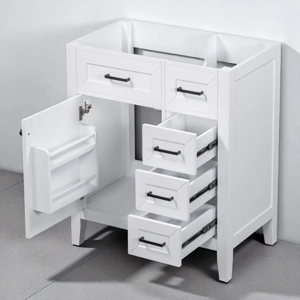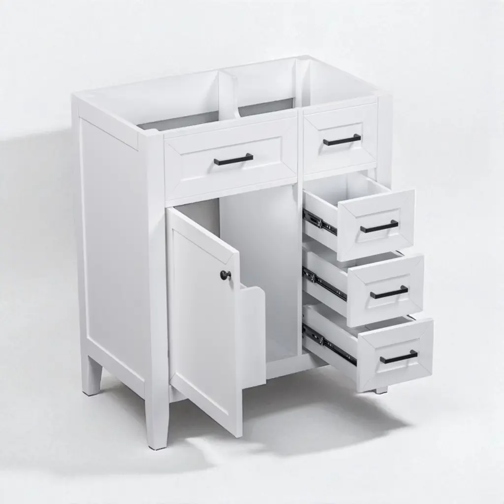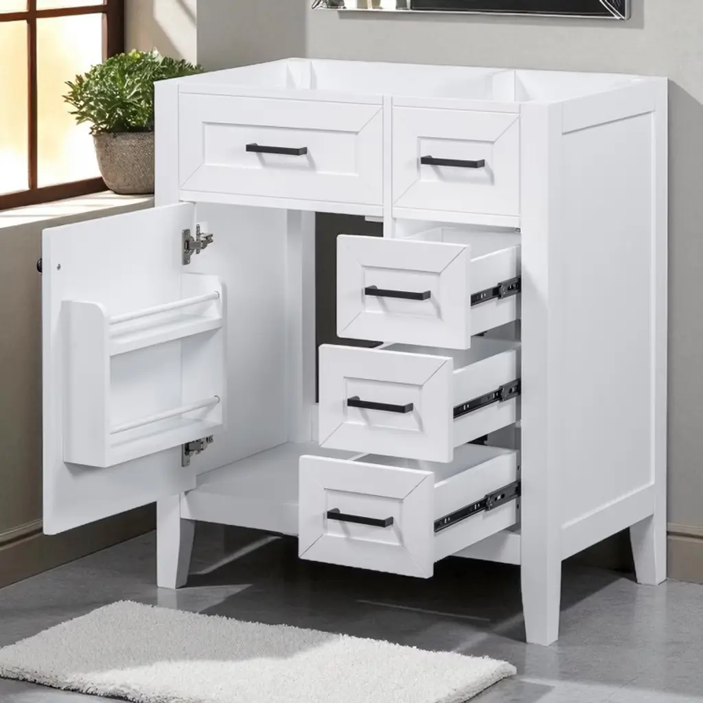 Product Overview:Elevate your bathroom with this 30"" freestanding vanity base, designed in a modern minimalist style with elegant groove detailing. Crafted from solid rubber wood and MDF board, it delivers both strength and style. Finished in classic white with sleek black handles, this vanity base complements a variety of bathroom decors. Please note: this product is the cabinet base only and does not include a sink top, giving you the freedom to customize with a sink of your choice.Product Features:Modern Aesthetic: The white painted finish, stylish black hardware, and decorative groove lines on the door and drawers bring a clean, modern look to your bathroom space.Solid Wood & MDF Construction: Built with a durable rubber wood frame and MDF paneling, this cabinet offers exceptional sturdiness, resistance to moisture, and easy cleaning with its water- and stain-resistant surface.Ample Enclosed Storage: Includes one cabinet with a soft-closing door and three drawers with slide rails (top two drawers are decorative). A two-tier shelf on the door provides additional space for small bathroom items like soaps, lotions, and razors.Sink Compatibility: Designed to accommodate one centered sink (undermount or drop-in), making it easy to pair with the countertop that best suits your space and taste.Easy Assembly: Ships with all necessary hardware including handles, hinges, drawer slides, and anti-toppling device. A detailed instruction manual is included to guide assembly with ease.Specifications:Product Dimensions: 29.52"" L x 17.71"" W x 35.03"" HMaterial: Solid Rubber Wood & MDF BoardFinish: Painted WhiteMounting Type: FreestandingNumber of Doors: 1Number of Drawers: 3 (Top two are decorative)Sink Compatibility: 1 Centered Sink (Undermount or Drop-In)Weight Capacity: 200 lbsAssembly Required: YesCountry of Origin: VietnamCertification: CARB P2Suitable Scenarios:Ideal for small to medium-sized bathrooms, guest baths, or powder rooms. Its compact yet functional layout is perfect for those seeking a clean and uncluttered bathroom space.Notes:Sink and faucet are not included. Color may vary slightly due to lighting and monitor settings. Please follow the included instructions for proper assembly and installation.