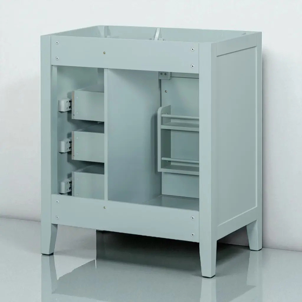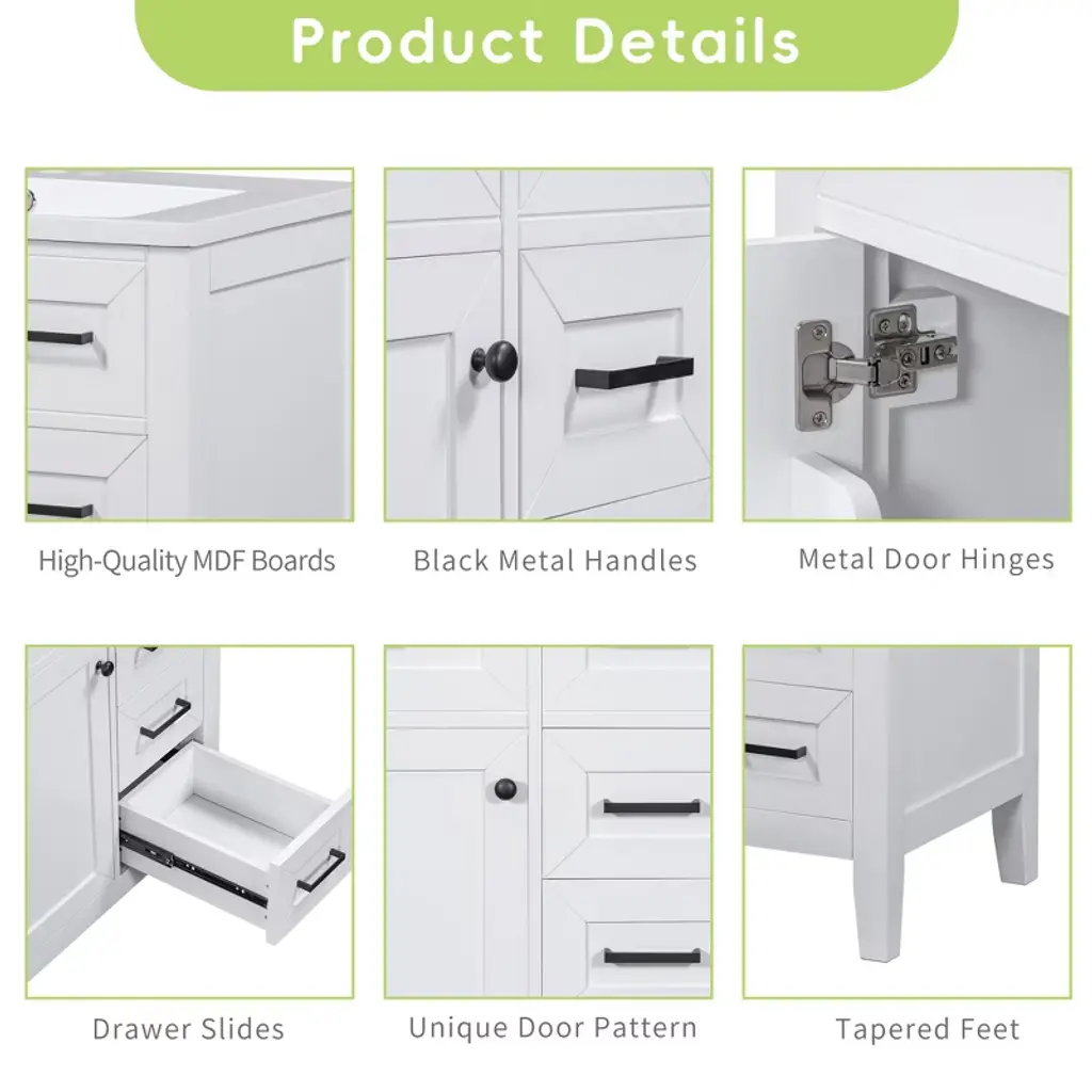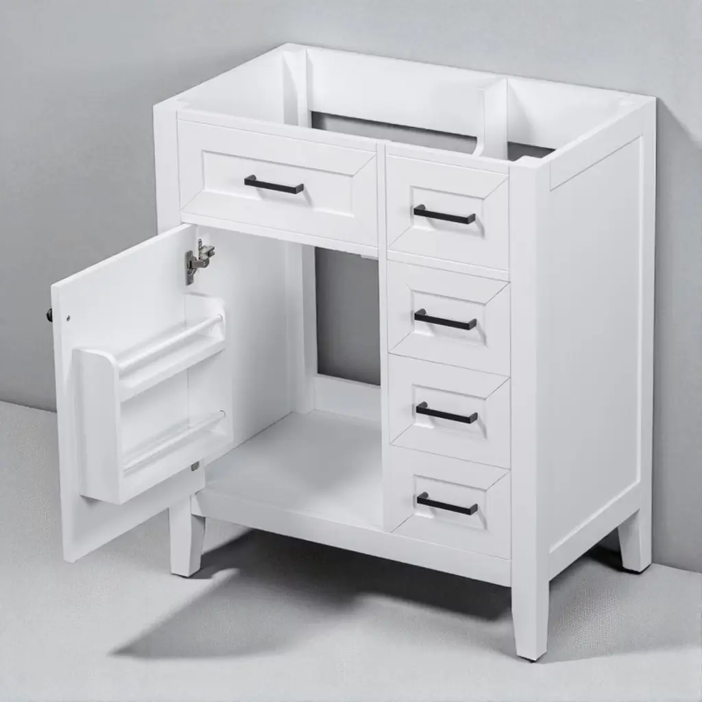 Product Overview:Elevate your bathroom with this 30"" freestanding vanity base, designed in a modern minimalist style with elegant groove detailing. Crafted from solid rubber wood and MDF board, it delivers both strength and style. Finished in classic white with sleek black handles, this vanity base complements a variety of bathroom decors. Please note: this product is the cabinet base only and does not include a sink top, giving you the freedom to customize with a sink of your choice.Product Features:Modern Aesthetic: The white painted finish, stylish black hardware, and decorative groove lines on the door and drawers bring a clean, modern look to your bathroom space.Solid Wood & MDF Construction: Built with a durable rubber wood frame and MDF paneling, this cabinet offers exceptional sturdiness, resistance to moisture, and easy cleaning with its water- and stain-resistant surface.Ample Enclosed Storage: Includes one cabinet with a soft-closing door and three drawers with slide rails (top two drawers are decorative). A two-tier shelf on the door provides additional space for small bathroom items like soaps, lotions, and razors.Sink Compatibility: Designed to accommodate one centered sink (undermount or drop-in), making it easy to pair with the countertop that best suits your space and taste.Easy Assembly: Ships with all necessary hardware including handles, hinges, drawer slides, and anti-toppling device. A detailed instruction manual is included to guide assembly with ease.Specifications:Product Dimensions: 29.52"" L x 17.71"" W x 35.03"" HMaterial: Solid Rubber Wood & MDF BoardFinish: Painted WhiteMounting Type: FreestandingNumber of Doors: 1Number of Drawers: 3 (Top two are decorative)Sink Compatibility: 1 Centered Sink (Undermount or Drop-In)Weight Capacity: 200 lbsAssembly Required: YesCountry of Origin: VietnamCertification: CARB P2Suitable Scenarios:Ideal for small to medium-sized bathrooms, guest baths, or powder rooms. Its compact yet functional layout is perfect for those seeking a clean and uncluttered bathroom space.Notes:Sink and faucet are not included. Color may vary slightly due to lighting and monitor settings. Please follow the included instructions for proper assembly and installation.