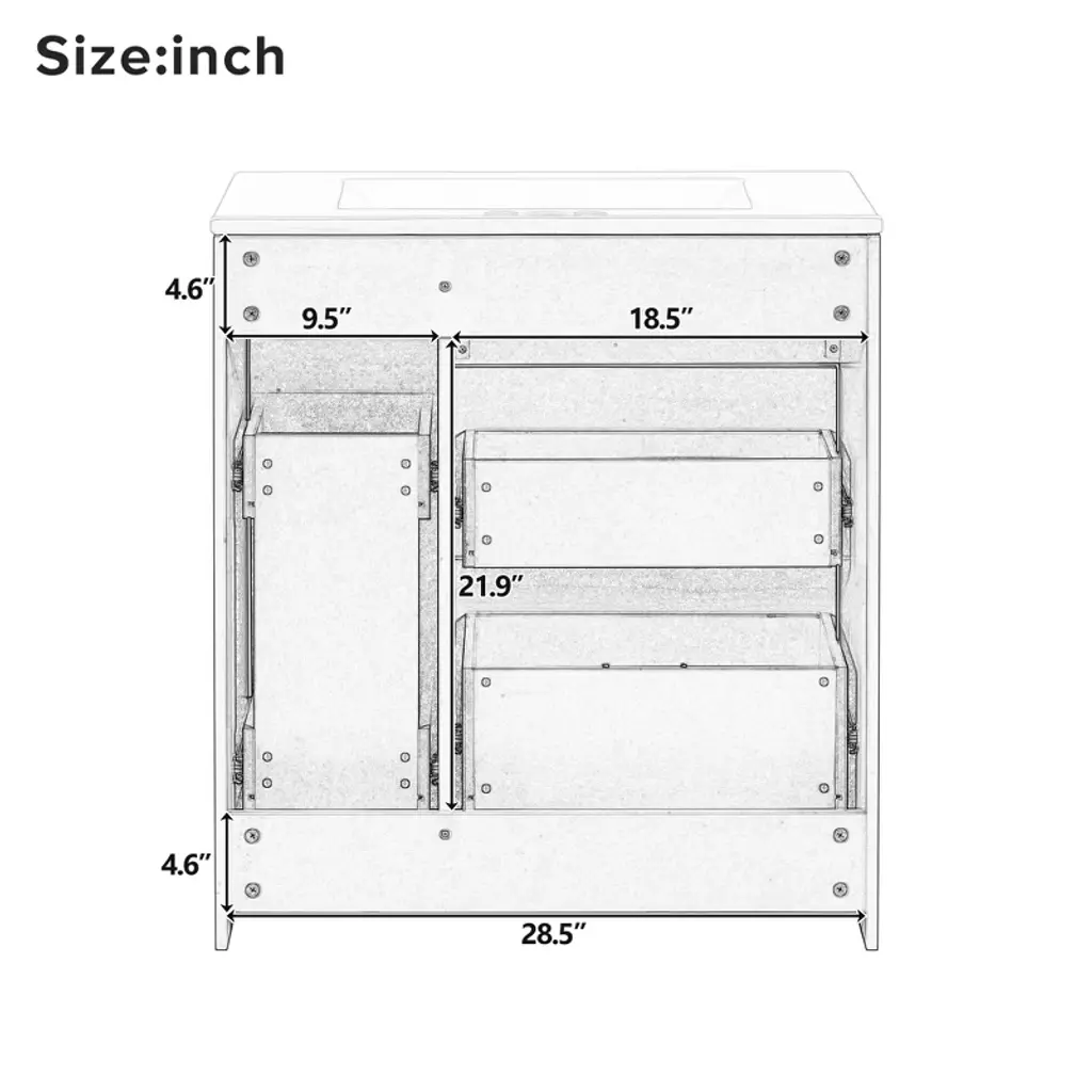 Transform your bathroom into a serene retreat with this 30" wide vanity, designed to elevate both space and style in smaller bathrooms. Its forest-green elegance and golden accents add a timeless sophistication, while the ceramic basin with overflow promises effortless maintenance and a clean, dry space. Every inch is crafted for functionality: a double-layer drawer and deep compartments offer ample storage, keeping essentials organized and within reach. Built with durable MDF, this piece embodies enduring quality, blending beauty and utility seamlessly. Envision the harmony—where form meets function in your personal sanctuary.
