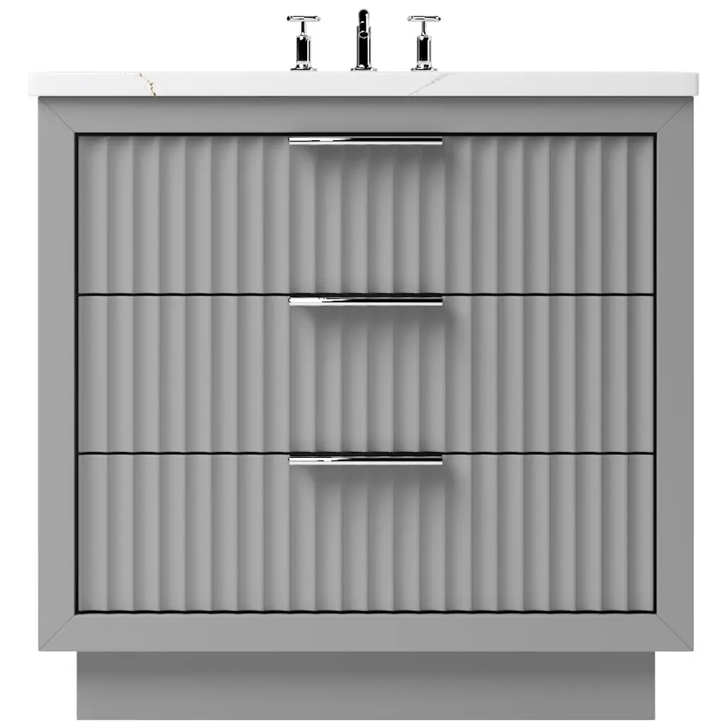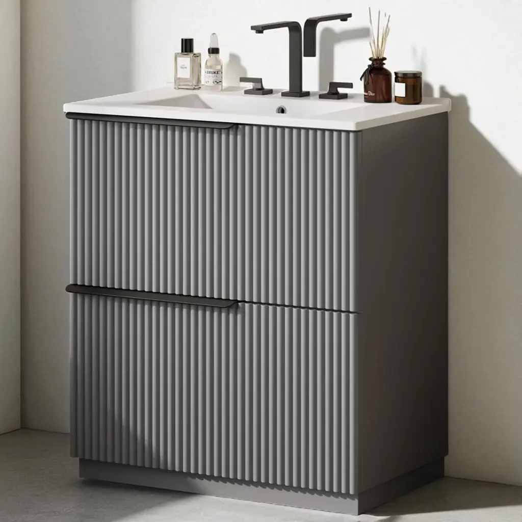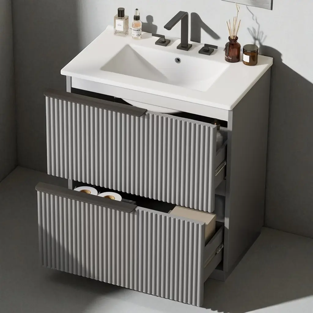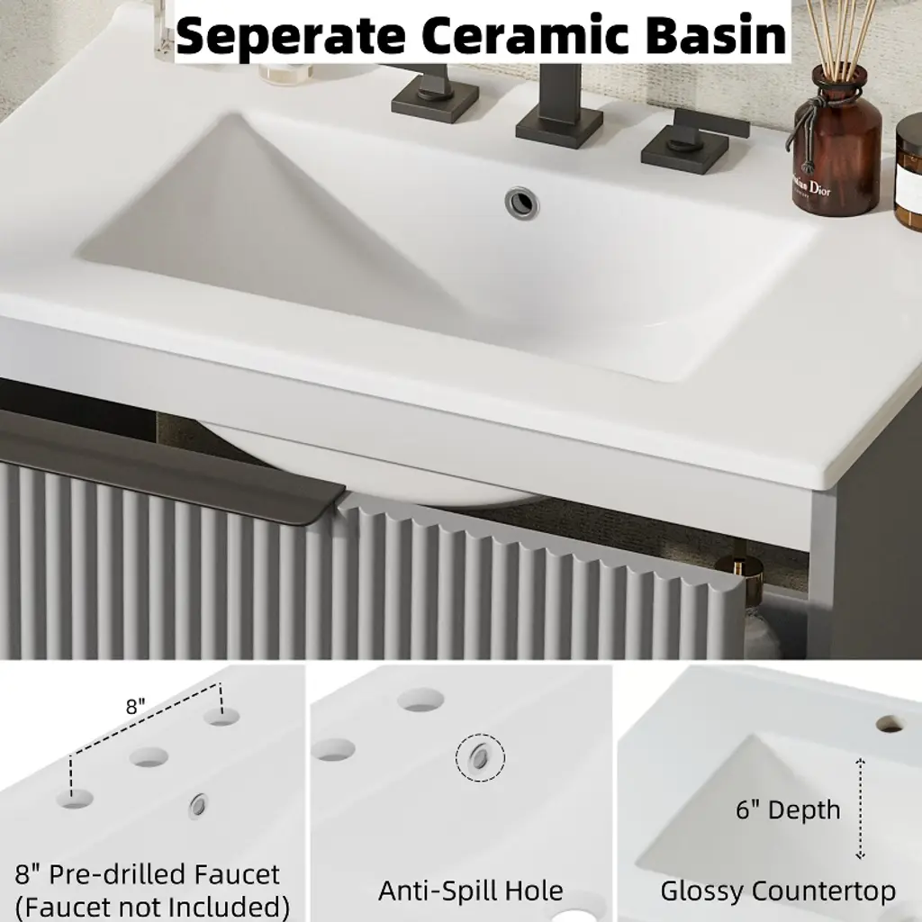 Product OverviewThis 30"" Bathroom Vanity is designed to combine style and functionality, featuring a high-quality ceramic sink basin, soft-close drawers, and an elegant handcrafted fluted design. With intelligent storage solutions like split-drawers and moisture-proof surfaces, this vanity offers ample space to store your bathroom essentials while enhancing your décor. The vanity's glossy countertop and durable design ensure long-lasting performance and ease of maintenance.Product FeaturesHigh-Quality Ceramic Sink Basin: Features a beautifully crafted, bright white ceramic countertop with an integrated sink basin. The non-porous surface resists stains, scratches, and bacterial growth, maintaining its glossy finish for years. The deep basin design prevents water splashing, offering an ideal solution for daily bathroom use.Smart Storage Innovation: The vanity’s dual-tier split-drawer system maximizes storage efficiency, with each large drawer compartment divided into two smaller sections by a central partition panel. This design maintains a seamless exterior while offering organized storage zones for toiletries, towels, and other essentials.Handcrafted Fluted Design: Adds depth and sophistication to your bathroom with vertical grooves that create a striking interplay of light and shadow. This tactile surface naturally resists fingerprints and smudges, keeping it looking refined and neat with minimal upkeep.Optimal Storage Efficiency: Equipped with full-extension drawers that glide smoothly, this vanity maximizes every inch of usable space, ensuring no items are lost in the back and offering easy access to everything you need.Soft-Close Drawer Slides: The soft-close mechanism operates quietly, preventing abrupt slams and allowing for smooth, gentle closures. The drawers accommodate taller toiletry bottles, towels, and other essentials, making the storage space functional and efficient.SpecificationsOverall Dimensions: 30"" L x 18.25"" W x 34"" HWeight Capacity: 120 lbsCabinet Weight: 68.35 lbsCeramic Sink Dimensions: 30"" L x 18.25"" W x 6"" DDrawer Dimensions: 10"" L x 9.25"" W x 6"" HAssembly Required: YesSuitable ScenariosPerfect for modern and traditional bathrooms, including powder rooms and guest bathroomsIdeal for organizing toiletries, cosmetics, and towels in a compact spaceGreat for families looking for practical and stylish storage solutions in the bathroomSuitable for use in high-traffic bathrooms, ensuring both functionality and aesthetic appealNotesAssembly is required; all necessary parts, hardware, and instructions are included.Color and finish may slightly vary due to lighting or monitor display settings.Use an electric drill for easier installation; make sure to position the boards correctly and avoid over-tightening screws.Ensure the vanity is placed on a level surface for optimal stability and alignment.