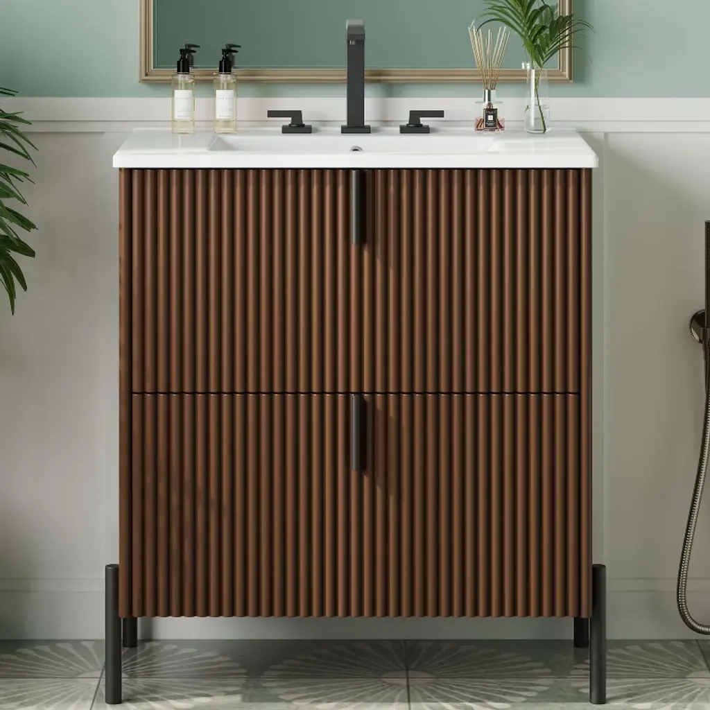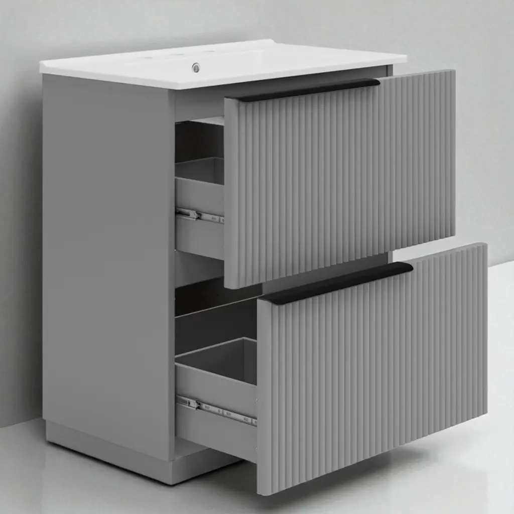 Product OverviewThis 30"" Bathroom Vanity is designed to combine style and functionality, featuring a high-quality ceramic sink basin, soft-close drawers, and an elegant handcrafted fluted design. With intelligent storage solutions like split-drawers and moisture-proof surfaces, this vanity offers ample space to store your bathroom essentials while enhancing your décor. The vanity's glossy countertop and durable design ensure long-lasting performance and ease of maintenance.Product FeaturesHigh-Quality Ceramic Sink Basin: Features a beautifully crafted, bright white ceramic countertop with an integrated sink basin. The non-porous surface resists stains, scratches, and bacterial growth, maintaining its glossy finish for years. The deep basin design prevents water splashing, offering an ideal solution for daily bathroom use.Smart Storage Innovation: The vanity’s dual-tier split-drawer system maximizes storage efficiency, with each large drawer compartment divided into two smaller sections by a central partition panel. This design maintains a seamless exterior while offering organized storage zones for toiletries, towels, and other essentials.Handcrafted Fluted Design: Adds depth and sophistication to your bathroom with vertical grooves that create a striking interplay of light and shadow. This tactile surface naturally resists fingerprints and smudges, keeping it looking refined and neat with minimal upkeep.Optimal Storage Efficiency: Equipped with full-extension drawers that glide smoothly, this vanity maximizes every inch of usable space, ensuring no items are lost in the back and offering easy access to everything you need.Soft-Close Drawer Slides: The soft-close mechanism operates quietly, preventing abrupt slams and allowing for smooth, gentle closures. The drawers accommodate taller toiletry bottles, towels, and other essentials, making the storage space functional and efficient.SpecificationsOverall Dimensions: 30"" L x 18.25"" W x 34"" HWeight Capacity: 120 lbsCabinet Weight: 68.35 lbsCeramic Sink Dimensions: 30"" L x 18.25"" W x 6"" DDrawer Dimensions: 10"" L x 9.25"" W x 6"" HAssembly Required: YesSuitable ScenariosPerfect for modern and traditional bathrooms, including powder rooms and guest bathroomsIdeal for organizing toiletries, cosmetics, and towels in a compact spaceGreat for families looking for practical and stylish storage solutions in the bathroomSuitable for use in high-traffic bathrooms, ensuring both functionality and aesthetic appealNotesAssembly is required; all necessary parts, hardware, and instructions are included.Color and finish may slightly vary due to lighting or monitor display settings.Use an electric drill for easier installation; make sure to position the boards correctly and avoid over-tightening screws.Ensure the vanity is placed on a level surface for optimal stability and alignment.