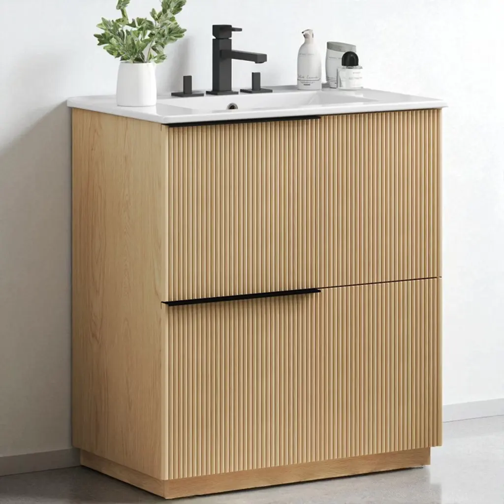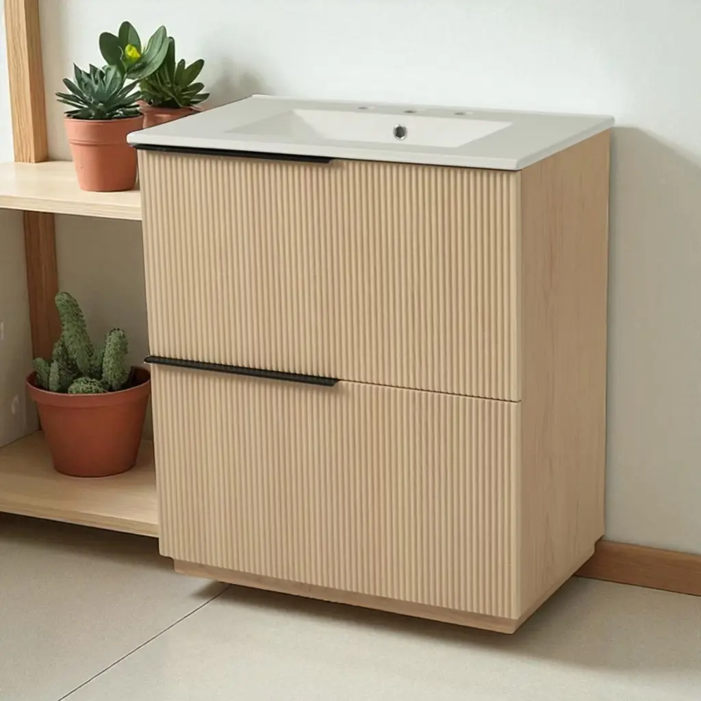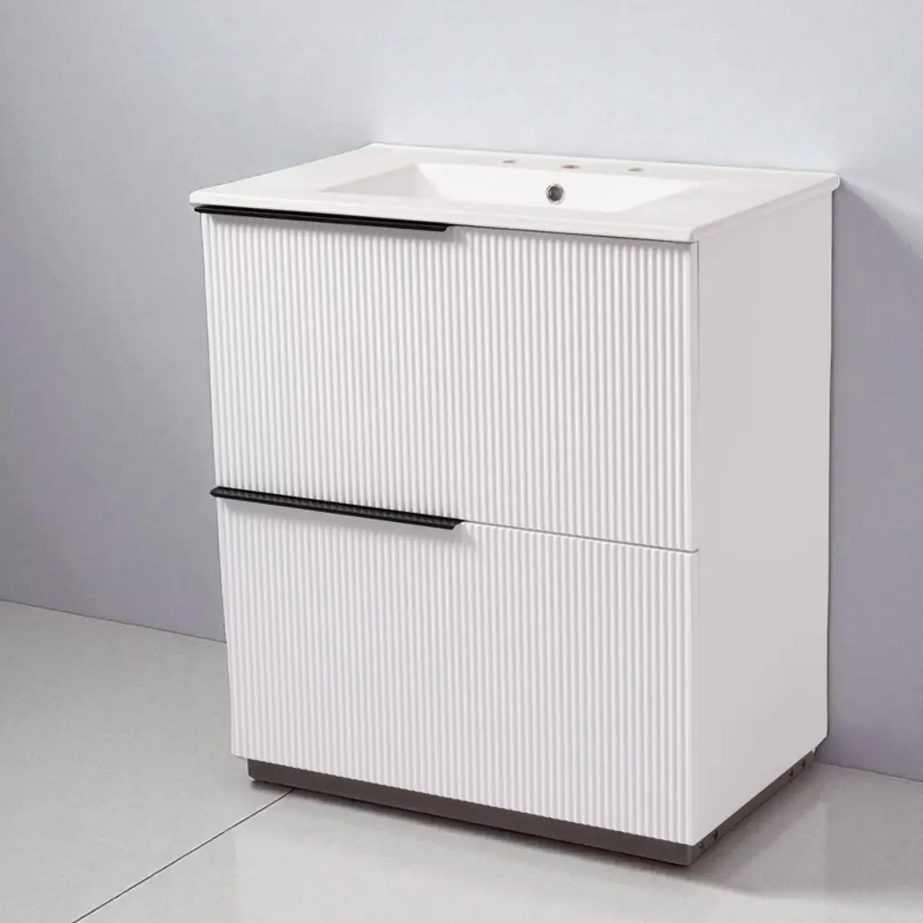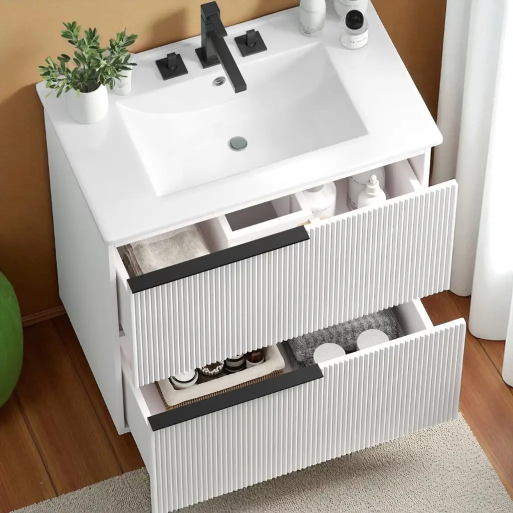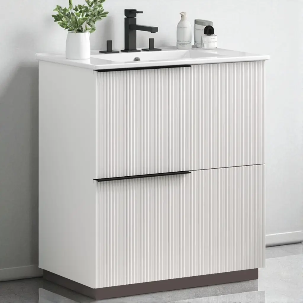 Product OverviewUpgrade your bathroom with this 30"" Vanity featuring a high-quality ceramic sink basin, soft-close undermount drawers, and a beautifully handcrafted fluted design. This modern vanity offers efficient storage with full-extension drawers, ensuring all items are easily accessible. The durable ceramic surface resists stains and scratches, making maintenance a breeze, while the sleek design enhances your bathroom's aesthetic appeal. Perfect for small bathrooms or powder rooms, this vanity combines functionality and style.Product FeaturesHigh-Quality Ceramic Sink Basin: Features a bright white ceramic countertop and integrated sink basin, providing a non-porous, stain-resistant surface that resists scratches and bacterial growth. The deep basin design prevents splashing, while the glossy finish remains beautiful with minimal upkeep.Soft-Close Undermount Drawer Slides: The undermount design hides hardware for a minimalist look, maximizing drawer space by eliminating side-mounted tracks. Full-extension capability ensures you can fully access the contents of the drawer, and the bottom-supported structure prevents sagging.Optimal Storage Efficiency: Smooth full-extension drawers glide effortlessly, revealing every inch of usable space for your toiletries, makeup, or towels. Keep your bathroom essentials organized and easily accessible.Handcrafted Fluted Design: Adds depth and sophistication to any bathroom. The vertical grooves create a striking light and shadow effect, while the tactile surface resists fingerprints and smudges, keeping the vanity looking pristine.SpecificationsAssembled Dimensions: 30"" L x 18"" W x 34"" HChargeable Weight: 103.18 lbsMaterial: Ceramic Sink Basin, MDF with high-quality finishDrawer Type: Full-extension undermount, soft-close mechanismAssembly Required: YesSuitable ScenariosIdeal for modern bathrooms, powder rooms, or guest bathroomsPerfect for storing bathroom essentials like toiletries, towels, and cosmeticsGreat for small bathrooms where space efficiency and storage are a priorityNotesAssembly required; all parts and instructions are included in the package.Color and finish may slightly vary due to lighting or display settings.Ensure the vanity is placed on a level surface for optimal stability.Use care when handling the ceramic basin to prevent any surface damage.
