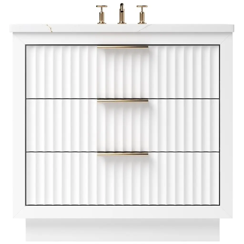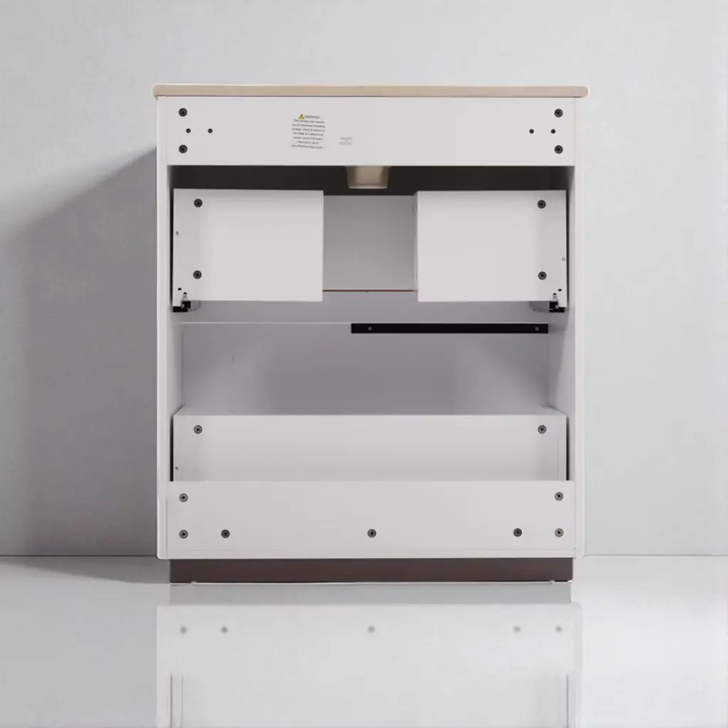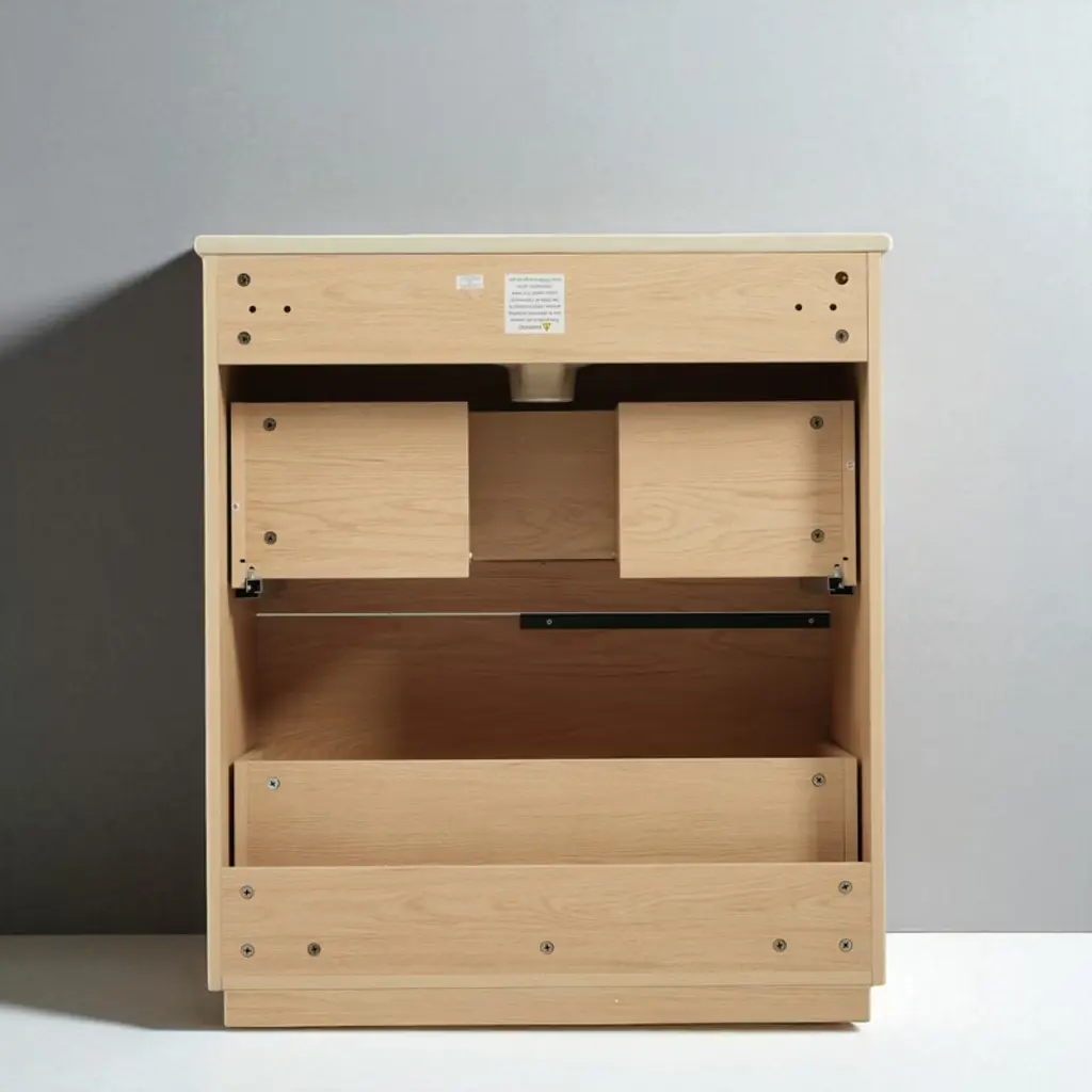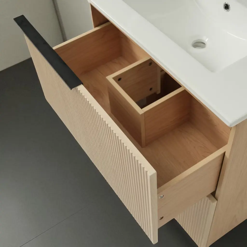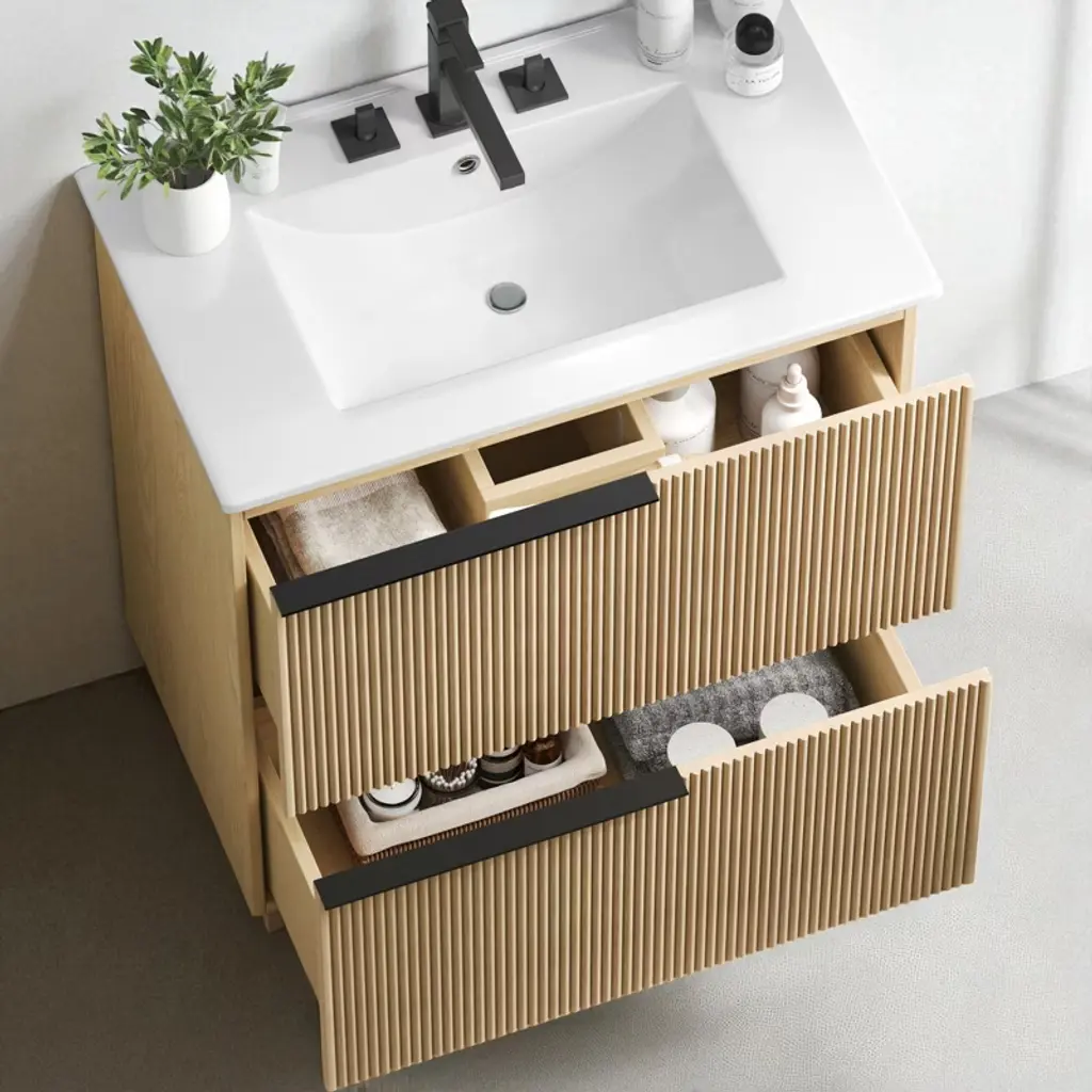 Product OverviewUpgrade your bathroom with this 30"" Vanity featuring a high-quality ceramic sink basin, soft-close undermount drawers, and a beautifully handcrafted fluted design. This modern vanity offers efficient storage with full-extension drawers, ensuring all items are easily accessible. The durable ceramic surface resists stains and scratches, making maintenance a breeze, while the sleek design enhances your bathroom's aesthetic appeal. Perfect for small bathrooms or powder rooms, this vanity combines functionality and style.Product FeaturesHigh-Quality Ceramic Sink Basin: Features a bright white ceramic countertop and integrated sink basin, providing a non-porous, stain-resistant surface that resists scratches and bacterial growth. The deep basin design prevents splashing, while the glossy finish remains beautiful with minimal upkeep.Soft-Close Undermount Drawer Slides: The undermount design hides hardware for a minimalist look, maximizing drawer space by eliminating side-mounted tracks. Full-extension capability ensures you can fully access the contents of the drawer, and the bottom-supported structure prevents sagging.Optimal Storage Efficiency: Smooth full-extension drawers glide effortlessly, revealing every inch of usable space for your toiletries, makeup, or towels. Keep your bathroom essentials organized and easily accessible.Handcrafted Fluted Design: Adds depth and sophistication to any bathroom. The vertical grooves create a striking light and shadow effect, while the tactile surface resists fingerprints and smudges, keeping the vanity looking pristine.SpecificationsAssembled Dimensions: 30"" L x 18"" W x 34"" HChargeable Weight: 103.18 lbsMaterial: Ceramic Sink Basin, MDF with high-quality finishDrawer Type: Full-extension undermount, soft-close mechanismAssembly Required: YesSuitable ScenariosIdeal for modern bathrooms, powder rooms, or guest bathroomsPerfect for storing bathroom essentials like toiletries, towels, and cosmeticsGreat for small bathrooms where space efficiency and storage are a priorityNotesAssembly required; all parts and instructions are included in the package.Color and finish may slightly vary due to lighting or display settings.Ensure the vanity is placed on a level surface for optimal stability.Use care when handling the ceramic basin to prevent any surface damage.