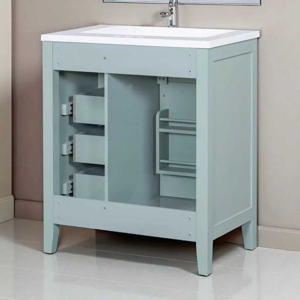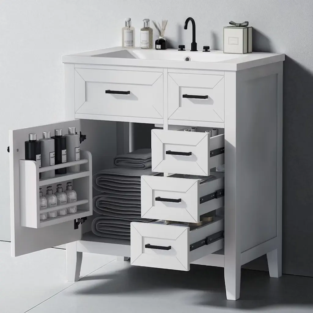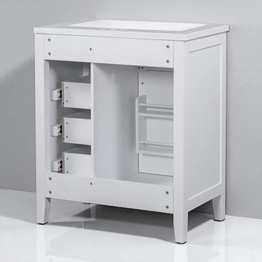 Product Overview:Upgrade your bathroom with this modern 30"" white bathroom vanity set that combines classic design with practical functionality. Crafted from solid rubber wood and durable MDF board, this freestanding vanity features a sleek ceramic sink, ample storage space, and a water-resistant painted finish. With a combination of enclosed storage and accessible shelving, it’s designed to meet the needs of everyday use in style.Product Features:Stylish Modern Design: This 30"" vanity features a clean white finish, decorative groove lines on the door and drawers, and contrasting black handles for a modern yet timeless look that complements any bathroom décor.Solid Wood & MDF Construction: Built with a solid rubber wood frame and MDF panels, this vanity offers excellent stability and long-lasting performance. The painted surface is waterproof, stain-resistant, and easy to clean.Ample Storage: Includes a cabinet with one door, two decorative top drawers, one functional lower drawer with smooth slide rails, and a two-tier storage rack on the door for organizing toiletries, towels, and other bathroom essentials.Smooth Ceramic Sink: The integrated ceramic sink features a waterproof glaze that resists staining and is easy to maintain. It comes pre-drilled for a 4"" centerset faucet (not included) and includes an overflow hole with a metal ring for added safety.Assembly & Packaging: This vanity arrives in two packages and requires assembly. All necessary hardware, including hinges, drawer slides, handles, and an anti-toppling device, is included along with a detailed instruction manual.Specifications:Overall Dimensions: 30"" L x 18"" W x 35.74"" HCabinet Base Dimensions: 29.52"" L x 17.71"" W x 35"" HSink Top Dimensions: 30"" L x 18.03"" W x 6.61"" HMaterial: Solid Rubber Wood + MDF Board + CeramicMounting Type: FreestandingSink Type: Undermount or Drop-In (centered)Number of Doors: 1Number of Drawers: 3 (2 decorative, 1 functional)Faucet Mount: 4"" Centerset (faucet not included)Edge Thickness: 0.98""Weight Capacity: 200 lbsCertification: CARB P2Assembly Required: YesCountry of Origin: VietnamSuitable Scenarios:Perfect for small to medium-sized bathrooms, powder rooms, or guest baths. The compact yet functional design fits seamlessly in both traditional and modern interiors.Notes:Faucet is not included. Product ships in two packages. Color may vary slightly due to lighting and monitor settings. Please assemble according to the provided instructions.