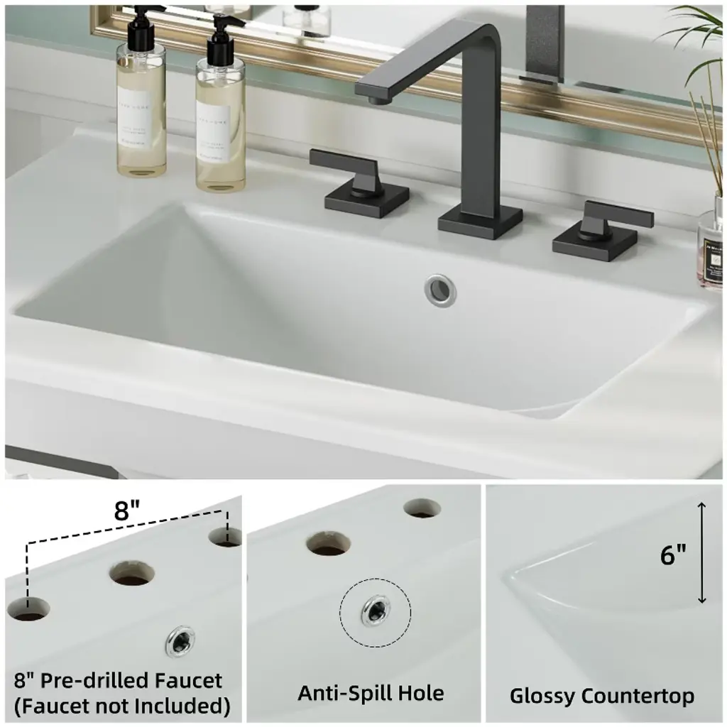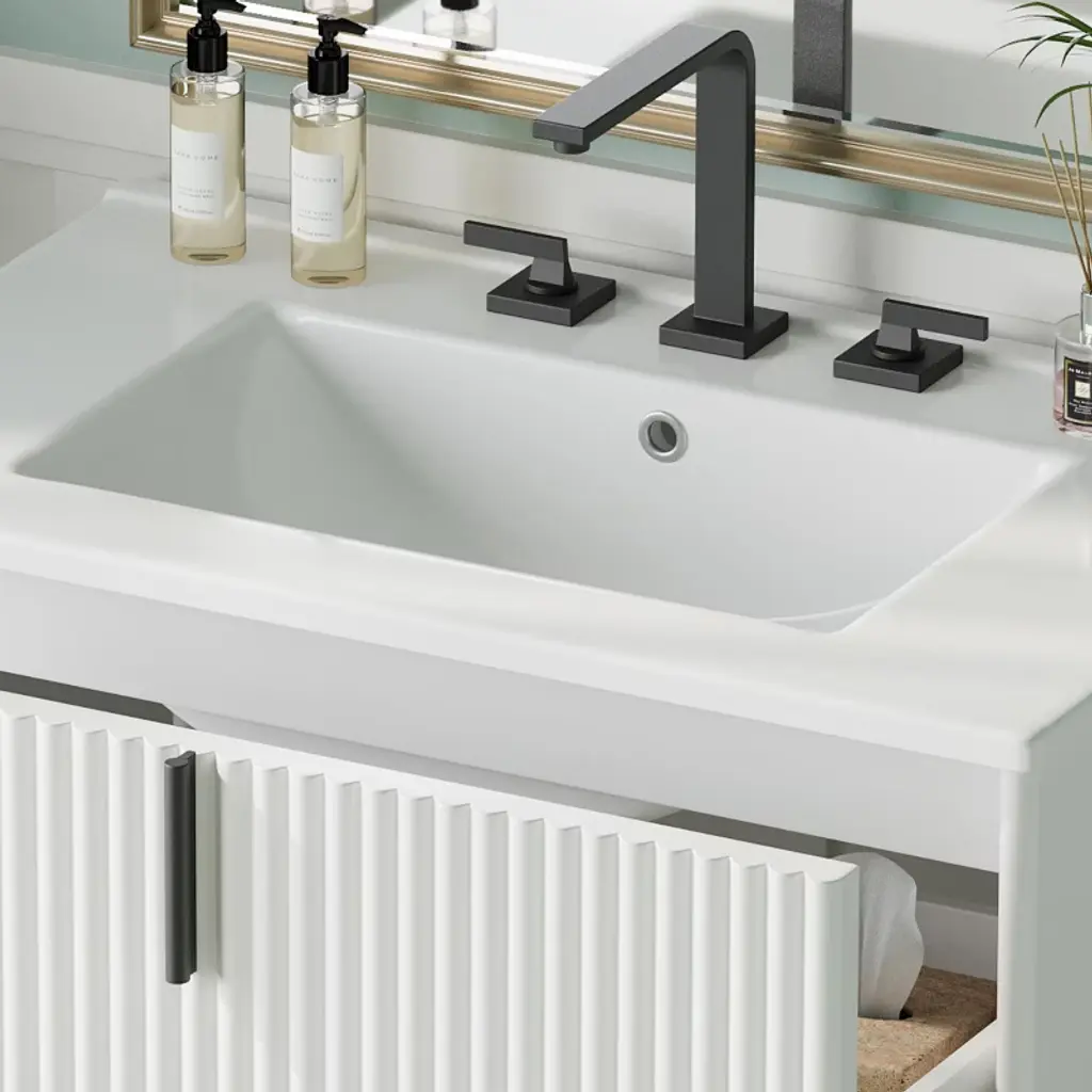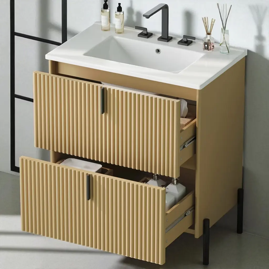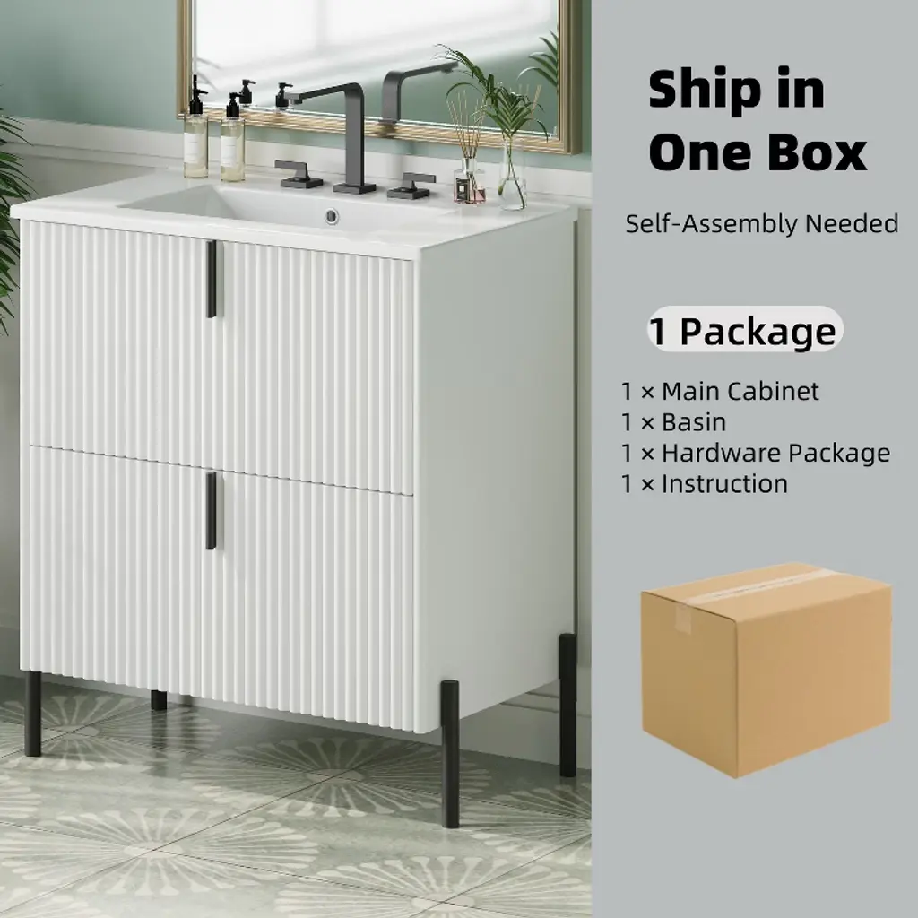 Product Overview:Elevate your bathroom with this 30"" freestanding vanity that blends elegant craftsmanship with smart functionality. Featuring a handcrafted fluted front, a premium ceramic sink, and a dual-tier drawer system with hidden partitions, this vanity is designed to optimize storage while enhancing your space with clean, modern aesthetics.Product Features:Smart Storage Innovation: The dual-tier split-drawer system uses a concealed partition to create two independently functional storage zones while maintaining a seamless external appearance. This design maximizes internal organization for your toiletries, towels, and daily essentials.Soft Close Drawer Slides: Engineered for luxury and convenience, the full-extension drawers glide smoothly and close silently with soft-close hydraulic mechanisms, offering easy access and preventing abrupt slams.High-Quality Ceramic Sink Basin: Crafted from non-porous, stain- and scratch-resistant ceramic, the integrated sink offers a sleek, glossy finish and a 6"" deep basin to prevent splashing while enhancing cleaning ease.Handcrafted Fluted Design: Vertical grooves add visual depth and texture while subtly hiding fingerprints and smudges. The artisan-crafted surface complements a variety of interior aesthetics, from contemporary to transitional.Elegant Fingerpull & Open-Leg Design: The vertical 4.5"" fingerpull adds tactile ease without disrupting the minimalist design, while 8.5"" open legs create visual spaciousness, making it ideal for compact or modern bathrooms.Specifications:Overall Dimensions: 30"" L x 18.25"" W x 34"" HCabinet Dimensions: 29"" L x 18"" W x 33.3"" HSink Dimensions: 30"" L x 18.25"" W x 6"" DDrawer Size: 10"" L x 9.25"" W x 5.75"" HWeight: 93.7 lbs (Cabinet: 62.84 lbs, Sink: 30.86 lbs)Weight Capacity: 120 lbsSuitable Scenarios:This compact yet spacious 30"" vanity is ideal for primary bathrooms, guest bathrooms, or powder rooms. Its fluted facade and smart internal structure make it a perfect solution for both modern homes and sophisticated renovations.Notes:Ships in one box with self-assembly required. Includes cabinet, ceramic sink, hardware, and instructions.Faucet not included. Pre-drilled for standard 8"" widespread faucet installation.Designed with moisture-resistant MDF and waterproof finishes for durability in humid environments.