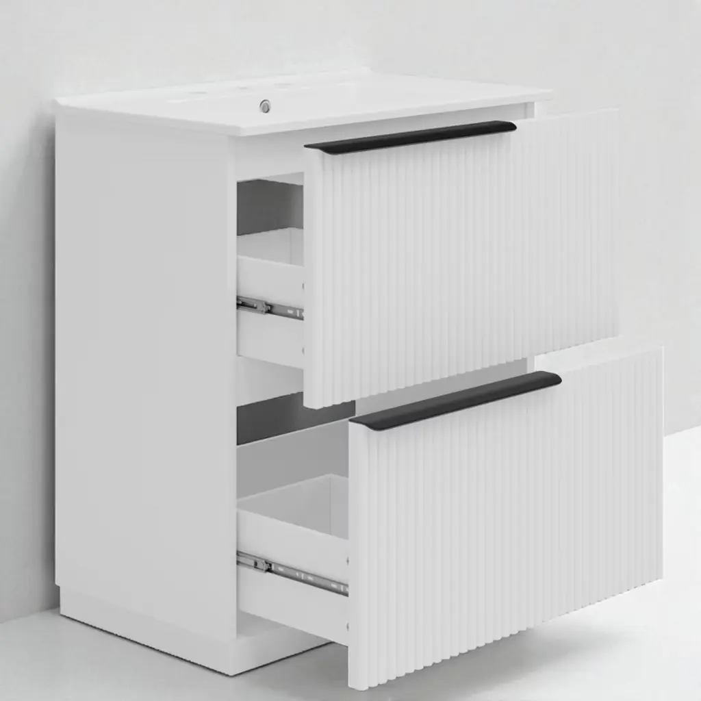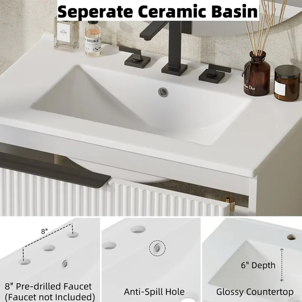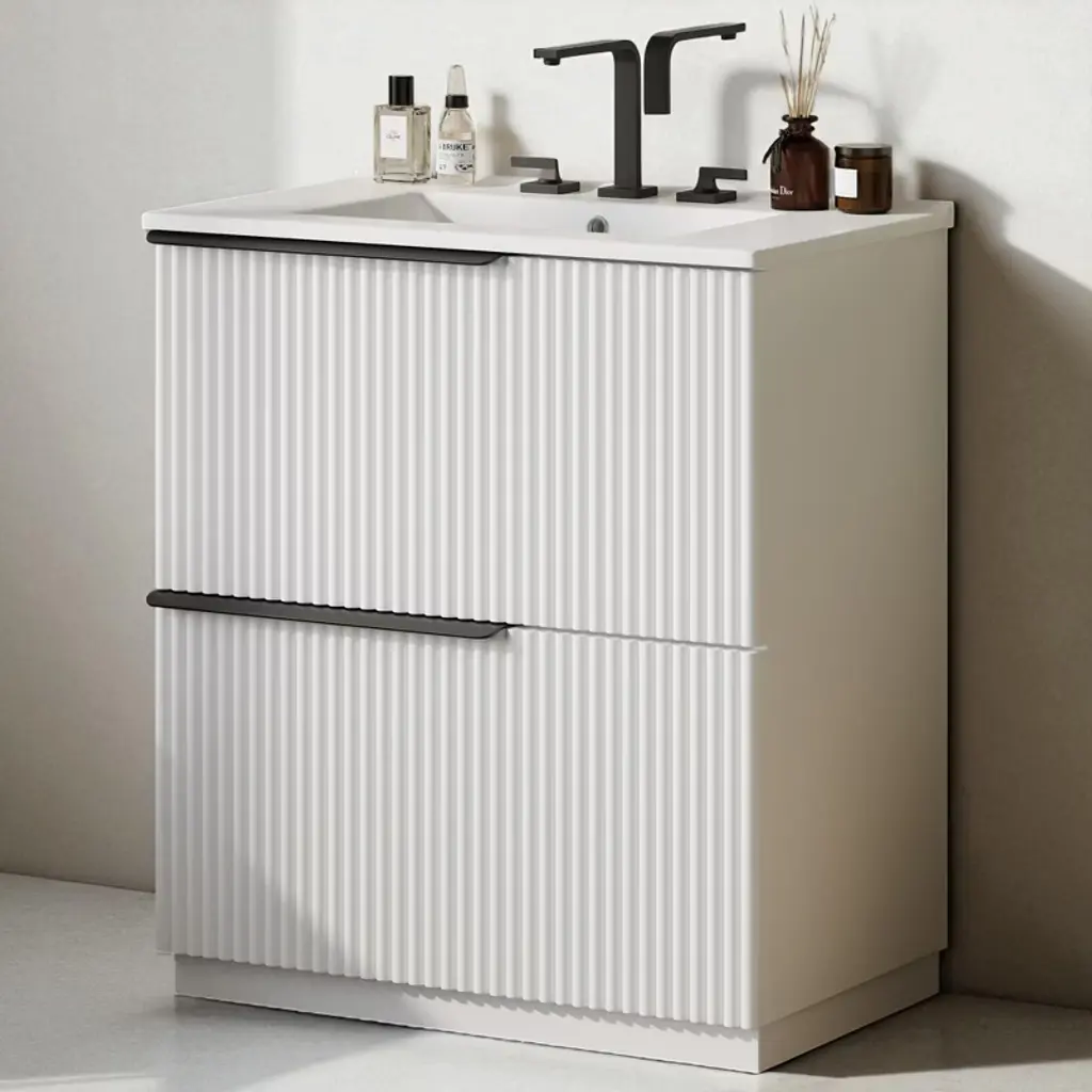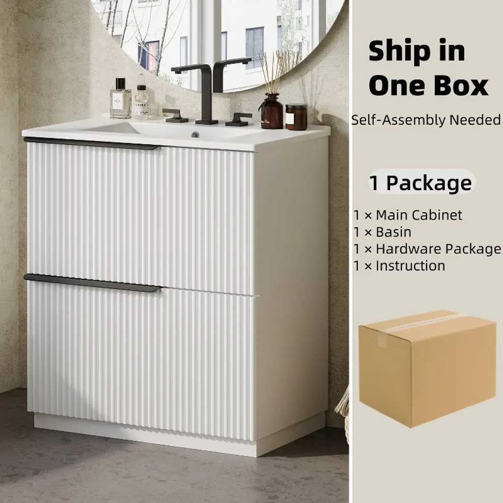 Product Overview:Upgrade your bathroom with this elegant 30"" freestanding vanity, expertly designed to combine intelligent storage, timeless aesthetics, and daily functionality. Featuring a high-gloss ceramic basin, soft-close drawers, and a handcrafted fluted finish, this piece is ideal for modern and transitional spaces alike. Its smart layout includes a dual-tier drawer system with interior partitioning, providing seamless organization without compromising style. With durable moisture-proof construction and an artisan surface texture, this vanity offers both form and function in one sophisticated package.Product Features:High-Quality Ceramic Sink Basin: Includes a bright white ceramic sink with a 6"" deep basin, anti-spill overflow hole, and pre-drilled 8"" widespread faucet compatibility (faucet not included). The non-porous surface is stain-resistant, scratch-resistant, and easy to clean.Smart Storage Innovation: Features a split-drawer system with an interior central partition. The dual-drawer layout provides two layers of efficient storage while maintaining a seamless, unified exterior design for a sleek, modern appearance.Handcrafted Fluted Design: Vertical ridges across the vanity surface enhance the visual texture and create a high-end, designer aesthetic. The grooves naturally resist fingerprints and smudges, making upkeep simple and low maintenance.Soft-Close Drawer Slides: Full-extension, undermount drawers open effortlessly and close silently thanks to integrated soft-close technology. Drawer depth (6"") is ideal for storing tall bottles, toiletries, and folded towels without crowding.Ergonomic 17.5"" Fingerpull: The long beveled drawer edge offers a comfortable, handle-free grip that’s accessible for all users, eliminating the need for traditional knobs or pulls and enhancing the vanity’s minimalist profile.Moisture-Proof Construction: Crafted with a sealed finish and high-grade MDF, this vanity resists warping, peeling, and water damage, making it well-suited to humid bathroom conditions.Specifications:Overall Dimensions: 30"" L x 18.25"" W x 34"" HSink Dimensions: 30"" L x 18.25"" W x 6"" DCabinet Size: 28.4"" L x 17"" W x 33.3"" HDrawer Dimensions: 10"" L x 9.25"" W x 6"" HWeight: Overall – 99.21 lbs; Cabinet – 68.35 lbs; Sink – 30.86 lbsWeight Capacity: 120 lbsMounting Type: FreestandingFaucet Compatibility: 8"" widespread (not included)Assembly: Required; ships in one box with all hardware and instructionsSuitable Scenarios:Perfect for small to medium-sized bathrooms, powder rooms, and guest bathrooms. Its compact footprint, luxurious aesthetic, and highly functional design make it ideal for homeowners, designers, and renovators seeking efficient storage in a stylish package.Notes:Faucet not included.Ships in one box and requires assembly.