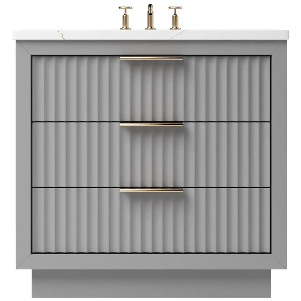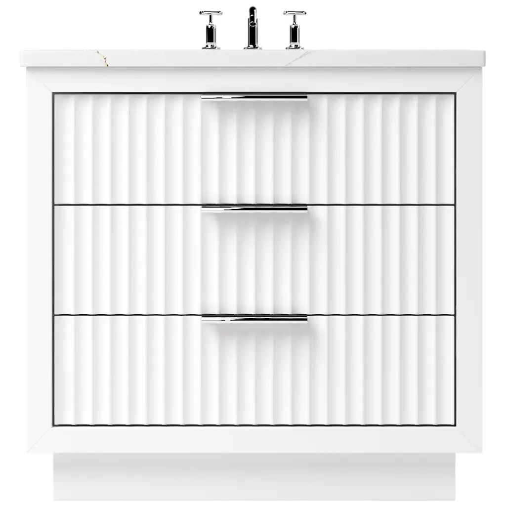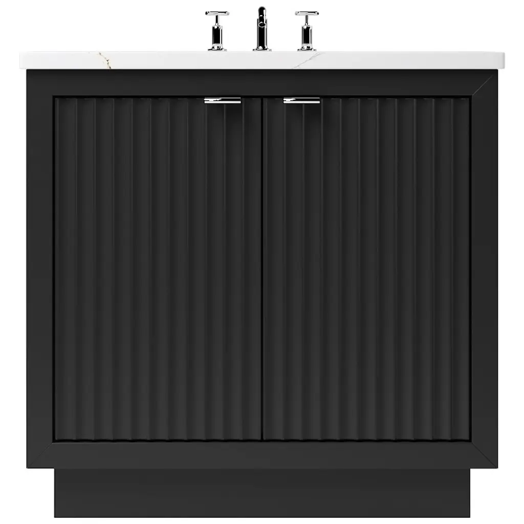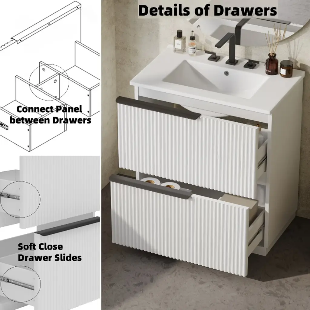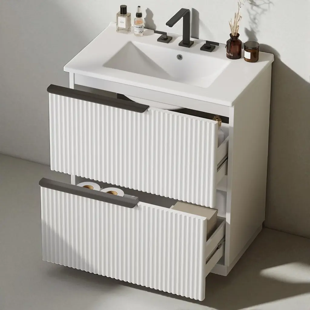 Product Overview:Upgrade your bathroom with this elegant 30"" freestanding vanity, expertly designed to combine intelligent storage, timeless aesthetics, and daily functionality. Featuring a high-gloss ceramic basin, soft-close drawers, and a handcrafted fluted finish, this piece is ideal for modern and transitional spaces alike. Its smart layout includes a dual-tier drawer system with interior partitioning, providing seamless organization without compromising style. With durable moisture-proof construction and an artisan surface texture, this vanity offers both form and function in one sophisticated package.Product Features:High-Quality Ceramic Sink Basin: Includes a bright white ceramic sink with a 6"" deep basin, anti-spill overflow hole, and pre-drilled 8"" widespread faucet compatibility (faucet not included). The non-porous surface is stain-resistant, scratch-resistant, and easy to clean.Smart Storage Innovation: Features a split-drawer system with an interior central partition. The dual-drawer layout provides two layers of efficient storage while maintaining a seamless, unified exterior design for a sleek, modern appearance.Handcrafted Fluted Design: Vertical ridges across the vanity surface enhance the visual texture and create a high-end, designer aesthetic. The grooves naturally resist fingerprints and smudges, making upkeep simple and low maintenance.Soft-Close Drawer Slides: Full-extension, undermount drawers open effortlessly and close silently thanks to integrated soft-close technology. Drawer depth (6"") is ideal for storing tall bottles, toiletries, and folded towels without crowding.Ergonomic 17.5"" Fingerpull: The long beveled drawer edge offers a comfortable, handle-free grip that’s accessible for all users, eliminating the need for traditional knobs or pulls and enhancing the vanity’s minimalist profile.Moisture-Proof Construction: Crafted with a sealed finish and high-grade MDF, this vanity resists warping, peeling, and water damage, making it well-suited to humid bathroom conditions.Specifications:Overall Dimensions: 30"" L x 18.25"" W x 34"" HSink Dimensions: 30"" L x 18.25"" W x 6"" DCabinet Size: 28.4"" L x 17"" W x 33.3"" HDrawer Dimensions: 10"" L x 9.25"" W x 6"" HWeight: Overall – 99.21 lbs; Cabinet – 68.35 lbs; Sink – 30.86 lbsWeight Capacity: 120 lbsMounting Type: FreestandingFaucet Compatibility: 8"" widespread (not included)Assembly: Required; ships in one box with all hardware and instructionsSuitable Scenarios:Perfect for small to medium-sized bathrooms, powder rooms, and guest bathrooms. Its compact footprint, luxurious aesthetic, and highly functional design make it ideal for homeowners, designers, and renovators seeking efficient storage in a stylish package.Notes:Faucet not included.Ships in one box and requires assembly.