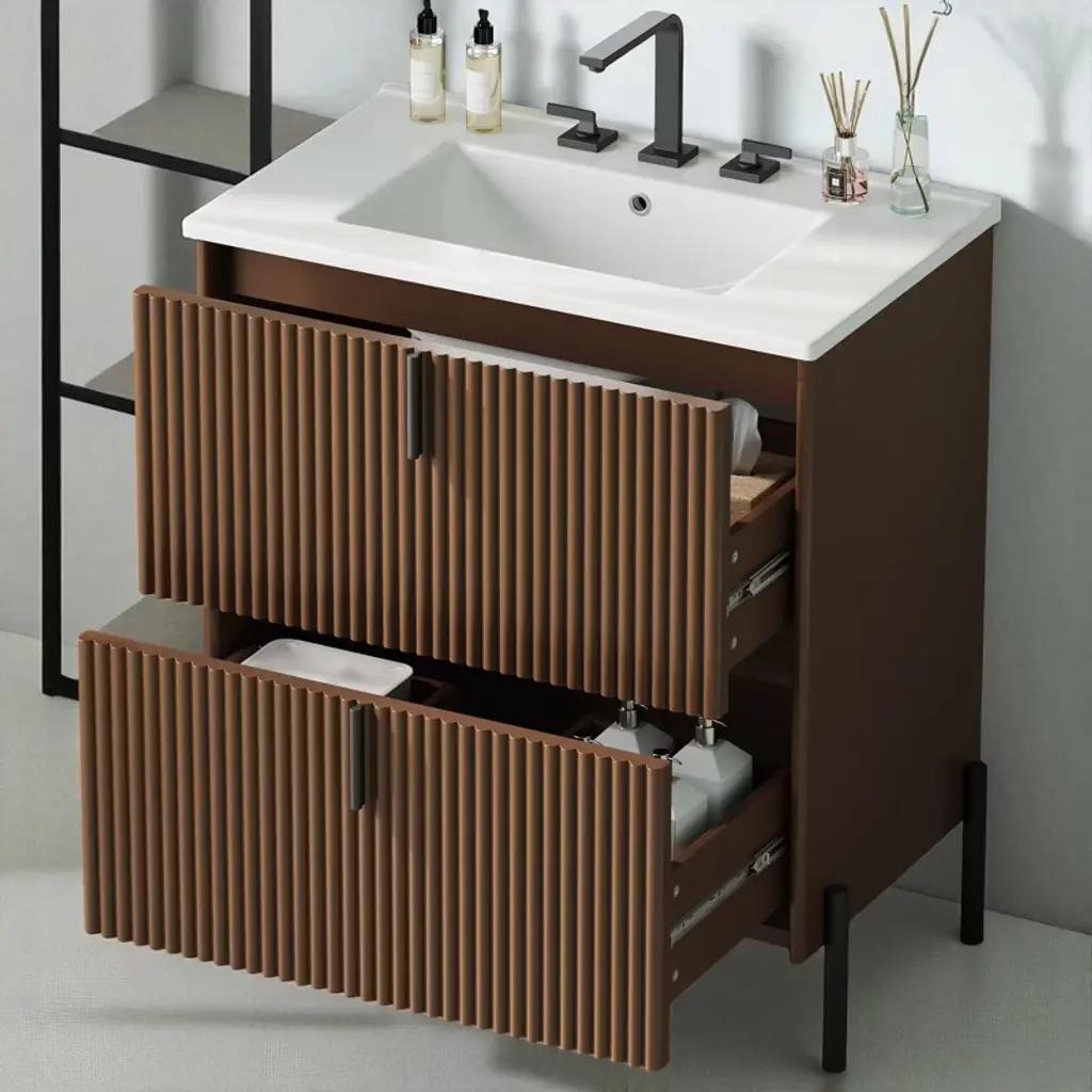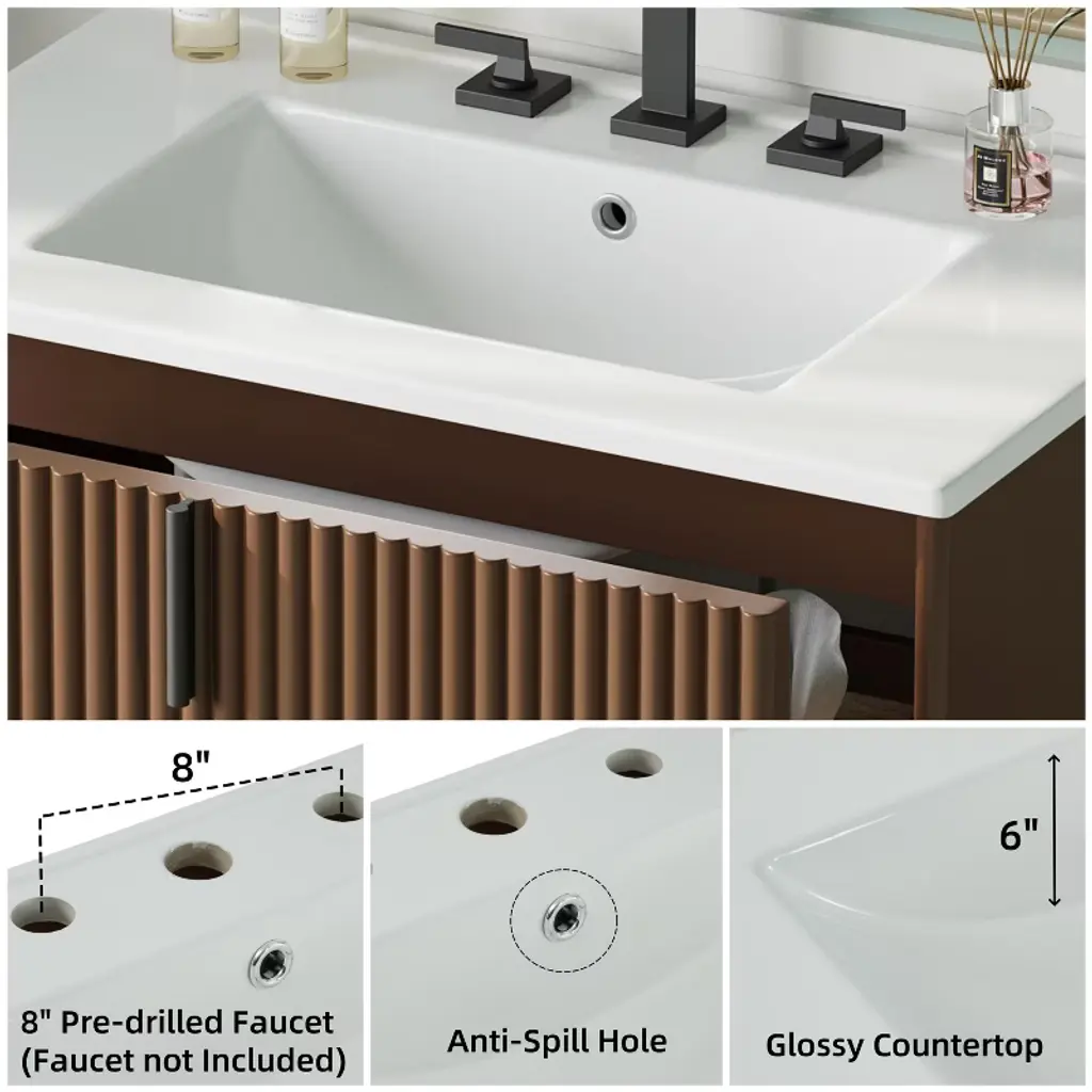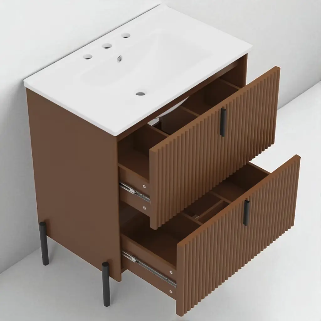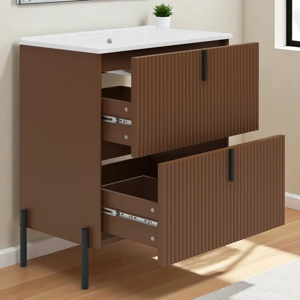 Product OverviewThis 30"" freestanding bathroom vanity combines functionality and elegance, featuring a high-quality ceramic sink, smart storage solutions, and a handcrafted fluted design. With soft-close drawer slides and an open, airy aesthetic provided by 8.5"" legs, this vanity is perfect for modern bathrooms. It offers optimal storage efficiency with full-extension drawers and an integrated ceramic sink that’s easy to clean and maintain. Its timeless design and attention to detail make it an ideal addition to both contemporary and vintage-inspired bathrooms.Product FeaturesSmart Storage Innovation: This intelligently designed vanity features a dual-tier split-drawer system, which allows each large drawer compartment to seamlessly divide into two smaller, independently functional sections. The central partition panel enhances organization while maintaining a unified exterior appearance.Soft Close Drawer Slides: Enjoy the smooth, whisper-quiet operation of the soft-close mechanism, which prevents abrupt slams and ensures the drawers close gently. The 6"" depth of the drawers accommodates tall toiletry bottles, towels, and everyday essentials with ease.High-Quality Ceramic Sink Basin: Crafted from bright white ceramic, this sink resists stains, scratches, and bacterial growth while maintaining its glossy finish for years. The non-porous surface ensures easy cleaning, and the deep basin design helps prevent water splashes.Handcrafted Fluted Design: The vertical grooves add a touch of sophistication, creating a striking play of light and shadow while offering a tactile surface that naturally resists fingerprints and smudges. This design adds elegance with minimal upkeep required.Optimal Storage Efficiency: The vanity includes full-extension drawers that glide effortlessly to reveal every inch of storage space, ensuring that no item gets lost at the back of the drawer.Modern Aesthetic with 8.5"" Legs: The elevated design of the 8.5"" legs creates visual spaciousness, making the bathroom feel more open and less cramped, particularly in smaller spaces. It’s a design choice that adds a modern touch to your bathroom decor.SpecificationsOverall Dimensions: 30"" L x 18.25"" W x 34"" HCeramic Sink Dimensions: 30"" L x 18.25"" W x 6"" DCabinet Dimensions: 29"" L x 18"" W x 33.3"" HDrawer Dimensions: 10"" L x 9.25"" W x 5.75"" HTip-Out Tray Dimensions: 31.9"" L x 3.74"" W x 1.97"" HWeight of Overall Vanity: 93.7 lbsWeight of Cabinet: 62.84 lbsWeight of Ceramic Sink: 30.86 lbsWeight Capacity: 120 lbsAssembly: Required (Hardware and Instructions Included)Suitable ScenariosPerfect for modern bathrooms, powder rooms, or guest bathroomsIdeal for smaller spaces that require a balance of form and functionGreat for anyone looking for a bathroom vanity with efficient storage, a sleek design, and easy maintenanceNotesFaucet and drain not includedItems may differ slightly from the image due to lighting or display settings