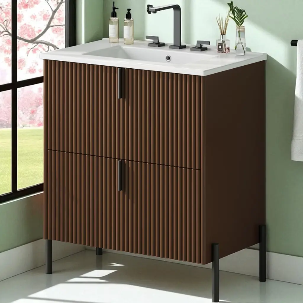 30" Freestanding Bathroom Vanity With Ceramic Sink, Smart Storage, Soft Close Drawers, Handcrafted Fluted Design, And 8.5" Legs