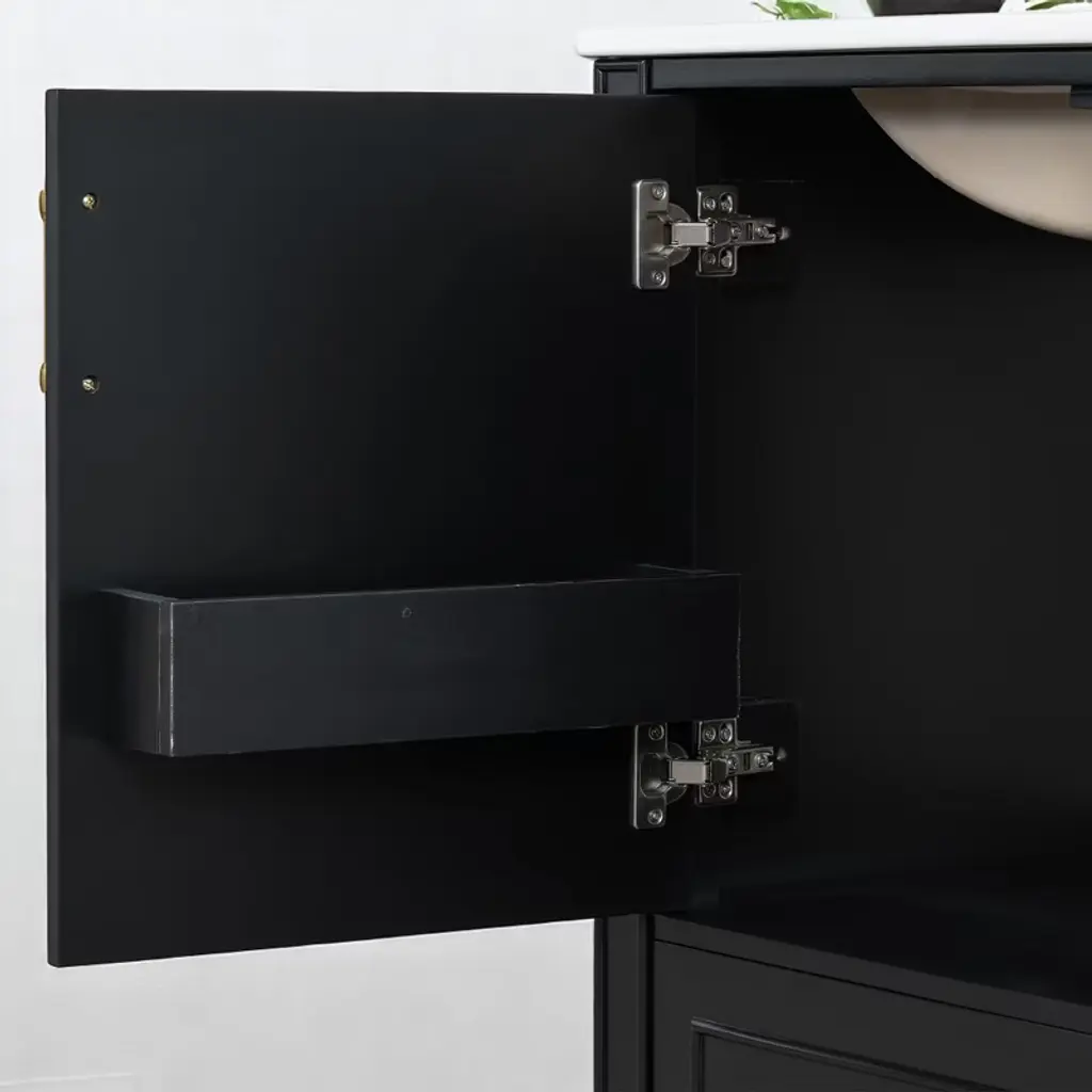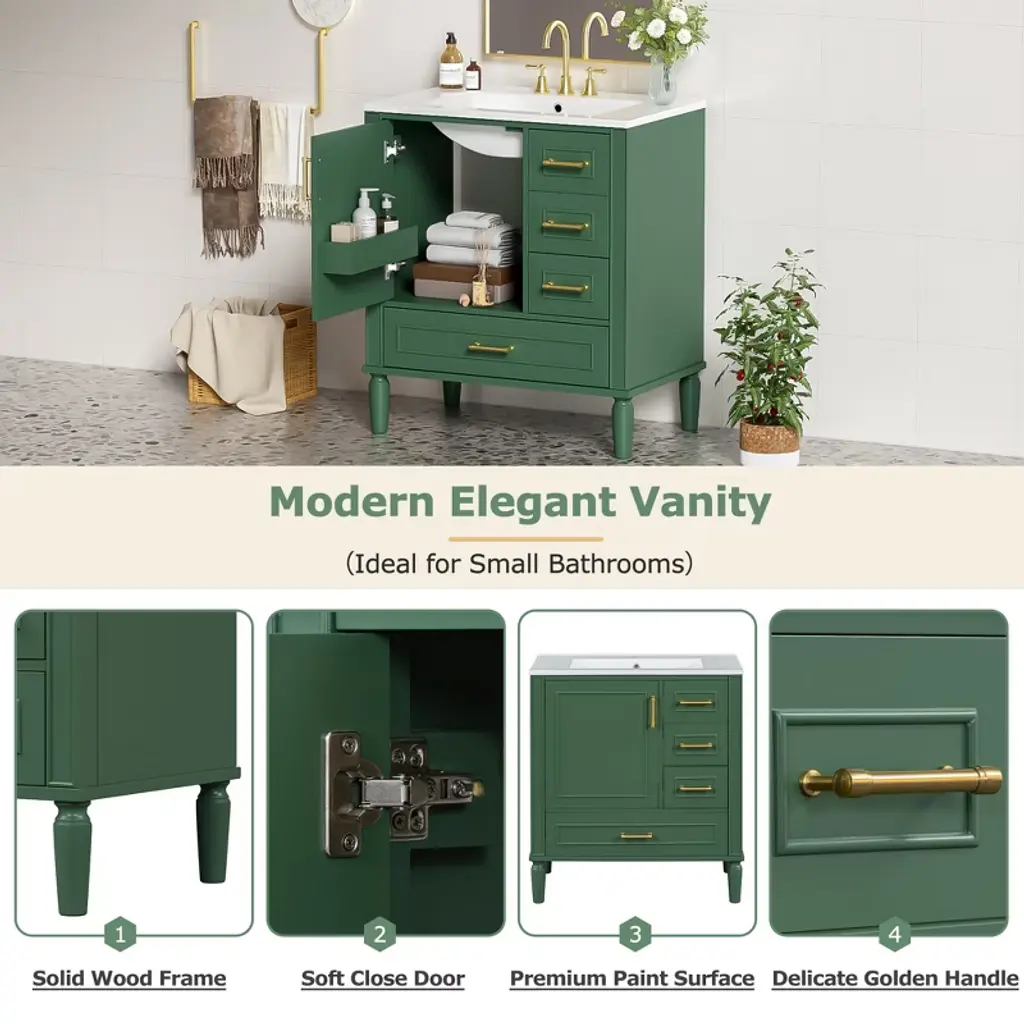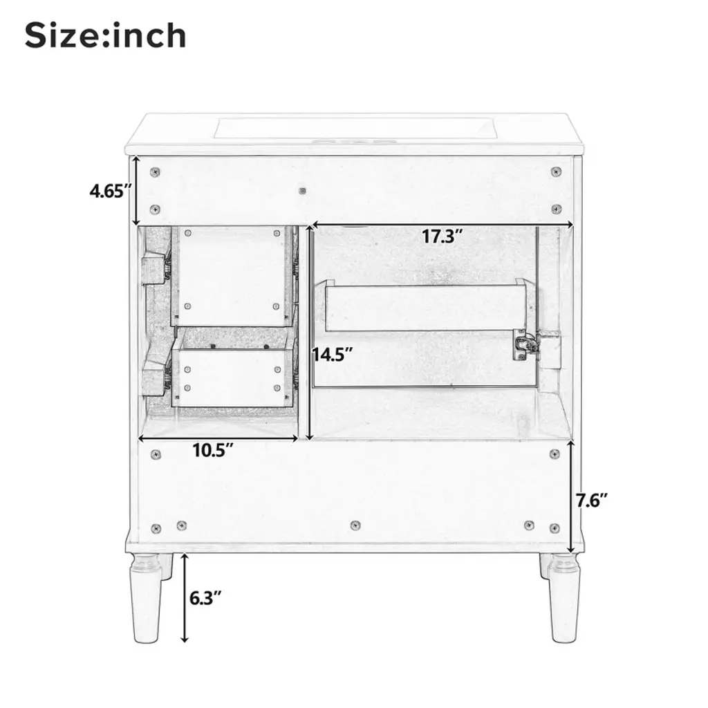 Product Introduction Enhance your bathroom with the timeless charm and practical functionality of the Mshliw 30" Traditional Bathroom Vanity. Designed for compact spaces, this freestanding vanity blends traditional aesthetics with modern features like soft-close doors and drawers, making it a stylish and convenient choice for any small bathroom. Product Features - Space-Saving Design: Perfectly sized at 30" wide to optimize storage and functionality in smaller bathrooms. - Durable Ceramic Sink: The high-quality rectangular ceramic basin is easy to clean and features a built-in overflow to prevent spills. - Solid Wood & MDF Construction: The frame is made of durable solid wood, while the panels are crafted from premium MDF for long-lasting strength. - Ample Storage: Three drawers and one soft-close cabinet door provide organized space for bathroom essentials like toiletries and towels. - Elegant Gold Hardware: Long gold zinc alloy handles elevate the look with a subtle luxury touch. - Soft-Close Hinges: Enjoy quiet operation and prolonged durability with built-in soft-close door mechanisms. - Traditional Styling: Classic lines and a painted finish complement traditional or transitional interiors beautifully. - Assembly Made Easy: Ships with clear instructions and necessary hardware for a smooth assembly process. Two-person setup recommended. Specifications Overall Dimensions: 30"W x 18.3"D x 34"H Sink Dimensions: 30"W x 18.3"D x 6.7"H (31.75 lbs) Cabinet Dimensions: 29.5"W x 18"D x 33"H (68.25 lbs) Product Weight: 100 lbs Weight Capacity: Drawers - 20 lbs each; Overall - 150 lbs Style: Traditional Mounting Type: Freestanding Sink Material: Ceramic Cabinet Material: Solid Wood Feet + MDF Handle Material: Zinc Alloy Finish Type: Painted Sink Type: Undermount / Drop-in Sink Shape: Rectangular Faucet Mount: 4" Centerset (faucet not included) Overflow Hole: Included Top Edge Type: Flat Top Edge Thickness: 0.6" Number of Doors: 1 Soft Close Hinges: Yes Assembly Required: Yes Note Product measurements are approximate and may vary slightly due to manual measurement. Actual product color may differ slightly due to lighting and screen settings.